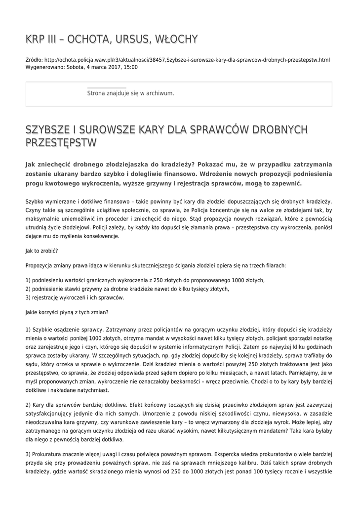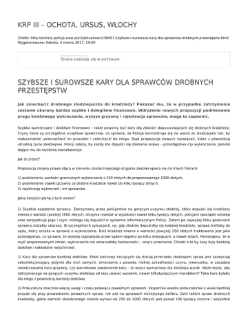 KRP III – OCHOTA, URSUS, WŁOCHY Źródło: http://ochota.policja.waw.pl/r3/aktualnosci/38457,Szybsze-i-surowsze-kary-dla-sprawcow-drobnych-przestepstw.html Wygenerowano: Sobota, 4 marca 2017, 15:00 Strona znajduje się w archiwum. SZYBSZE I SUROWSZE KARY DLA SPRAWCÓW DROBNYCH PRZESTĘPSTW Jak zniechęcić drobnego złodziejaszka do kradzieży? Pokazać mu, że w przypadku zatrzymania zostanie ukarany bardzo szybko i dolegliwie finansowo. Wdrożenie nowych propozycji podniesienia progu kwotowego wykroczenia, wyższe grzywny i rejestracja sprawców, mogą to zapewnić. Szybko wymierzane i dotkliwe finansowo – takie powinny być kary dla złodziei dopuszczających się drobnych kradzieży. Czyny takie są szczególnie uciążliwe społecznie, co sprawia, że Policja koncentruje się na walce ze złodziejami tak, by maksymalnie uniemożliwić im proceder i zniechęcić do niego. Stąd propozycja nowych rozwiązań, które z pewnością utrudnią życie złodziejowi. Policji zależy, by każdy kto dopuści się złamania prawa – przestępstwa czy wykroczenia, poniósł dające mu do myślenia konsekwencje. Jak to zrobić? Propozycja zmiany prawa idąca w kierunku skuteczniejszego ścigania złodziei opiera się na trzech filarach: 1) podniesieniu wartości granicznych wykroczenia z 250 złotych do proponowanego 1000 złotych, 2) podniesienie stawki grzywny za drobne kradzieże nawet do kilku tysięcy złotych, 3) rejestrację wykroczeń i ich sprawców. Jakie korzyści płyną z tych zmian? 1) Szybkie osądzenie sprawcy. Zatrzymany przez policjantów na gorącym uczynku złodziej, który dopuści się kradzieży mienia o wartości poniżej 1000 złotych, otrzyma mandat w wysokości nawet kilku tysięcy złotych, policjant sporządzi notatkę oraz zarejestruje jego i czyn, którego się dopuścił w systemie informatycznym Policji. Zatem po najwyżej kliku godzinach sprawca zostałby ukarany. W szczególnych sytuacjach, np. gdy złodziej dopuściłby się kolejnej kradzieży, sprawa trafiłaby do sądu, który orzeka w sprawie o wykroczenie. Dziś kradzież mienia o wartości powyżej 250 złotych traktowana jest jako przestępstwo, co sprawia, że złodziej odpowiada przed sądem dopiero po kilku miesiącach, a nawet latach. Pamiętajmy, że w myśl proponowanych zmian, wykroczenie nie oznaczałoby bezkarności – wręcz przeciwnie. Chodzi o to by kary były bardziej dotkliwe i nakładane natychmiast. 2) Kary dla sprawców bardziej dotkliwe. Efekt końcowy toczących się dzisiaj przeciwko złodziejom spraw jest zazwyczaj satysfakcjonujący jedynie dla nich samych. Umorzenie z powodu niskiej szkodliwości czynu, niewysoka, w zasadzie nieodczuwalna kara grzywny, czy warunkowe zawieszenie kary – to wręcz wymarzony dla złodzieja wyrok. Może lepiej, aby zatrzymanego na gorącym uczynku złodzieja od razu ukarać wysokim, nawet kilkutysięcznym mandatem? Taka kara byłaby dla niego z pewnością bardziej dotkliwa. 3) Prokuratura znacznie więcej uwagi i czasu poświęca poważnym sprawom. Ekspercka wiedza prokuratorów o wiele bardziej przyda się przy prowadzeniu poważnych spraw, nie zaś na sprawach mniejszego kalibru. Dziś takich spraw drobnych kradzieży, gdzie wartość skradzionego mienia wynosi od 250 do 1000 złotych jest ponad 100 tysięcy rocznie i wszystkie przechodzą przez prokuraturę. Pytanie, czy takie rozwiązanie jest dobre? Policja poradzi sobie z wykroczeniami wiedząc, że przy sprawach rozbojów, bójek czy zabójstw może liczyć na większe zaangażowanie prokuratury. 4) Rejestracja wykroczeń. Rejestrowanie wykroczeń i ich sprawców da policjantom wiedzę na temat zatrzymanego. Przy sprawdzaniu złodzieja, szybko okazałoby się, czy to jego pierwsza kradzież, czy może łamie on prawo notorycznie i sprawę należy skierować do sądu, który orzeka w sprawie o wykroczenie. Liczba wypełnianych druków jest o wiele mniejsza niż w dochodzeniach, a i czas osądu znacznie krótszy. Należy przy tym pamiętać, że sprawcy drobnych kradzieży będą nadal ścigani. 5) Sprawcy wykroczeń nie pozostaną bezkarni. Policja to ta instytucja, która jest najbardziej zainteresowana zatrzymywaniem osób w jakikolwiek sposób łamiących prawo – bez względu na to, czy chodzi tu o sprawców wykroczeń czy przestępstw. Omawiając temat podniesienia progu kwotowego, rozgraniczającego wykroczenie i przestępstwo, warto również zauważyć, jak bardzo na przestrzeni ostatnich kilkunastu lat zmieniała się sytuacja społeczno-ekonomiczna w Polsce. Minimalne wynagrodzenie miesięczne wzrosło trzykrotnie (w 1999 roku minimalne wynagrodzenie wynosiło 500 złotych brutto, a od stycznia 2012 roku wynosi 1500 złotych brutto), podobnie jak przeciętne wynagrodzenie miesięczne (w 1998 wyniosło 1 239,49 złotych brutto, natomiast w styczniu 2012 r. wyniosło 3 666,41 złotych brutto). Podniesienia progu kwotowego, rozgraniczającego wykroczenie i przestępstwo, z 250 do 1000 złotych jest więc próbą dostosowania prawa do aktualnej wartości pieniądza. Należy również zwrócić uwagę na koszty postępowań, które prowadzone są w sprawach dotyczących przestępstw. Dziś niejednokrotnie czynności, które trzeba wykonać w toku postępowania generują bardzo wysokie koszty. W celu udowodnienia złodziejowi kradzieży telefonu o wartości np. 300 złotych, zostaje on aresztowany, sporządzane są protokoły, należy wykonać oględziny, przesłuchać świadków, powołać biegłych, dokonać rejestracji w KSIP i zrobić odbitki linii papilarnych. Dopiero po wykonaniu tych wszystkich czynności, do pracy przystępuje prokurator i sąd. Koszt takiego postępowania może wynieść nawet kilka tysięcy złotych. A jaka jest kara dla złodzieja? Zazwyczaj kara jest umarzana, sąd zawiesza jej wykonanie lub też nakazuje zapłatę wcale niewysokiej grzywny. Proponowane zmiany służyłyby z pewnością skróceniu procedury i uproszczeniu jej, przy bardziej dotkliwym efe