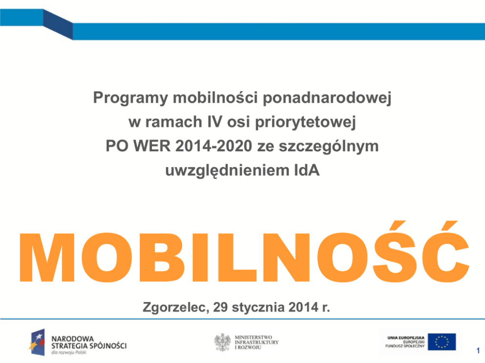Programy mobilności ponadnarodowej w ramach IV osi priorytetowej PO WER 2014-2020 ze szczególnym uwzględnieniem IdA Zgorzelec, 29 stycznia 2014 r. 1 Plan prezentacji • Europejski Fundusz Społeczny w Polsce po 2014 roku klika słów wstępu • Program Operacyjny Wiedza Edukacja Rozwój 20142020 (PO WER) – zakres programu • Planowane programy mobilności ponadnarodowej w ramach PO WER • Szerzej na temat programów opartych na doświadczeniach wynikających z IdA 2 EFS w Polsce po 2014 roku – główne założenia 1 PO krajowy 32% alokacji EFS = 4 166,8 mln EUR Wsparcie reform, struktur, systemów Osoby młode, więźniowie, Romowie Innowacje i ponadnarodowość 16 PO regionalnych 68% alokacji EFS = 8 675,4 mln EUR Wsparcie osób i indywidualnych odbiorców Wielofunduszowość (EFS + EFRR) Monofunduszowość (EFS) 3 PO WER – zakres wsparcia STRUKTURA OSI PRIORYTETOWYCH: • Oś I Osoby młode na rynku pracy • Oś II Efektywne polityki publiczne dla rynku pracy, gospodarki i edukacji • Oś III Szkolnictwo wyższe dla gospodarki i rozwoju • Oś IV Innowacje społeczne i współpraca ponadnarodowa 4 Programy mobilności ponadnarodowej – przyjęte schematy OŚ IV PO WER – Innowacje społeczne i współpraca ponadnarodowa Opcja I: Innowacje społeczne Opcja II: Programy mobilności ponadnarodowej Opcja III: Współpraca ponadnarodowa Uzupełnienie Programu Erasmus+ Osoby młode zagrożone wykluczeniem społecznym (niemiecka sieć) Inne 5 Programy mobilności ponadnarodowej – logika interwencji Cel Produkt / rezultat Efekt • Wzmocnienie potencjału rozwojowego osób i instytucji z wykorzystaniem programów mobilności ponadnarodowej • Liczba osób objętych wsparciem w ramach programów mobilności ponadnarodowej – ok. 117 992 • Liczba osób, które nabyły kompetencje zawodowe lub kluczowe po opuszczeniu programu – ok. 106 193 • Nabycie kompetencji i umiejętności przez osoby objęte programami mobilności ponadnarodowej 6 Schemat I – uzupełnienie Programu Erasmus+ Liczba osób planowanych do objęcia wsparciem - 98 630 (do dalszej weryfikacji) • Działania realizowane na zasadach Programu Erasmus+ • Rozważany zakres wsparcia: Wymiana studentów – wsparcie EFS dla osób kwalifikujących się do otrzymania stypendium socjalnego i studentów niepełnosprawnych Staże / praktyki dla uczniów szkół zawodowych oraz wsparcie kadr Wsparcie programów mobilności kadr oświaty Programy mobilności dorosłych / młodzieży • Planowany harmonogram rozpoczęcia działań – w pierwszej kolejności wsparcie adresowane do studentów • Najistotniejszy kwotowo schemat programów mobilności • Orientacyjny budżet: ok. 263 mln EUR (76,5% środków na programy mobilności) 7 Schemat III – inne planowane programy mobilności Liczba osób planowanych do objęcia wsparciem – 13 430 (do ponownej weryfikacji po ustaleniu w szczególności zakresu programów stypendialnych dla osób mających wpływ na kształt polityk publicznych) • Działania stanowiące uzupełnienie programów mobilności Erasmus+ i młodych osób bezrobotnych • Dokładny zakres możliwych dodatkowych programów na etapie ustaleń • 1. Wstępnie rozważane możliwości: Programy stypendialne / mobilnościowe dla osób mających wpływ na kształt polityk publicznych (dla 10-15 osób rocznie) Programy mobilności adresowane do szczebla operacyjnego instytucji i organizacji odpowiedzialnych za realizację polityk publicznych (jako uzupełnienie programu nr 1) 2. • Możliwe inne dodatkowe opcje • Orientacyjny budżet: ok. 34,3 mln EUR (10% środków na programy mobilności) 8 Schemat II – programy dla bezrobotnych młodych osób zagrożonych wykluczeniem społecznym (1) • Liczba osób planowanych do objęcia wsparciem – 5 932 • Wsparcie na rzecz młodych osób NEET zagrożonych wykluczeniem społecznym • Orientacyjny budżet: ok. 46,3 mln EUR (13,5% środków na programy mobilności) • Działania realizowane w ramach skoordynowanego na poziomie UE konkursu w oparciu o doświadczenia niemieckiego programu IdA (Integration durch Austausch) • Zasady skoordynowanego konkursu na poziomie UE opracowywane w ramach prowadzonej przez Niemcy sieci współpracy (DE, BE-FL, ES (Kraj Basków, Katalonia, Galicja), FR (Prowansja-Alpy-Lazurowe Wybrzeże), IR, IT (+ Trydent), PL, PT, SE) – od 2012 r. 9 Cele sieci współpracy CELE STRATEGICZNE: • Zwiększenie integracji zawodowej osób młodych na rynku pracy poprzez programy mobilności ponadnarodowej • Wzmocnienie współpracy ponadnarodowej w ww. obszarze poprzez opracowanie modelu działań Cel szczegółowy nr 1 Cel szczegółowy nr 2 Cel szczegółowy nr 3 • Przygotowanie zasad skoordynowanego konkursu (harmonogramu, zasad co do grupy docelowej, kwalifikowalności wydatków, struktur wdrażających, jakości projektów) • Ogłoszenie skoordynowanego konkursu na poziomie UE zgodnie z wypracowanymi zasadami • Wsparcie ogłoszenia konkursów na poziomie państw członkowskich (zgodnie z potrzebami państw członkowskich + organizacja forum partnerskiego) 10 Zakres skoordynowanego konkursu na poziomie UE Cele Grupa docelowa Struktury wdrażania Kryteria jakościowe Kwalifikowalność wydatków Uzgodnienia w ramach sieci Minimalne wymogi Rekomendacje do wykorzystania przez PCZ Ogłoszenie konkursu przez PCZ 11 Grupa docelowa • Młode osoby w wieku od 18 do 30 lat (lub do 35 lat – decyzja PCZ) + • Bez pracy, które nie uczestniczą w kształceniu lub szkoleniu (tzw. NEET) + • Napotykają na szczególne trudności w wejściu na rynek pracy, w szkoleniu zawodowym czy w zakończeniu procesu kształcenia Przykładowe grupy: • osoby sprawujące opiekę nad osobą zależną • przedwcześnie opuszczający system edukacji • osoby o niskich kwalifikacjach • ekonomicznie bierni • osoby z niepełnosprawnościami • osoby bez doświadczenia zawodowego 12 Cel konkursu i etapy realizacji projektów CEL: •Podjęc