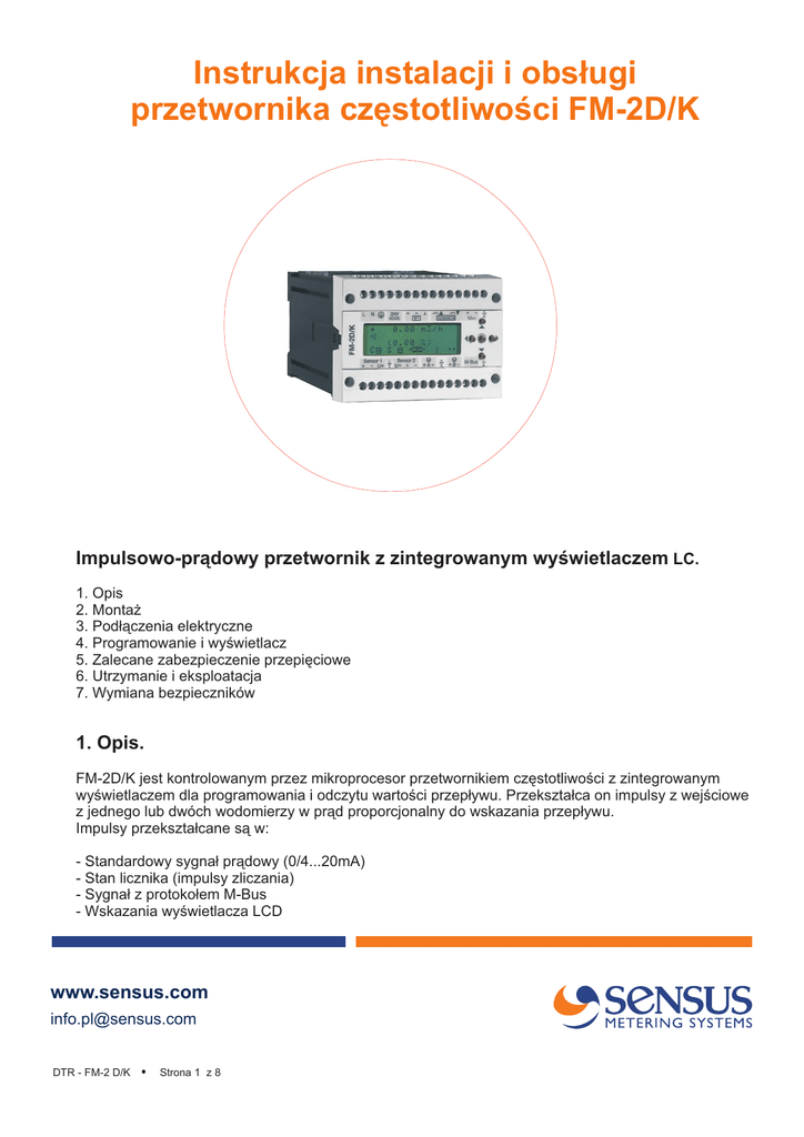Instrukcja instalacji i obs³ugi przetwornika czêstotliwoœci FM-2D/K Impulsowo-pr¹dowy przetwornik z zintegrowanym wyœwietlaczem LC. 1. Opis 2. Monta¿ 3. Pod³¹czenia elektryczne 4. Programowanie i wyœwietlacz 5. Zalecane zabezpieczenie przepiêciowe 6. Utrzymanie i eksploatacja 7. Wymiana bezpieczników 1. Opis. FM-2D/K jest kontrolowanym przez mikroprocesor przetwornikiem czêstotliwoœci z zintegrowanym wyœwietlaczem dla programowania i odczytu wartoœci przep³ywu. Przekszta³ca on impulsy z wejœciowe z jednego lub dwóch wodomierzy w pr¹d proporcjonalny do wskazania przep³ywu. Impulsy przekszta³cane s¹ w: - Standardowy sygna³ pr¹dowy (0/4...20mA) - Stan licznika (impulsy zliczania) - Sygna³ z protoko³em M-Bus - Wskazania wyœwietlacza LCD www.sensus.com [email protected] DTR - FM-2 D/K Strona 1 z 8 2. Monta¿ - Na szynie - Na œcianie - Panelowy 3. Pod³¹czenia elektryczne. Pod³¹czenia elektryczne powinny byæ wykonane przez specjalistê zgodnie z obowi¹zuj¹cymi standardami bezpieczeñstwa. Nie wolno dokonywaæ instalacji przetwornika gdy jest w³¹czone zasilanie. Uwagi instalacyjne: 2 - Maksymalny przekrój kabla 2,5 mm - Przed pod³¹czeniem przetwornika nale¿y sprawdziæ napiêcie zasilania (110 / 230V) - Przy zasilaniu 24 V AC lub DC polaryzacja jest nieistotna - Dane techniczne znajduj¹ siê w karcie katalogowej przetwornika FM-2 D/K FM-2 D/K DTR - FM-2 D/K Strona 2 z 8 DTR - FM-2 D/K FM-2 D/K Strona 3 z 8 Wejœcia impulsowe czujników Wyjœcia danych Ekran * Pod³¹czenie M-Bus / MiniBus Wy³. graniczny B Ekran * Zasilanie dla zewnêtrznych liczników 24V 120mA Wyjœcie impulsowe w ty³ WskaŸnik przep³ywu Impulsy w ty³ Wyjœcie impulsowe wprzód Zasilanie 24V AC lub DC Uziemienie G³ówne zasilanie 230V AC lub 115V AC 2. wprzód i w ty³ odseparowane Wy³. graniczny A Impulsy w przód Uziemienie Sygna³ Zasilanie 12V 10mA Ekran * Zasilanie 12V 10mA Uziemienie Sygna³ Zasilanie Licznik zdalny 1. wprzód i w ty³ ze wskazaniem +/- Przyk³adowe pod³¹czenia zasilania i urz¹dzeñ zewnêtrznych. Pod³¹czenie wodomierza sprzê¿onego, wskaŸnika przep³ywu oraz pasywnego sumatora impulsów (24V). Zasilanie 230V AC lub 115V AC Alternatywne WskaŸnik zasilanie przep³ywu 24V AC/DC Licznik elektroniczny Meitwin wodomierz glowny z Opto OD 01 wodomierz szeregowy z REED Pod³¹czenie 2 wodomierzy, 2 wskaŸników przep³ywu, balansowego licznika elektronicznego oraz gniazda MiniPad (M-Bus). Kierunek Uziemienie Impuls Zasilanie Do przodu Do ty³u 24V AC/DC WskaŸnik przep³ywu Uziemienie Licznik elektroniczny (balansowy) WP-Dynamic z Opto OD 01 WP-Dynamic z Opto OD 01 FM-2 D/K DTR - FM-2 D/K Strona 4 z 8 MiniPad 4. Programowanie i wyœwietlacz. Struktura menu Symbole Pêtla programowania Pêtla odczytu wartoœci programowanych Pêtla odczytu wartoœci mierzonych Pêtla odczytu wartoœci statystycznych Symbole linii statusu (dolna linia) Pêtla programowania Pêtla odczytu programowanych danych Pêtla odczytu mierzonych wartoœci Pêtla wartoœci statystycznych Blokada danych zaprogramowanych Mo¿liwoœæ zmiany danych zaprogramowanych Sumowanie impulsów wejœciowych Odejmowanie impulsów wejœciowych Wybór typu czujnika Wartoœciowoœæ impulsowania czujnika 1 Wartoœciowoœæ impulsowania czujnika 2 qmax (odpowiednio do 20mA) Wyjœcie pr¹dowe i t³umienie Prze³¹czniki wartoœci granicznych i histerezy Wartoœciowoœæ impulsu wyjœcia Opto Indeks startu Wartoœæ impulsowania i status wyjœcia przekaŸnikowego Wyjœcie Opto Tryb testowy Odczyt bilansu objêtoœci i aktualnego przep³ywu Odczyt bilansu objêtoœci Odczyt aktualnego przep³ywu Odczyt objêtoœci “przep³ywu wstecznego” Wartoœæ ekstremalna Maksimum (kasowalna) Wartoœæ ekstremalna Minimum (kasowalna) Wartoœæ ekstremalna Maksimum z 3 godzin Wartoœæ ekstremalna Minimum z 3 godzin Przekroczenie górnej wartoœci granicznej Przekroczenie dolnej wartoœci granicznej Aktualna wartoœæ w tej granicy Podœwietlenie aktywnych przycisków Struktura menu FM-2 D/K zbudowana jest na zasadnie 4 pêtli, które s¹ opisane przez symbole. Poprzez naciskanie 5 przycisków u¿ytkownik mo¿e poruszaæ siê w strukturze menu. Funkcja menu jest wyœwietlana jako symbol w linii statusu (dolna linia) wyœwietlacza LCD. Po prawej stronie linii statusu wyœwietlane jest do 5 kropek, sygnalizuj¹cych, które przyciski s¹ aktywne i mog¹ byæ wciœniête, aby poruszaæ siê po menu. Przyciski maja nastêpuj¹ce funkcje: Góra- ruch o jedna pêtlê wy¿ej / zmiana cyfry lub parametru Dó³ - ruch o jedna pêtlê ni¿ej / zmiana cyfry lub parametru Lewo- w pêtli ruch o funkcjê do przodu / w menu funkcji ruch o jedn¹ cyfrê/parametr do przodu Prawo - w pêtli ruch o funkcjê do ty³u / w menu funkcji ruch o jedn¹ cyfrê/parametr do ty³u Œrodek otwarcie menu funkcji dla zmian lup zapamiêtania parametrów FM-2 D/K DTR - FM-2 D/K Strona 5 z 8 Struktura menu Uwaga: Czas wyœwietlany pêtli statystyki odpowiada czasowi odczytu np. czas odczytu 8:00 ; wyœwietlacz FM-2 D/K 2h:45min oznacza czas wyst¹pienia zdarzenia 5:15 Pêtla programowania Has³o “1234” nie wprowadzona nastawa Prze³¹cznik graniczny Histereza Prze³¹cznik graniczny 0 ... 110% Histereza 0 ... 110% Wejœcie impulsowe E1 E2 Opto uni Opto uni Opto bi Opto bi Indukcyjny w 1 (0) Indukcyjny w 2 (90 ) Indukcyjny w 1 (imp) Indukcyjny w 2 (V/R) o Reed o.c. Reed o.c. Namur Namur Wyjœcie z³¹cze opto Wyjœcie impulsu z³¹cze opto Wejœcie E2 wartoœæ impulsowania 0,001 ... 9999 0,001 ... 9999 litr litr m h cft cft litr min s Qmax (odpowiednio do 20mA) Wyjœcie pr¹dowe T³umienie 0,001 ... 9999 3 Imp Gal Imp Gal cft US Gal US Gal Imp Gal Wartoœæ startowa XXXXXXXX m3 Wyjœcie impulsu przekaŸnik Zmiana has³a XXXX + W³¹czone Wy³¹czone 0,001 ... 9999 + 3 m +/- litr 0,001 ... 9999 cft m Imp Gal litr 3 cft US Gal Wartoœæ impulsowania E1 Wyjœcie z³¹cze opto Pêtla odczytu wartoœci pomiarowe Pêtla odczytu wartoœci statystycznych Wa