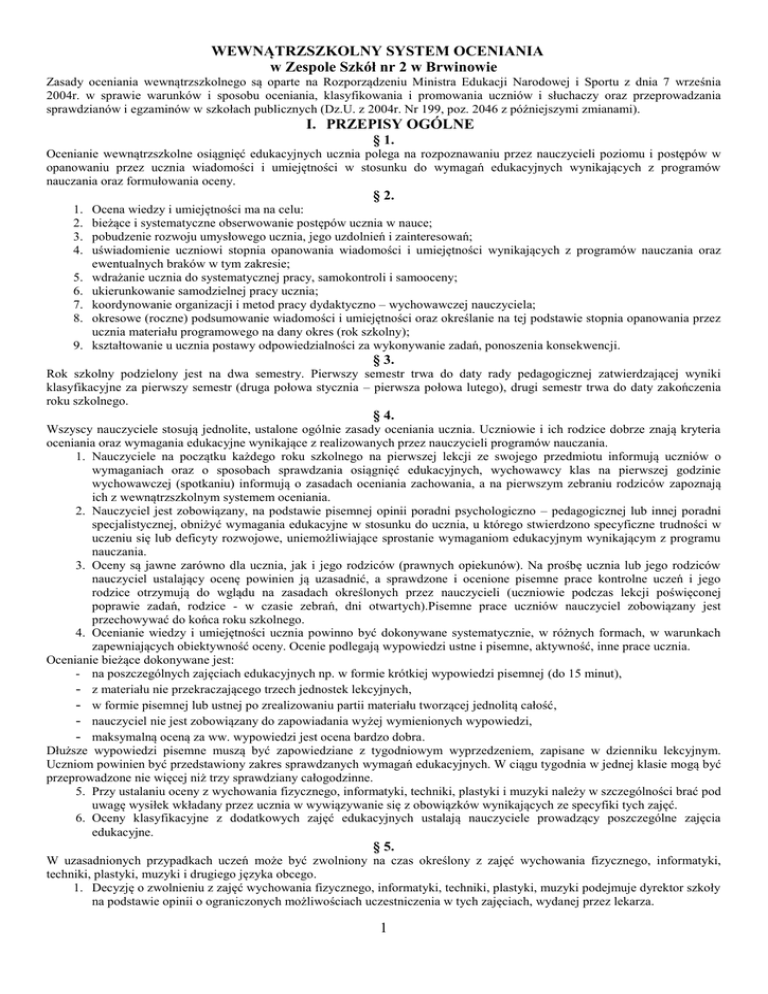 WEWNĄTRZSZKOLNY SYSTEM OCENIANIA w Zespole Szkół nr 2 w Brwinowie Zasady oceniania wewnątrzszkolnego są oparte na Rozporządzeniu Ministra Edukacji Narodowej i Sportu z dnia 7 września 2004r. w sprawie warunków i sposobu oceniania, klasyfikowania i promowania uczniów i słuchaczy oraz przeprowadzania sprawdzianów i egzaminów w szkołach publicznych (Dz.U. z 2004r. Nr 199, poz. 2046 z późniejszymi zmianami). I. PRZEPISY OGÓLNE § 1. Ocenianie wewnątrzszkolne osiągnięć edukacyjnych ucznia polega na rozpoznawaniu przez nauczycieli poziomu i postępów w opanowaniu przez ucznia wiadomości i umiejętności w stosunku do wymagań edukacyjnych wynikających z programów nauczania oraz formułowania oceny. § 2. 1. 2. 3. 4. 5. 6. 7. 8. 9. Ocena wiedzy i umiejętności ma na celu: bieżące i systematyczne obserwowanie postępów ucznia w nauce; pobudzenie rozwoju umysłowego ucznia, jego uzdolnień i zainteresowań; uświadomienie uczniowi stopnia opanowania wiadomości i umiejętności wynikających z programów nauczania oraz ewentualnych braków w tym zakresie; wdrażanie ucznia do systematycznej pracy, samokontroli i samooceny; ukierunkowanie samodzielnej pracy ucznia; koordynowanie organizacji i metod pracy dydaktyczno – wychowawczej nauczyciela; okresowe (roczne) podsumowanie wiadomości i umiejętności oraz określanie na tej podstawie stopnia opanowania przez ucznia materiału programowego na dany okres (rok szkolny); kształtowanie u ucznia postawy odpowiedzialności za wykonywanie zadań, ponoszenia konsekwencji. § 3. Rok szkolny podzielony jest na dwa semestry. Pierwszy semestr trwa do daty rady pedagogicznej zatwierdzającej wyniki klasyfikacyjne za pierwszy semestr (druga połowa stycznia – pierwsza połowa lutego), drugi semestr trwa do daty zakończenia roku szkolnego. § 4. Wszyscy nauczyciele stosują jednolite, ustalone ogólnie zasady oceniania ucznia. Uczniowie i ich rodzice dobrze znają kryteria oceniania oraz wymagania edukacyjne wynikające z realizowanych przez nauczycieli programów nauczania. 1. Nauczyciele na początku każdego roku szkolnego na pierwszej lekcji ze swojego przedmiotu informują uczniów o wymaganiach oraz o sposobach sprawdzania osiągnięć edukacyjnych, wychowawcy klas na pierwszej godzinie wychowawczej (spotkaniu) informują o zasadach oceniania zachowania, a na pierwszym zebraniu rodziców zapoznają ich z wewnątrzszkolnym systemem oceniania. 2. Nauczyciel jest zobowiązany, na podstawie pisemnej opinii poradni psychologiczno – pedagogicznej lub innej poradni specjalistycznej, obniżyć wymagania edukacyjne w stosunku do ucznia, u którego stwierdzono specyficzne trudności w uczeniu się lub deficyty rozwojowe, uniemożliwiające sprostanie wymaganiom edukacyjnym wynikającym z programu nauczania. 3. Oceny są jawne zarówno dla ucznia, jak i jego rodziców (prawnych opiekunów). Na prośbę ucznia lub jego rodziców nauczyciel ustalający ocenę powinien ją uzasadnić, a sprawdzone i ocenione pisemne prace kontrolne uczeń i jego rodzice otrzymują do wglądu na zasadach określonych przez nauczycieli (uczniowie podczas lekcji poświęconej poprawie zadań, rodzice - w czasie zebrań, dni otwartych).Pisemne prace uczniów nauczyciel zobowiązany jest przechowywać do końca roku szkolnego. 4. Ocenianie wiedzy i umiejętności ucznia powinno być dokonywane systematycznie, w różnych formach, w warunkach zapewniających obiektywność oceny. Ocenie podlegają wypowiedzi ustne i pisemne, aktywność, inne prace ucznia. Ocenianie bieżące dokonywane jest: - na poszczególnych zajęciach edukacyjnych np. w formie krótkiej wypowiedzi pisemnej (do 15 minut), - z materiału nie przekraczającego trzech jednostek lekcyjnych, - w formie pisemnej lub ustnej po zrealizowaniu partii materiału tworzącej jednolitą całość, - nauczyciel nie jest zobowiązany do zapowiadania wyżej wymienionych wypowiedzi, - maksymalną oceną za ww. wypowiedzi jest ocena bardzo dobra. Dłuższe wypowiedzi pisemne muszą być zapowiedziane z tygodniowym wyprzedzeniem, zapisane w dzienniku lekcyjnym. Uczniom powinien być przedstawiony zakres sprawdzanych wymagań edukacyjnych. W ciągu tygodnia w jednej klasie mogą być przeprowadzone nie więcej niż trzy sprawdziany całogodzinne. 5. Przy ustalaniu oceny z wychowania fizycznego, informatyki, techniki, plastyki i muzyki należy w szczególności brać pod uwagę wysiłek wkładany przez ucznia w wywiązywanie się z obowiązków wynikających ze specyfiki tych zajęć. 6. Oceny klasyfikacyjne z dodatkowych zajęć edukacyjnych ustalają nauczyciele prowadzący poszczególne zajęcia edukacyjne. § 5. W uzasadnionych przypadkach uczeń może być zwolniony na czas określony z zajęć wychowania fizycznego, informatyki, techniki, plastyki, muzyki i drugiego języka obcego. 1. Decyzję o zwolnieniu z zajęć wychowania fizycznego, informatyki, techniki, plastyki, muzyki podejmuje dyrektor szkoły na podstawie opinii o ograniczonych możliwościach uczestniczenia w tych zajęciach, wydanej przez lekarza. 1 2. Decyzję o zwolnieniu z drugiego języka obcego podejmuje dyrektor na wniosek rodziców (prawnych opiekunów) oraz na podstawie poradni psychologiczno – pedagogicznej lub innej poradni specjalistycznej, ucznia z wadą słuchu, z głęboką dysleksją rozwojową, ze sprzężonymi niepełnosprawnościami lub autyzmem. 3. W przypadku ucznia posiadającego orzeczenie o potrzebie kształcenia specjalnego albo indywidualnego nauczania zwolnienie z nauki drugiego języka obcego może nastąpić na podstawie tego orzeczenia. 4. W przypadku zwolnienia ucznia z zajęć wychowania fizycznego, informatyki, techniki, plastyki, muzyki i drugiego języka obcego w dokumentacji przebiegu nauczania zamiast oceny klasyfikacyjnej wpisuje się „zwolniony”. § 6. 1. W klasach IV–VI szkoły podstawowej i I – III gimnazjum oceny bieżące, klasyfikacyjne oraz śródroczne i roczne ustala się w stopnia