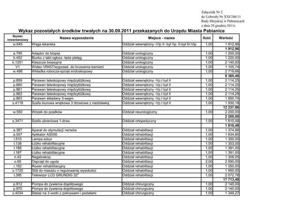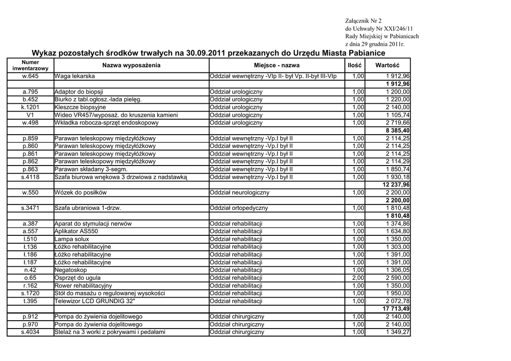 Załącznik Nr 2 do Uchwały Nr XXI/246/11 Rady Miejskiej w Pabianicach z dnia 29 grudnia 2011r. Wykaz pozostałych środków trwałych na 30.09.2011 przekazanych do Urzędu Miasta Pabianice Numer inwentarzowy Nazwa wyposażenia Miejsce - nazwa Ilość w.645 Waga lekarska Oddział wewnętrzny -VIp II- był Vp. II-był III-VIp 1,00 a.795 b.452 k.1201 V1 w.498 Adaptor do biopsji Biurko z tabl.ogłosz.-lada pielęg. Kleszcze biopsyjne Wideo VR457/wyposaż. do kruszenia kamieni Wkładka robocza-sprzęt endoskopowy Oddział urologiczny Oddział urologiczny Oddział urologiczny Oddział urologiczny Oddział urologiczny 1,00 1,00 1,00 1,00 1,00 p.859 p.860 p.861 p.862 p.863 s.4118 Parawan teleskopowy międzyłóżkowy Parawan teleskopowy międzyłóżkowy Parawan teleskopowy międzyłóżkowy Parawan teleskopowy międzyłóżkowy Parawan składany 3-segm. Szafa biurowa wnękowa 3 drzwiowa z nadstawką Oddział wewnętrzny -Vp.I był II Oddział wewnętrzny -Vp.I był II Oddział wewnętrzny -Vp.I był II Oddział wewnętrzny -Vp.I był II Oddział wewnętrzny -Vp.I był II Oddział wewnętrzny -Vp.I był II 1,00 1,00 1,00 1,00 1,00 1,00 w.550 Wózek do posiłków Oddział neurologiczny 1,00 s.3471 Szafa ubraniowa 1-drzw. Oddział ortopedyczny 1,00 a.387 a.557 l.510 ł.136 ł.186 ł.187 n.42 o.65 r.162 s.1720 t.395 Aparat do stymulacji nerwów Aplikator AS550 Lampa solux Łóżko rehabilitacyjne Łóżko rehabilitacyjne Łóżko rehabilitacyjne Negatoskop Osprzęt do ugula Rower rehabilitacyjny Stół do masażu o regulowanej wysokości Telewizor LCD GRUNDIG 32" Oddział rehabilitacji Oddział rehabilitacji Oddział rehabilitacji Oddział rehabilitacji Oddział rehabilitacji Oddział rehabilitacji Oddział rehabilitacji Oddział rehabilitacji Oddział rehabilitacji Oddział rehabilitacji Oddział rehabilitacji 1,00 1,00 1,00 1,00 1,00 1,00 1,00 2,00 1,00 1,00 1,00 p.912 p.970 s.4034 Pompa do żywienia dojelitowego Pompa do żywienia dojelitowego Stelaż na 3 worki z pokrywami i pedałami Oddział chirurgiczny Oddział chirurgiczny Oddział chirurgiczny 1,00 1,00 1,00 Wartość 1 912,96 1 912,96 1 200,00 1 220,00 2 140,00 1 105,74 2 719,66 8 385,40 2 114,25 2 114,25 2 114,25 2 114,29 1 850,74 1 930,18 12 237,96 2 200,00 2 200,00 1 810,48 1 810,48 1 374,86 1 634,80 1 350,00 1 303,00 1 391,00 1 391,00 1 306,05 2 590,00 1 350,00 1 950,00 2 072,78 17 713,49 2 140,00 2 140,00 1 349,27