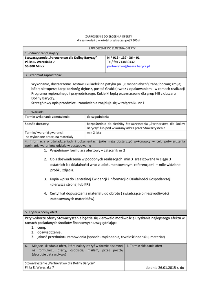 ZAPROSZENIE DO ZŁOŻENIA OFERTY dla zamówień o wartości przekraczającej 3 500 zł ZAPROSZENIE DO ZŁOŻENIA OFERTY 1.Podmiot zapraszający: Stowarzyszenie „Partnerstwo dla Doliny Baryczy” Pl. ks E. Waresiaka 7 56-300 Milicz NIP 916 - 137 - 36 – 91 Tel/ fax 713830432 [email protected] 3. Przedmiot zaproszenia: Wykonanie, dostarczenie zestawu kukiełek na patyku pn. „8 wspaniałych”( żaba; bocian; żmija; bóbr; nietoperz; karp; kozioróg dębosz, postać Grabka) wraz z opakowaniem- w ramach realizacji Programu regionalnego i przyrodniczego. Kukiełki będą przeznaczone dla grup I-III z obszaru Doliny Baryczy. Szczegółowy opis przedmiotu zamówienia znajduje się w załączniku nr 1 1. Warunki Termin wykonania zamówienia: Sposób dostawy: do uzgodnienia bezpośrednio do siedziby Stowarzyszenia „Partnerstwo dla Doliny Baryczy” lub pod wskazany adres przez Stowarzyszenie min 2 lata Termin/ warunki gwarancji: na wykonane prace, na materiały 4. Informacja o oświadczeniach i dokumentach jakie mają dostarczyć wykonawcy w celu potwierdzenia spełniania warunków udziału w postępowaniu 1. Wypełniony formularz ofertowy – załącznik nr 2 2. Opis doświadczenia w podobnych realizacjach min 3 zrealizowane w ciągu 3 ostatnich lat działalności wraz z udokumentowanymi referencjami – mile widziane próbki, zdjęcia. 3. Kopia wpisu do Centralnej Ewidencji i Informacji o Działalności Gospodarczej (pierwsza strona) lub KRS 4. Certyfikat dopuszczenia materiału do obrotu ( świadczące o nieszkodliwości zastosowanych materiałów) 5. Kryteria oceny ofert Przy wyborze oferty Stowarzyszenie będzie się kierowało możliwością uzyskania najlepszego efektu w ramach posiadanych środków finansowych uwzględniając: 1. cenę, 2. doświadczenie , 3. jakość przedmiotu zamówienia (sposobu wykonania, trwałość nadruku, materiał) 6. Miejsce składania ofert, którą należy złożyć w formie pisemnej na formularzu oferty, osobiście, mailem, przez pocztę (decyduje data wpływu) Stowarzyszenie „Partnerstwo dla Doliny Baryczy” Pl. ks E. Waresiaka 7 7. Termin składania ofert do dnia 26.01.2015 r. do 56-300 Milicz godz. 15:00 Tel/ fax 713830432 partnerstwo @nasza.barycz.pl 8.Zastrzeżenia Zamawiający zastrzega sobie prawo swobodnego wyboru ofert, prawo zmiany warunków lub odwołania zaproszenia do składania ofert, oraz prawo zamknięcia postępowania bez wyboru oferty na każdym jego etapie. Otwarcie ofert nie ma charakteru publicznego. 9. Informacje o formalnościach, jakie powinny zostać dopełnione po wyborze oferty w celu zawarcia umowy (dotyczy wydatków powyżej 3500 zł) O wyborze oferty zamawiający zawiadomi poprzez zamieszczenie w terminie do 15 dni po upływie terminu złożenia ofert informacji na stronie internetowej pod adresem www.nasza.barycz.pl. W tym okresie wykonawcy pozostają związani ofertą. Jeżeli Wykonawca, którego oferta została wybrana uchyli się od zawarcia umowy, zamawiający może wybrać ofertę najkorzystniejszą spośród pozostałych ofert. 10.Osoba uprawnione do porozumiewania się z 11. Data opublikowania/ wysłania zaproszenia wykonawcami 19 stycznia 2015 r. Specjalista ds. promocji i informacji Anna Urbańczyk Stowarzyszenie „Partnerstwo dla Doliny Baryczy” Załącznik nr 1 Szczegółowy opis przedmiotu zamówienia Zadania: Wykonanie, dostarczenie zestawu kukiełek na patyku pn. „8 wspaniałych” wraz z opakowaniem - w ramach realizacji Programu regionalnego i przyrodniczego. Kukiełki będą przeznaczone dla grup I-III z obszaru Doliny Baryczy. Za komplet kukiełek rozumie się, charakterystyczne zwierzęta występujące w Dolinie Baryczy: 1. Żaba 2. Bocian 3. Żmija 4. Bóbr 5. Nietoperz 6. Karp 7. Kozioróg dębosz 8. Postać bajkowa Grabka wg wzoru rysunku. Ilość kompletów podlegających wycenie zamieszczona jest w formularzu oferty. Kukiełki będą zrealizowane na indywidulane zamówienie. Forma pacynek wykonana po obrysie zwierząt z marginesem – może przyjąć formę owalu, brył nieforemnych…(zwierzę rozmieszczone na formacie A5, nadruk full kolor, na drewnie metodą UV, termodruku lub alternatywną o jakości druku offsetowego – nie sitowego (rysunki z dużym poziomem szczegółowości). Nadruk musi być trwały, wodoodporny. Zwierzątka nadrukowane na sklejkę – grubości minimum 4 mm, patyczek drewniany dostosowany do wielkości i ciężaru kukiełki. Mocowanie postaci do patyczka trwałe, stabilne. Opakowanie dostoswane do wielkości kompletu. Kartonowe, ewentualnie: karton + folia – z możliwością nadruku w kolorze: opisu, loga, znaków towarowych, layoutu wypracowanego w ramach projektu. Grafika na opakowanie zostanie przygotowana i dostarczona wg parametrów technicznych wskazanych przez Wykonawcę. Sposób wykonania ma być dokonany ze sztuką, nie budzący wątpliwości co do jakości wykonania. Etapy realizacji: 1. Wykonanie prototypów 1 kompletu kukiełek wraz z opakowaniem, proof do projektu opakowania (materiał wykonawczy, nadruk) 2. Akceptacja zamawiającego 3. Wykonanie kukiełek 4. Dostarczenie na adres wskazany przez zamawiającego.