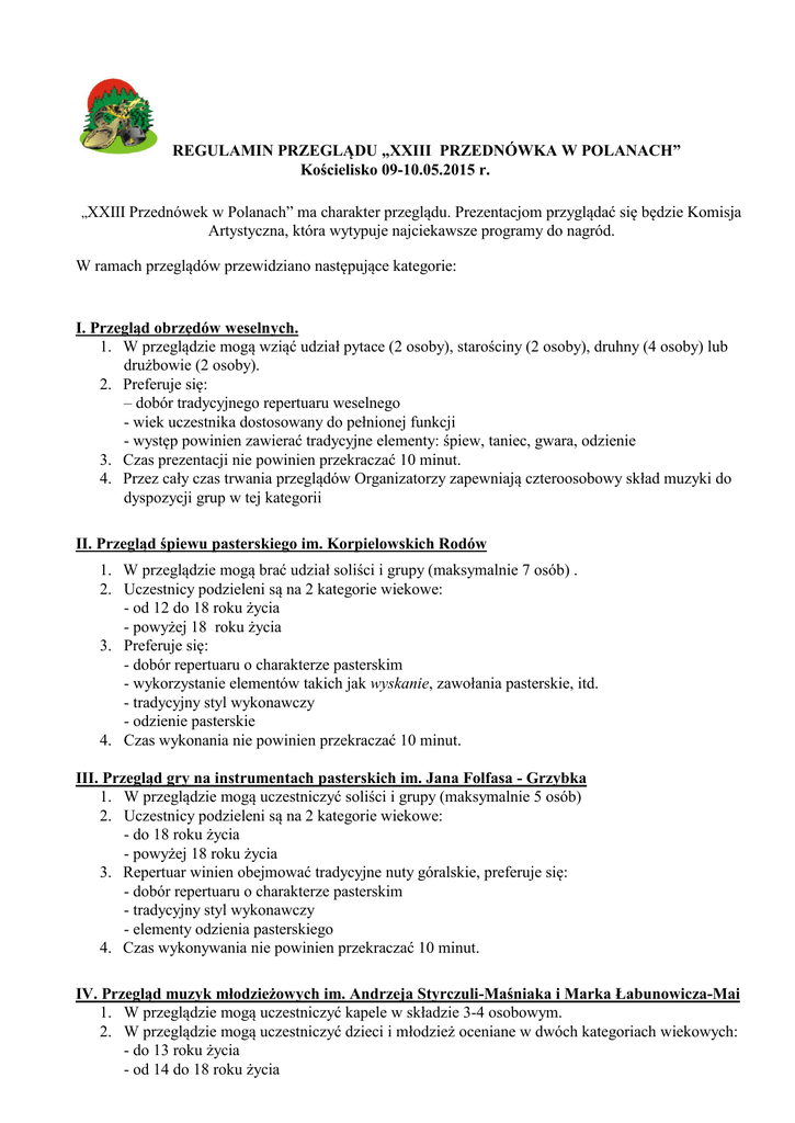 REGULAMIN PRZEGLĄDU „XXIII PRZEDNÓWKA W POLANACH” Kościelisko 09-10.05.2015 r. „XXIII Przednówek w Polanach” ma charakter przeglądu. Prezentacjom przyglądać się będzie Komisja Artystyczna, która wytypuje najciekawsze programy do nagród. W ramach przeglądów przewidziano następujące kategorie: I. Przegląd obrzędów weselnych. 1. W przeglądzie mogą wziąć udział pytace (2 osoby), starościny (2 osoby), druhny (4 osoby) lub drużbowie (2 osoby). 2. Preferuje się: – dobór tradycyjnego repertuaru weselnego - wiek uczestnika dostosowany do pełnionej funkcji - występ powinien zawierać tradycyjne elementy: śpiew, taniec, gwara, odzienie 3. Czas prezentacji nie powinien przekraczać 10 minut. 4. Przez cały czas trwania przeglądów Organizatorzy zapewniają czteroosobowy skład muzyki do dyspozycji grup w tej kategorii II. Przegląd śpiewu pasterskiego im. Korpielowskich Rodów 1. W przeglądzie mogą brać udział soliści i grupy (maksymalnie 7 osób) . 2. Uczestnicy podzieleni są na 2 kategorie wiekowe: - od 12 do 18 roku życia - powyżej 18 roku życia 3. Preferuje się: - dobór repertuaru o charakterze pasterskim - wykorzystanie elementów takich jak wyskanie, zawołania pasterskie, itd. - tradycyjny styl wykonawczy - odzienie pasterskie 4. Czas wykonania nie powinien przekraczać 10 minut. III. Przegląd gry na instrumentach pasterskich im. Jana Folfasa - Grzybka 1. W przeglądzie mogą uczestniczyć soliści i grupy (maksymalnie 5 osób) 2. Uczestnicy podzieleni są na 2 kategorie wiekowe: - do 18 roku życia - powyżej 18 roku życia 3. Repertuar winien obejmować tradycyjne nuty góralskie, preferuje się: - dobór repertuaru o charakterze pasterskim - tradycyjny styl wykonawczy - elementy odzienia pasterskiego 4. Czas wykonywania nie powinien przekraczać 10 minut. IV. Przegląd muzyk młodzieżowych im. Andrzeja Styrczuli-Maśniaka i Marka Łabunowicza-Mai 1. W przeglądzie mogą uczestniczyć kapele w składzie 3-4 osobowym. 2. W przeglądzie mogą uczestniczyć dzieci i młodzież oceniane w dwóch kategoriach wiekowych: - do 13 roku życia - od 14 do 18 roku życia 3. Uczestnicy wykonują repertuar na tradycyjnych instrumentach: skrzypcach, basach, złóbcokach 4. Repertuar obejmować winien tradycyjne nuty góralskie. 5. Czas wykonania nie powinien przekraczać 10 minut. V. Przegląd muzyk im. Stanisława Nędzy-Chotarskiego i Stanisława Szczepaniaka-Bańscorza. 1. W przeglądzie uczestniczą kapele w wieku powyżej 18 roku życia w składzie 3-4 osobowym składzie. 2. Uczestnicy wykonują repertuar na tradycyjnych instrumentach: skrzypcach, basach, złóbcokach 3. Repertuar winien obejmować różnorodne tradycyjne nuty góralskie. 4. Czas wykonania nie powinien przekraczać 10 minut. Prosimy aby prezentowane programy nie przekraczały wyznaczonego czasu. Jury przyzna w każdej z zaprezentowanych kategorii nagrody: - Złoty Polaniarski Zbyrcok- I miejsce - Srebrny Polaniarski Zbyrcok- II miejsce - Brązowy Polaniarski Zbyrcok- III miejsce Forma nagród w postaci zbyrcoka nawiązuje do nagród przyznawanych w pierwszych edycjach Przednówka w Polanach . Dodatkowo zostaną przyznane nagrody rzeczowe w postaci: Nagrody Wójta Gminy Kościelisko, Nagrody Dyrektora GOKR Kościelisko oraz Nagrody Prezesa Związku Podhalan O/ Kościelisko. Wszyscy uczestnicy otrzymają pamiątkowe dyplomy. Na uroczystość oficjalnego ogłoszenia wyników i wręczenia nagród laureaci proszeni są o przybycie w strojach regionalnych Informacje organizacyjne: 1. Zgłoszenia uczestnictwa w „XXIII Przednówku w Polanach” przyjmujemy w nieprzekraczalnym terminie do dnia 06.05.2015 r. włącznie. pod adresem: GOKR Kościelisko, 34-511 Kościelisko, ul. Nędzy-Kubińca 76, telefonicznie lub faxem pod nr 18 20 700 51, lub drogą elektroniczną: e-mail: [email protected]. W trakcie trwania imprezy zgłoszenia nie będą przyjmowane !!! 2. Uczestnicy pokrywają sobie sami koszty podróży. 3. Uczestnikom przeglądu, którzy zostali zgłoszeni na karcie uczestnictwa zapewniamy posiłek. Organizatorzy