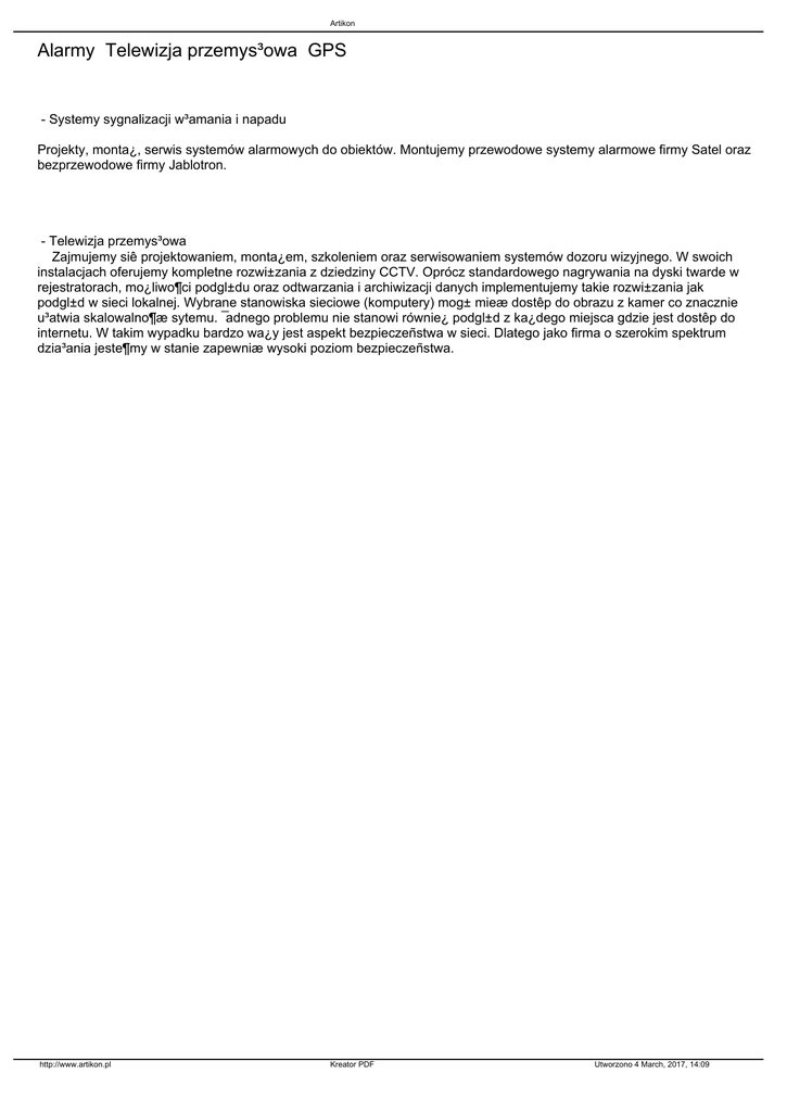 Artikon Alarmy Telewizja przemys³owa GPS - Systemy sygnalizacji w³amania i napadu Projekty, monta¿, serwis systemów alarmowych do obiektów. Montujemy przewodowe systemy alarmowe firmy Satel oraz bezprzewodowe firmy Jablotron. - Telewizja przemys³owa Zajmujemy siê projektowaniem, monta¿em, szkoleniem oraz serwisowaniem systemów dozoru wizyjnego. W swoich instalacjach oferujemy kompletne rozwi±zania z dziedziny CCTV. Oprócz standardowego nagrywania na dyski twarde w rejestratorach, mo¿liwo¶ci podgl±du oraz odtwarzania i archiwizacji danych implementujemy takie rozwi±zania jak podgl±d w sieci lokalnej. Wybrane stanowiska sieciowe (komputery) mog± mieæ dostêp do obrazu z kamer co znacznie u³atwia skalowalno¶æ sytemu. ¯adnego problemu nie stanowi równie¿ podgl±d z ka¿dego miejsca gdzie jest dostêp do internetu. W takim wypadku bardzo wa¿y jest aspekt bezpieczeñstwa w sieci. Dlatego jako firma o szerokim spektrum dzia³ania jeste¶my w stanie zapewniæ wysoki poziom bezpieczeñstwa. http://www.artikon.pl Kreator PDF Utworzono 4 March, 2017, 14:09