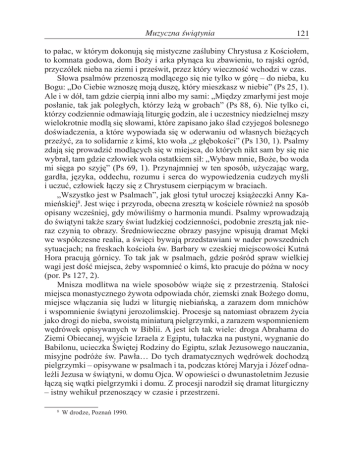 Muzyczna świątynia 121 to pałac, w którym dokonują się mistyczne zaślubiny Chrystusa z Kościołem, to komnata godowa, dom Boży i arka płynąca ku zbawieniu, to rajski ogród, przyczółek nieba na ziemi i prześwit, przez który wieczność wchodzi w czas. Słowa psalmów przenoszą modlącego się nie tylko w górę – do nieba, ku Bogu: „Do Ciebie wznoszę moją duszę, który mieszkasz w niebie” (Ps 25, 1). Ale i w dół, tam gdzie cierpią inni albo my sami: „Między zmarłymi jest moje posłanie, tak jak poległych, którzy leżą w grobach” (Ps 88, 6). Nie tylko ci, którzy codziennie odmawiają liturgię godzin, ale i uczestnicy niedzielnej mszy wielokrotnie modlą się słowami, które zapisano jako ślad czyjegoś bolesnego doświadczenia, a które wypowiada się w oderwaniu od własnych bieżących przeżyć, za to solidarnie z kimś, kto woła „z głębokości” (Ps 130, 1). Psalmy zdają się prowadzić modlących się w miejsca, do których nikt sam by się nie wybrał, tam gdzie człowiek woła ostatkiem sił: „Wybaw mnie, Boże, bo woda mi sięga po szyję” (Ps 69, 1). Przynajmniej w ten sposób, użyczając warg, gardła, języka, oddechu, rozumu i serca do wypowiedzenia cudzych myśli i uczuć, człowiek łączy się z Chrystusem cierpiącym w braciach. „Wszystko jest w Psalmach”, jak głosi tytuł uroczej książeczki Anny Kamieńskiej8. Jest więc i przyroda, obecna zresztą w kościele również na sposób opisany wcześniej, gdy mówiliśmy o harmonia mundi. Psalmy wprowadzają do świątyni także szary świat ludzkiej codzienności, podobnie zresztą jak nieraz czynią to obrazy. Średniowieczne obrazy pasyjne wpisują dramat Męki we współczesne realia, a święci bywają przedstawiani w nader powszednich sytuacjach; na freskach kościoła św. Barbary w czeskiej miejscowości Kutná Hora pracują górnicy. To tak jak w psalmach, gdzie pośród spraw wielkiej wagi jest dość miejsca, żeby wspomnieć o kimś, kto pracuje do późna w nocy (por. Ps 127, 2). Mnisza modlitwa na wiele sposobów wiąże się z przestrzenią. Stałości miejsca monastycznego żywota odpowiada chór, ziemski znak Bożego domu, miejsce włączania się ludzi w liturgię niebiańską, a zarazem dom mnichów i wspomnienie świątyni jerozolimskiej. Procesje są natomiast obrazem życia jako drogi do nieba, swoistą miniaturą pielgrzymki, a zarazem wspomnieniem wędrówek opisywanych w Biblii. A jest ich tak wiele: droga Abrahama do Ziemi Obiecanej, wyjście Izraela z Egiptu, tułaczka na pustyni, wygnanie do Babilonu, ucieczka Świętej Rodziny do Egiptu, szlak Jezusowego nauczania, misyjne podróże św. Pawła… Do tych dramatycznych wędrówek dochodzą pielgrzymki – opisywane w psalmach i ta, podczas której Maryja i Józef odnaleźli Jezusa w świątyni, w domu Ojca. W opowieści o dwunastoletnim Jezusie łączą się wątki pielgrzymki i domu. Z procesji narodził się dramat liturgiczny – istny wehikuł przenoszący w czasie i przestrzeni. 8 W drodze, Poznań 1990. Błażej MATUSIAK OP 122 Jest taki psalm, który zawiera w sobie trudne do ogarnięcia wymiary przestrzeni i czasu. Psalm 114, znany pod łacińskim incipitem In exitu Israel de Aegypto, to najpierw wspomnienie Wyjścia: „Gdy Izrael wychodził z Egiptu” (Ps 114, 1). W obrębie kilku wersetów następuje przedziwny skrót hebrajskiej epopei, istne zawężenie przestrzeni. Jednym tchem wspomina się o Morzu Czerwonym i o rzece Jordan, nie zważając na czterdzieści lat różnicy między ich przekraczaniem: „Cóż ci jest, morze, że uciekasz? Czemu bieg swój odwracasz, Jordanie?” (Ps 114, 3). Zgodnie z żydowską tradycją każde pokolenie ma się uważać za to, które wyszło z Egiptu. W niewoli babilońskiej prorocy zapowiadali nowy Exodus. Również dla chrześcijan znaczenie opowieści o Wyjściu wykracza poza historię, wskazując drogę ku nowej Ziemi Obiecanej, ku wieczności. Na tym nie koniec: psalm ten od wieków śpiewano na melodię zwaną tonem pielgrzymim (łac. tonus peregrinus). Zdaniem krakowskiego nauczyciela muzyki z pierwszej połowy szesnastego wieku, Jerzego Libana, nazwa ta miała podkreślać, że chodzi o ton rzadko stosowany, inny od pozostałych ośmiu i trudny do zakwalifikowania. Z jednej strony jest on radosny jak pielgrzym zmierzający do celu (i radosny jak Wielkanoc, na którą był przeznaczony), z drugiej – „peregrinus” to także obcy i cudzoziemiec. Tak właśnie Liban ukazuje ten ton w osobliwej scenie dialogu z ośmioma tonami chorałowymi. „Pielgrzym” dopiero na końcu zdobywa zaufanie swoich „braci”, wcześniej przez nich wzgardzony. Ton pielgrzymi, z jego dwoma tenorami (czyli tonami recytatywnymi), faktycznie wydaje się anomalią na gruncie uporządkowanej gregoriańskiej tonalności. Już w traktacie Commemoratio brevis z końca dziewiątego wieku został określony jako „tonus novissimus” (co jednak nie musi znaczyć „najnowszy”, ale „ostatni”, mianowicie „ostatni z wymienionych”). Okazuje się jednak, że tonus peregrinus daleką odbył pielgrzymkę. Pozostawiając precyzję specjalistom, ujmując rzecz najostrożniej i powstrzymując się od spekulacji na temat pochodzenia tego tonu, powiedzmy, że melodia ta, przez wielu średniowiecznych teoretyków uważana za późną, jest pokrewna tonowi, na jaki Żydzi z Jemenu od wieków śpiewają właśnie ten psalm. A że jemeńska diaspora wywodzi się z czasów niewoli babilońskiej, można przypuszczać, że mamy tu do czynienia z melodią pamiętającą czasy Rozmowę tonów zatytułowaną De peregrino w łacińskim oryginale i polskim tłumaczeniu można znaleźć w Jerzego Libana Pismach o muzyce (tłum. i oprac. E. Witkowska-Zaremba, Polskie Wydawnictwo Muzyczne, Kraków 1984, s. 211-220). Jest to część Mowy na cześć muzyki (De musicae laudibus oratio). 10 W przeciwieństwie do jednej wysokości recytacji w pozostałych tonach (o czym była mow