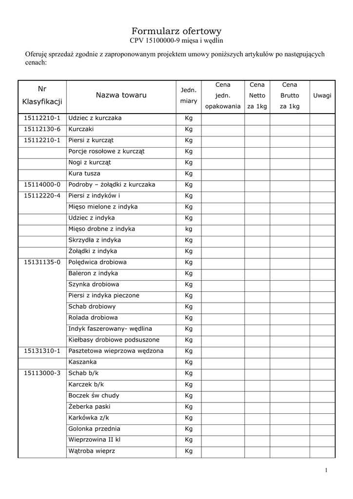 formularz ofertowy mięso i wędliny