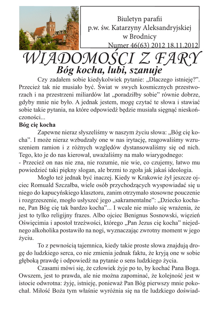Biuletyn parafii p.w. św. Katarzyny Aleksandryjskiej w Brodnicy Numer 46(63) 2012 18.11.2012 WIADOMOŚCI Z FARY Bóg kocha, lubi, szanuje Czy zadałem sobie kiedykolwiek pytanie: „Dlaczego istnieję?”. Przecież tak nie musiało być. Świat w swych kosmicznych przestworzach i na przestrzeni miliardów lat „poradziłby sobie” równie dobrze, gdyby mnie nie było. A jednak jestem, mogę czytać te słowa i stawiać sobie takie pytania, na które odpowiedź będzie musiała sięgnąć nieskończoności... Bóg cię kocha Zapewne nieraz słyszeliśmy w naszym życiu słowa: „Bóg cię kocha”. I może nieraz wzbudzały one w nas irytację, reagowaliśmy wzruszeniem ramion i z różnych względów dystansowaliśmy się od nich. Tego, kto je do nas kierował, uważaliśmy na mało wiarygodnego: - Przecież on nas nie zna, nie rozumie, nie wie, co czujemy, łatwo mu powiedzieć taki piękny slogan, ale brzmi to zgoła jak jakaś ideologia. Mogło też jednak być inaczej. Kiedy w Krakowie żył jeszcze ojciec Romuald Szczałba, wiele osób przychodzących wyspowiadać się u niego do kapucyńskiego klasztoru, zanim otrzymało stosowne pouczenie i rozgrzeszenie, mogło usłyszeć jego „sakramentalne”: „Dziecko kochane, Pan Bóg cię tak bardzo kocha”... I wcale nie miało się wrażenia, że jest to tylko religijny frazes. Albo ojciec Benignus Sosnowski, więzień Oświęcimia i apostoł trzeźwości, którego „Pan Jezus cię kocha” niejednego alkoholika postawiło na nogi, wyznaczając zwrotny moment w jego życiu. To z pewnością tajemnica, kiedy takie proste słowa znajdują drogę do ludzkiego serca, co nie zmienia jednak faktu, że kryją one w sobie głęboką prawdę i odpowiedź na pytanie o sens ludzkiego życia. Czasami mówi się, że człowiek żyje po to, by kochać Pana Boga. Owszem, jest to prawda, ale nie można zapominać, że kolejność jest w istocie odwrotna: żyję, istnieję, ponieważ Pan Bóg pierwszy mnie pokochał. Miłość Boża tym właśnie wyróżnia się na tle ludzkiego doświad- czenia miłości, że jest całkowicie bezinteresowna i bezwarunkowa. Bóg nie kocha za coś albo po coś. On kocha, ponieważ po prostu sam jest Miłością. Autor Księgi Powtórzonego Prawa, zastanawiając się nad tym, dlaczego Pan Bóg wybrał lud izraelski, pisze: Pan wybrał was i znalazł upodobanie w was nie dlatego, że liczebnie przewyższacie wszystkie narody, gdyż ze wszystkich narodów jesteście najmniejszym, lecz ponieważ Pan was umiłował (Pwt 7,7-8a) – i słowa te każdy z nas może odczytać jako mówiące właśnie o nim, podpowiadające odpowiedź na pytanie „dlaczego istnieję”. Miłość Boża jest też „wieczysta”. Nigdy się nie wyczerpie, nigdy się nie skończy. Bóg zawsze kocha i nie ma takiej siły na świecie ani takiej słabości i grzechu w człowieku, które mogłyby tej miłości zagrozić. Pojęcie wieczności jest dla nas nieco abstrakcyjne, Księga Izajasza przybliża nam ją za pomocą obrazu: Bo góry mogą ustąpić i pagórki się zachwiać, ale miłość moja nie odstąpi od ciebie, mówi Pan (Iz 54,10). W każdym razie, jeśli na tym świecie jest coś pewnego, na czym można się oprzeć, to jest to właśnie prawda o Bożej miłości do każdego człowieka. Z wymową słów „Bóg cię kocha” najbardziej kłóci się nasze ludzkie doświadczenie odrzucenia, poniżenia, braku poczucia własnej wartości, nieumiejętności odnalezienia się w czasem brutalnym świecie, jaki nas otacza. By przedrzeć się przez to wszystko i otworzyć się na doświadczenie miłości Pana Boga, trzeba odwołać się do podstawowej prawdy, że istnieję, żyję, że jest to coś cudownego i nie byłoby to możliwe, gdyby nie istniał Ktoś, kto to sprawił, kto jest Miłością i wciąż stoi przy mnie. Pismo Święte tak opisuje to doświadczenie: Miłujesz bowiem wszystkie stworzenia, niczym się nie brzydzisz, co uczyniłeś, bo gdybyś miał coś w nienawiści, nie byłbyś tego uczynił. Jakżeby coś trwać mogło, gdybyś Ty tego nie chciał? Jak by się zachowało, czego byś nie wezwał? Panie, miłośniku życia! (Mdr 11,24-25). Czy On mnie lubi? Prawdę o Bożej miłości możemy przyjąć intelektualnie i powiedzieć: „Tak, w istocie tak musi być, Pan Bóg rzeczywiście jest Miłością”. Możemy nawet z wielkim zaangażowaniem głosić tę prawdę innym (jak chociażby próbuje to czynić autor artykułu). Przed każdym z nas pozostanie jednak wyzwanie, by pokonać drogę, o której niektórzy mówią, że jest najdłuższym dystansem na świecie – drogę od intelektu do serca. Z naszej wspólnoty parafialnej pożegnaliśmy śp. Apolonię Godlewską, l. 90, Janinę Dąbrowską, l. 86, Julitę Pancierzyńską, l. 89. „Wieczny odpoczynek…”. OGŁOSZENIA PARAFIALNE XXXIII Niedziela Zwykła 18. listopada 2012 1. Dziś na Mszy św. o godz. 9.30 zostaną (zostały) poświęcone opłatki na stół wigilijny, które trafią do naszych domów za pośrednictwem p. Organisty Piotra Jaworskiego, którego prosimy serdecznie przyjąć, gdy zapuka do naszych drzwi. 2. Zapraszamy na spotkanie modlitewne do Miłosierdzia Bożego dziś o godz. 17.00 do Kaplicy Krzyża św. 3. W liturgii wspominać będziemy: w poniedziałek 19. listopada bł. Salomeę, zakonnicę, we wtorek 20. listopada św. Rafała Kalinowskiego, prezbitera, w środę 21. listopada Ofiarowanie NMP, w czwartek 22. listopada św. Cecylię, dziewicę i męczennicę, patronkę muzyki kościelnej; w sobotę 24. listopada św. Andrzeja Dung-Lac, prezbitera i Towarzyszy męczenników. 4. W czwartek 22. listopada po Mszach św. będzie można oddać cześć relikwiom bł. Jana Pawła II. 5. W przyszłą, ostatnią niedzielę w ciągu roku kościelnego, obchodzić będziemy Uroczystość Jezusa Chrystusa Króla Wszechświata a w naszej parafii Odpust ku czci Św. Katarzyny Aleksandryjskiej, Patronki parafii i kościoła farnego. Suma Odpustowa zostanie o
