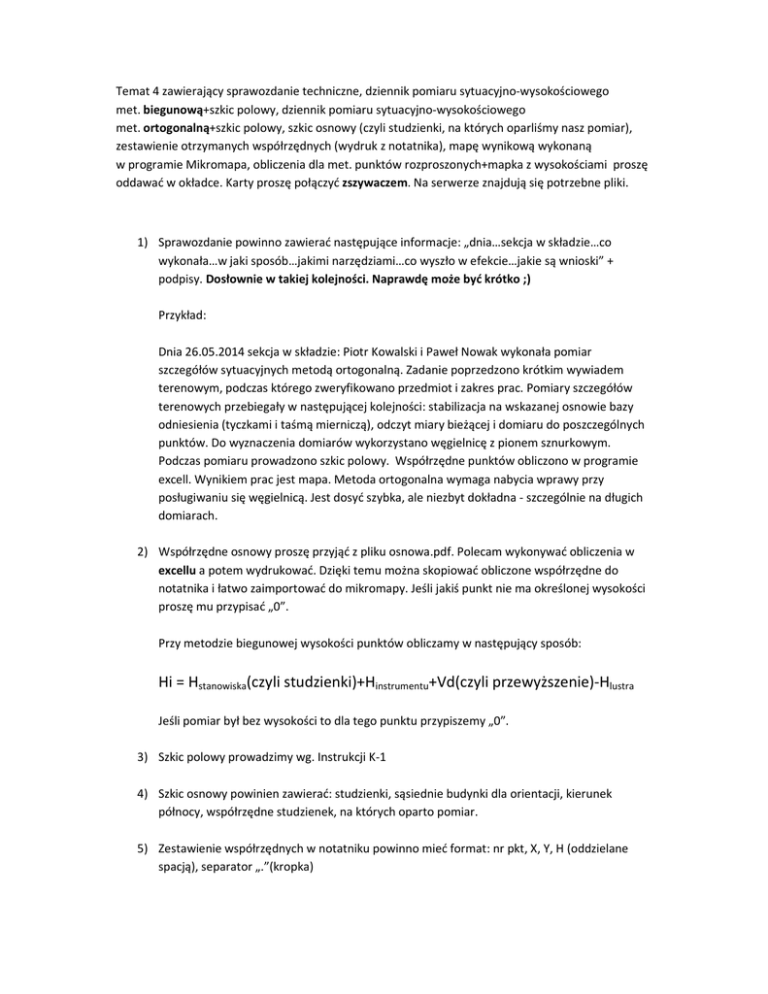 Temat 4 zawierający sprawozdanie techniczne, dziennik pomiaru sytuacyjno-wysokościowego met. biegunową+szkic polowy, dziennik pomiaru sytuacyjno-wysokościowego met. ortogonalną+szkic polowy, szkic osnowy (czyli studzienki, na których oparliśmy nasz pomiar), zestawienie otrzymanych współrzędnych (wydruk z notatnika), mapę wynikową wykonaną w programie Mikromapa, obliczenia dla met. punktów rozproszonych+mapka z wysokościami proszę oddawać w okładce. Karty proszę połączyć zszywaczem. Na serwerze znajdują się potrzebne pliki. 1) Sprawozdanie powinno zawierać następujące informacje: „dnia…sekcja w składzie…co wykonała…w jaki sposób…jakimi narzędziami…co wyszło w efekcie…jakie są wnioski” + podpisy. Dosłownie w takiej kolejności. Naprawdę może być krótko ;) Przykład: Dnia 26.05.2014 sekcja w składzie: Piotr Kowalski i Paweł Nowak wykonała pomiar szczegółów sytuacyjnych metodą ortogonalną. Zadanie poprzedzono krótkim wywiadem terenowym, podczas którego zweryfikowano przedmiot i zakres prac. Pomiary szczegółów terenowych przebiegały w następującej kolejności: stabilizacja na wskazanej osnowie bazy odniesienia (tyczkami i taśmą mierniczą), odczyt miary bieżącej i domiaru do poszczególnych punktów. Do wyznaczenia domiarów wykorzystano węgielnicę z pionem sznurkowym. Podczas pomiaru prowadzono szkic polowy. Współrzędne punktów obliczono w programie excell. Wynikiem prac jest mapa. Metoda ortogonalna wymaga nabycia wprawy przy posługiwaniu się węgielnicą. Jest dosyć szybka, ale niezbyt dokładna - szczególnie na długich domiarach. 2) Współrzędne osnowy proszę przyjąć z pliku osnowa.pdf. Polecam wykonywać obliczenia w excellu a potem wydrukować. Dzięki temu można skopiować obliczone współrzędne do notatnika i łatwo zaimportować do mikromapy. Jeśli jakiś punkt nie ma określonej wysokości proszę mu przypisać „0”. Przy metodzie biegunowej wysokości punktów obliczamy w następujący sposób: Hi = Hstanowiska(czyli studzienki)+Hinstrumentu+Vd(czyli przewyższenie)-Hlustra Jeśli pomiar był bez wysokości to dla tego punktu przypiszemy „0”. 3) Szkic polowy prowadzimy wg. Instrukcji K-1 4) Szkic osnowy powinien zawierać: studzienki, sąsiednie budynki dla orientacji, kierunek północy, współrzędne studzienek, na których oparto pomiar. 5) Zestawienie współrzędnych w notatniku powinno mieć format: nr pkt, X, Y, H (oddzielane spacją), separator „.”(kropka) 6) Mapę proszę wykonać w programie Mikromapa. 30-sto dniowy trial można pobrać tu: http://www.coder.pl/demo.htm Instrukcja w filmiku na geoedu.pl Jeśli ktoś nie posiada drukarki. Mapę można najpierw wydrukować do pdf-a a potem w punkcie druku. Polecam darmowy program pdf995 - http://www.pdf995.com/ Dla pomiarów metodą niwelacji punktów rozproszonych (z tematu 3) obliczamy współrzędne XYH (jest to metoda biegunowa – mamy nawiązanie, kierunki poziome i odległości do punktów, H obliczone już przy temacie 3). Osnowę proszę przyjąć z konspektu: A (x=0,y=0, h=150), B (x=100, y=100). Proszę wykonać drugą mapkę tylko z tymi wysokościami (w Mikromapie).