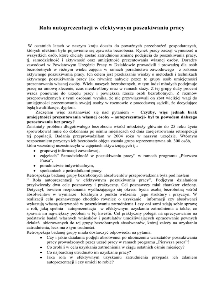 Rola autoprezentacji w efektywnym poszukiwaniu pracy W ostatnich latach w naszym kraju doszło do poważnych przeobrażeń gospodarczych, których efektem było pojawienie się zjawiska bezrobocia. Rynek pracy zaczął wymuszać u wszystkich osób, które chciały zostać zatrudnione zmianę podejścia do poszukiwania pracy, tj. samodzielność i aktywność oraz umiejętność prezentowania własnej osoby. Doradcy zawodowi w Powiatowym Urzędzie Pracy w Działdowie prowadzili i prowadzą dla osób bezrobotnych w różnym wieku zajęcia w ramach poradnictwa zawodowego z zakresu aktywnego poszukiwania pracy. Ich celem jest przekazanie wiedzy o metodach i technikach aktywnego poszukiwania pracy jak również nabycie przez te grupy osób umiejętności prezentowania własnej osoby. Wielu naszych bezrobotnych, w tym ludzi młodych podejmuje pracę na umowę zlecenie, czas nieokreślony oraz w ramach staży. Z tej grupy duży procent wraca ponownie do urzędu pracy i powiększa rzesze osób bezrobotnych. Z rozmów przeprowadzonych z tymi osobami wynika, że nie przywiązywali on zbyt wielkiej wagi do umiejętności prezentowania swojej osoby w rozmowie z pracodawcą sądzili, że decydujące będą kwalifikacje, dyplom. Zaczęłam więc zastanawiać się nad pytaniem Czyżby, więc jednak brak umiejętności prezentowania własnej osoby – autoprezentacji- był tu powodem dalszego pozostawania bez pracy? Zaistniały problem długotrwałego bezrobocia wśród młodzieży głównie do 25 roku życia sprowokował mnie do dokonania po ośmiu miesiącach od dnia zarejestrowania retrospekcji tej populacji. Badania przeprowadziłam w 2004 roku w naszym urzędzie. Wtórnym rozpoznaniem przyczyn ich bezrobocia objęta została grupa reprezentatywna ok. 300 osób, która wcześniej uczestniczyła w zajęciach aktywizujących tj.: grupowej informacji zawodowej, zajęciach” Samodzielność w poszukiwaniu pracy” w ramach programu „Pierwsza Praca”, poradnictwie indywidualnym, spotkaniach z pośrednikami pracy. Retrospekcja badanej grupy bezrobotnych absolwentów przeprowadzona była pod hasłem ” Rola autoprezentacji w efektywnym poszukiwaniu pracy”. Podjętym działaniom przyświecały dwa cele poznawczy i praktyczny. Cel poznawczy miał charakter złożony. Dotyczył, bowiem rozpoznania wydłużającego się okresu bycia osobą bezrobotną wśród absolwentów w wymiarze lokalnym z punktu widzenia jego struktury i przyczyn. W realizacji celu poznawczego chodziło również o uzyskanie informacji czy absolwenci wykazują własną aktywność w poszukiwaniu zatrudnienia i czy oni sami zdają sobie sprawę z roli, jaką spełnia autoprezentacja w efektywnym uzyskaniu zatrudnienia a także, co sprawia im największy problem w tej kwestii. Cel praktyczny polegał na sprecyzowaniu na podstawie badań własnych wniosków i postulatów umożliwiających opracowanie pewnych działań skierowanych do tej grupy bezrobotnych absolwentów, której zależy na uzyskaniu zatrudnienia, lecz ma z tym trudności. Retrospekcja badanej grupy miała dostarczyć odpowiedzi na pytania: Czy i jakie działania podjęli absolwenci po ukończeniu warsztatów poszukiwania pracy prowadzonych przez urząd pracy w ramach programu „Pierwsza praca”? Co zrobili w celu uzyskania zatrudnienia w ciągu ostatnich ośmiu miesięcy? Co najbardziej utrudniało im uzyskanie pracy? Jaka rola w efektywnym uzyskaniu zatrudnienia przypada ich zdaniem autoprezentacji i czy umieli to robić? Ze względu na cel i przedmiot diagnozy zastosowałam metodę badań socjologicznych. Była nią metoda sondażu diagnostycznego, która „jest sposobem gromadzenia wiedzy o atrybutach strukturalnych i funkcjonalnych oraz dynamice zjawisk społecznych, opiniach i poglądach wybranych zbiorowości, nasilaniu się i kierunkach rozwoju określonych zjawisk i wszelkich innych zjawisk instytucjonalnie nie zlokalizowanych - posiadających znaczenie wychowawcze – w oparciu o specjalnie dobraną grupę reprezentującą populację generalną, w której badane zjawisko występuje”1. Zgodnie z przyjętą metodą w diagnozie zastosowałam takie techniki badawcze jak: ankieta – karta usług doradczych, wywiad oraz obserwacja. Przeprowadzony przez mnie do celów diagnozy wywiad, był jawny, gdyż młodzież była poinformowana o celach, charakterze i przedmiocie wywiadu. Jako narzędzie badawcze wykorzystałam kwestionariusz ankiety – w moim przypadku zastosowałam kartę usług doradczych – podstawowy dokument wykorzystywany przez doradcę zawodowego w poradnictwie indywidualnym i wywiadu według opracowanych wcześniej dyspozycji. W ramach retrospekcji zastosowano następującą kolejność działań: - prezentację celu proponowanego programu spotkania, - dokonanie przez absolwentów autoprezentacji w formie pisemnej i wizualnej w Karcie Usług Doradczych, w której znajdują się wszechstronne informacje o kliencie i jego sytuacji życiowej, -dokonanie przez uczestników badanej grupy werbalnej prezentacji własnej osoby na forum grupy, -podsumowanie zajęć i wyciagnięcie wniosków. Wszystkim uczestnikom retrospekcji przedstawiono cel i proponowany program zajęć. Mieli oni możliwość wniesienia własnych uwag i propozycji. Poprzez wprowadzenie takiego elementu uzyskałam bardziej pozytywne nastawienie uczestników do współpracy i współodpowiedzialności za wyniki zajęć. Kolejnym krokiem była pisemna autoprezentacja absolwentów dokonana w Karcie Usług Doradczych. Potraktowałam ją jako swoiste C.V.– ankietę - każdego z uczestników, która z pomocą osób prowadzących zajęcia została wypełniona według zawartych w niej następujących grup informacji: - dane personalne, - kwalifikacje, umiejętności, zainteresowania ( poziom wykształcenia, zawód i specjalizacja, specyficzne kwalifikacje, zawody wykonywane, doświadczenie zawodowe w zawodach wyuczonych i wykonywanych, czynności o znaczeniu zawodowym wykonywane w czasie wo