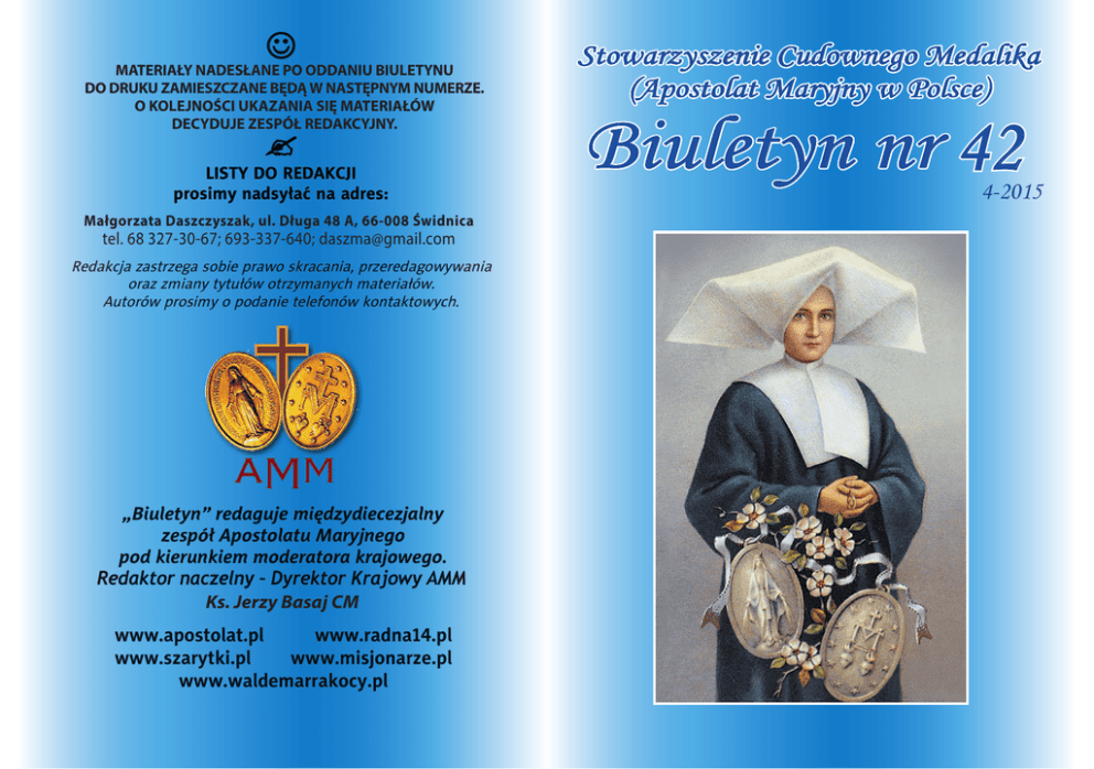 - - MATERIA�Y NADES�ANE PO ODDANIU BIULETYNU MATERIAŁY NADESŁANE PO W ODDANIU BIULETYNU DO DRUKU ZAMIESZCZANE B�D� NAST�PNYM NUMERZE. MATERIA�Y NADES�ANE PO ODDANIU BIULETYNU DO DRUKU ZAMIESZCZANE BĘDĄ W NASTĘPNYM NUMERZE. O KOLEJNO�CI UKAZANIA SI� MATERIA�ÓW DO DRUKU ZAMIESZCZANE B�D� W NAST�PNYM NUMERZE. O KOLEJNOŚCI UKAZANIA SIĘ MATERIAŁÓW DECYDUJE REDAKTOR NACZELNY. MATERIAŁY NADESŁANE PO ODDANIU BIULETYNU O KOLEJNO�CI UKAZANIA SI� MATERIA�ÓW DECYDUJE ZESPÓŁ REDAKCYJNY. DO DRUKU ZAMIESZCZANE BĘDĄ W NASTĘPNYM NUMERZE. DECYDUJE REDAKTOR NACZELNY. MATERIAŁY NADESŁANE PO ODDANIU BIULETYNU O KOLEJNOŚCI UKAZANIA SIĘ MATERIAŁÓW " DO DRUKU ZAMIESZCZANE BĘDĄ W NASTĘPNYM NUMERZE. DECYDUJE ZESPÓŁ REDAKCYJNY. " O KOLEJNOŚCI UKAZANIA SIĘ MATERIAŁÓW LISTY DO REDAKCJI DECYDUJE ZESPÓŁ REDAKCYJNY. prosimy na adres: LISTYnadsy�a� DO REDAKCJI Ewa Zajdel, ul. Topolowa Raszyn prosimy nadsy�a� na adres: Małgorzata Daszczyszak, ul. Długa2, 4805-090 A, 66-008 Świdnica tel. 22 720-19-18; 501-893-488; [email protected] Ewa Zajdel, ul. Topolowa 2, 05-090 Raszyn tel. 68 327-30-67; 693-337-640; [email protected] LISTY DO REDAKCJI Stowarzyszenie Cudownego Medalika (Apostolat Maryjny w Polsce) Biuletyn nr 42 4-2015 tel. 22zastrzega 720-19-18; 501-893-488; LISTY DO REDAKCJI prosimy nadsyłać [email protected] adres: Redakcja sobie prawo skracania, przeredagowywania prosimy nadsyłać na adres: oraz zmiany tytu�ów otrzymanych materia�ów. Ewa Zajdel, ul. Topolowa 2, 05-090 Raszyn Redakcja zastrzega sobie prawo skracania, przeredagowywania Autorów prosimyul. o501-893-488; podanie telefonów kontaktowych. Ewa Zajdel, Topolowa 2, 05-090 Raszyn tel. 22 720-19-18; [email protected] oraz zmiany tytu�ów otrzymanych materia�ów. Autorów prosimy o501-893-488; podanie telefonów kontaktowych. tel. 22 720-19-18; [email protected] Redakcja zastrzega sobie prawo skracania, przeredagowywania Redakcjaoraz zastrzega prawo skracania, materiałów. przeredagowywania zmianysobie tytułów otrzymanych oraz zmiany otrzymanych Autorów prosimytytułów o podanie telefonówmateriałów. kontaktowych. „Biuletyn” Autorów prosimyredaguje o podanie mi�dzydiecezjalny telefonów kontaktowych. zespó� redaguje Apostolatu Maryjnego „Biuletyn” mi�dzydiecezjalny MEDALIK pod kierunkiem moderatora krajowego. zespó� Apostolatu Maryjnego MEDALIK Redaktor naczelny moderatora – Dyrektor Krajowy AMM pod kierunkiem krajowego. Ks. Tadeusz LubelskiKrajowy CM Redaktor naczelny – Dyrektor AMM oraz Zast�pca Dyrektora Krajowego Ks. Tadeusz CM „Biuletyn” redagujeLubelski międzydiecezjalny Ks.redaguje Jacek Wachowiak oraz Zast�pca Dyrektora Krajowego „Biuletyn” międzydiecezjalny zespół Apostolatu Maryjnego Ks. Jacek Wachowiak zespół Apostolatu Maryjnego www.apostolat.pl pod kierunkiem moderatora krajowego. pod kierunkiem moderatora krajowego. www.apostolat.pl www.szarytki.pl www.misjonarze.pl Redaktor naczelny – Dyrektor Krakowy AMM Redaktor naczelny – Dyrektor Krakowy Redaktor naczelny – Dyrektor Krajowy AMM AMM www.szarytki.pl www.misjonarze.pl www.waldemarrakocy.pl Ks. Jacek Wachowiak CM Ks. Ks. Jacek Wachowiak Jerzy Basaj CM CM www.waldemarrakocy.pl 4 4 www.apostolat.pl www.radna14.pl www.apostolat.pl www.radna14.pl www.szarytki.pl www.misjonarze.pl www.szarytki.pl www.misjonarze.pl www.waldemarrakocy.pl www.waldemarrakocy.pl 44 J.E bp. Józef Zawitkowski przewodniczył uroczystej Mszy św. z okazji 185 rocznicy Objawień HASŁO FORMACYJNE ROKU 2016 „Maryja Matka Boża Miłosierdzia – prowadzi do miłosiernej miłości Boga” Wspólnota AMM na Jubileuszu 15-lecia w Krupskim Młynie obrazka z katalogu WITKM 0055 20-lecie w Lisowicach Uroczystość 20-lecia AMM w Pionkach Wszystkim, tworzącym naszą wspólnotę Apostolatu Maryjnego, Błogosławionych Świąt Bożego Narodzenia i dobrego, pełnego łaskawości Bożej Nowego Roku, Wszystkim, tworzącym naszą wspólnotę życzy zespół redakcyjny Biuletynu Apostolatu Maryjnego, Błogosławionych Świąt Bożego Narodzenia i dobrego, pełnego łaskawości Bożej Nowego Roku, życzy zespół redakcyjny Biuletynu 2 Uczestnicy Diecezjalnego Dnia Skupienia w Otyniu 30-lecie w Gozdnicy SŁOWO DYREKTORA KRAJOWEGO Warszawa, 2015 r. Kochani Czciciele Niepokalanej, Dawanie świadectwa zawsze było podstawowym powołaniem uczniów Chrystusa i codziennym sposobem życia. Często nie było to łatwe. Także dziś wiemy o tym, że tak wielu chrześcijan na całym świecie, dając świadectwo o Chrystusie, nieraz jest wykluczonych ze społeczeństwa, a nawet musi płacić najwyższą cenę, jaką jest własne życie. Odważne dawanie świadectwa wiary staje się coraz ważniejsze. Pierwszym i najważniejszym świadkiem Chrystusa była Jego Matka. To Ona całe swoje życie poświęciła Jemu, jako Służebnica Pańska. To Ona wytrwała przy swoim Synu wiszącym na krzyżu, mimo szyderstw i bluźnierstw otoczenia. Chcąc się uczyć dawania świadectwa, musimy najpierw spojrzeć na Matkę Chrystusa i od Niej czerpać siłę i moc do mężnego stania przy Zbawicielu nawet w chwilach bardzo trudnych. Sobór Watykański II, w Konstytucji dogmatycznej o Kościele Lumen gentium, ukazuje nam Maryję jako pierwowzór (typus) dla Kościoła i wszystkich chrześcijan. Oto te słowa: „Błogosławiona zaś Dziewica z racji daru i roli boskiego macierzyństwa, dzięki czemu jednoczy się z synem Odkupicielem, i z racji swoich szczególnych łask i darów związana 3 jest głęboko także z Kościołem: Boża Rodzicielka jest, jak uczył już św. Ambroży, pierwowzorem (typus) Kościoła, w porządku mianowicie wiary, miłości i doskonałego zjednoczenia z Chrystusem” (Sobór Watykański II, Konstytucja dogmatyczna o Kościele Lumen gentium, nr 63). Ukazywanie kogoś jako wzoru do naśladowania jest możliwe tylko wtedy, gdy osoby, mające naśladować dany ideał, posiadają naturę, uwarunkowan