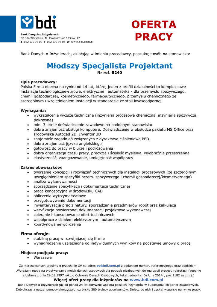 OFERTA PRACY Bank Danych o Inżynierach 02-304 Warszawa, Al. Jerozolimskie 133 lok. 42 T 022 572 78 00 F 022 572 78 03 W www.bdi.com.pl Bank Danych o Inżynierach, działając w imieniu pracodawcy, poszukuje osób na stanowisko: Młodszy Specjalista Projektant Nr ref. 8240 Opis pracodawcy: Polska Firma obecna na rynku od 14 lat, której jeden z profili działalności to kompleksowe instalacje technologiczne-rurowe, elektryczne i automatyka - dla przemysłu spożywczego, chemii gospodarczej, kosmetycznego, farmaceutycznego, przemysłu chemicznego ze szczególnym uwzględnieniem instalacji w standardzie ze stali kwasoodpornej. Wymagania: wykształcenie wyższe techniczne (inżynieria procesowa chemiczna, inżynieria spożywcza, pokrewne) min. 3 letnie doświadczenie zawodowe na podobnym stanowisku dobra znajomość obsługi komputera. Doświadczenie w obsłudze pakietu MS Office oraz środowiska Autocad 2D, Inventor 3D znajomość zagadnień związanych z dyrektywą ciśnieniową PED dobra znajomość języka angielskiego gotowość do pracy w biurze i podróżowania dobra organizacja czasu pracy, precyzja i ścisłość myślenia, wyobraźnia przestrzenna elastyczność, zaangażowanie, umiejętność współpracy Zakres obowiązków: tworzenie koncepcji i rozwiązań technicznych dla instalacji procesowych (ze szczególnym uwzględnieniem specyfiki przem. spożywczego i chemii gospodarczej/kosmetycznego) analiza wykonywalności sporządzanie specyfikacji i dokumentacji technicznej praca koncepcyjna w środowisku CAD obliczenia wytrzymałościowe przygotowywanie dokumentacji inwentaryzacja prac z natury, sporządzanie przedmiarów robót oraz kalkulacji weryfikacja powierzonej dokumentacji projektowo wykonawczej zbieranie i konsultowanie ofert technicznych współpraca z działem elektrycznym i automatycznym koordynowanie wdrożenia Firma oferuje: stabilną pracę w rozwijającej się firmie wynagrodzenie uzależnione od indywidualnych wyników na podstawie umowy o pracę Miejsce podjęcia pracy: Warszawa Zainteresowanych prosimy o przesłanie CV na adres [email protected] z podaniem numeru referencyjnego oraz dopiskiem: „Wyrażam zgodę na przetwarzanie moich danych osobowych dla potrzeb niezbędnych do realizacji procesu rekrutacji (zgodnie z Ustawą z dnia 29.08.1997 roku o Ochronie Danych Osobowych; tekst jednolity: Dz.U. z 2014r., poz.1182 ze zm.).” Więcej ofert pracy dla inżynierów na www.bdi.com.pl Bank Danych o Inżynierach już od ponad 24 lat aktywnie wspiera polskich inżynierów w budowaniu ich karier zawodowych. Dotychczas z naszej pomocy skorzystało już blisko 200 tysięcy absolwentów. Dołącz do nich i zyskaj wsparcie na rynku pracy.