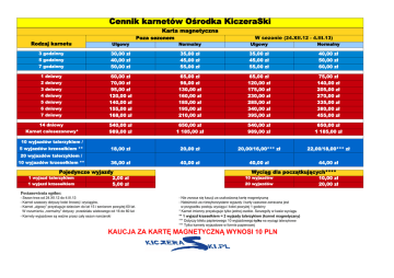 Cennik karnetów Ośrodka KiczeraSki Karta magnetyczna Poza sezonem W sezonie (24.XII.12 - 4.III.13) Rodzaj karnetu Ulgowy Normalny Ulgowy Normalny 3 godzinny 30,00 zł 40,00 zł 50,00 zł 35,00 zł 45,00 zł 55,00 zł 35,00 zł 45,00 zł 55,00 zł 40,00 zł 50,00 zł 60,00 zł 60,00 zł 70,00 zł 95,00 zł 120,00 zł 140,00 zł 155,00 zł 168,00 zł 65,00 zł 98,00 zł 130,00 zł 160,00 zł 185,00 zł 195,00 zł 210,00 zł 65,00 zł 120,00 zł 175,00 zł 230,00 zł 285,00 zł 340,00 zł 395,00 zł 75,00 zł 140,00 zł 205,00 zł 270,00 zł 335,00 zł 380,00 zł 455,00 zł 540,00 zł 989,00 zł 650,00 zł 1 185,00 zł 540,00 zł 989,00 zł 650,00 zł 1 185,00 zł 18,00 zł 20,00 zł 20,00/16,00*** zł 22,00/18,00*** zł 36,00 zł 40,00 zł 40,00 zł 44,00 zł 5 godzinny 7 godzinny 1 dniowy 2 dniowy 3 dniowy 4 dniowy 5 dniowy 6 dniowy 7 dniowy 14 dniowy Karnet całosezonowy* 10 wyjazdów talerzykiem / 5 wyjazdów krzesełkiem ** 20 wyjazdów talerzykiem / 10 wyjazdów krzesełkiem ** Pojedyncze wyjazdy 1 wyjazd talerzykiem 1 wyjazd krzesełkiem 2,00 zł 5,00 zł Wyciąg dla początkujących**** 10 wyjazdów 20 wyjazdów Postanowienia ogólne: - Sezon trwa od 24.XII.12 do 4.III.13 - Karnet czasowy dotyczy kolei linowej i wyciągów. - Karnet „ulgowy” przysługuje dzieciom do lat 15 i seniorom powyżej 60 lat. W rozumieniu „normalny" dotyczy przedziału wiekowego od 16 do 60 lat - Karnety wyjazdowe są ważne przez cały sezon narciarski - Nie zwraca się kaucji za uszkodzoną kartę magnetyczną - Należność za niewykorzystane wyjazdy i karty czasowe zwracana jest w przypadku postoju wyciągu i kolei powyżej 1 godziny * Karnet imienny przysługuje tylko jednej osobie. Szczegóły w kasie wyciągu ** 1 wyjazd krzesełkiem = 2 wyjazdy talerzykiem (karnet magnetyczny) *** Dotyczy biletu papierowego 10 wyjazdowego tylko na wyciągi talerzykowe *** Tylko karnety wyjazdowe w formie papierowej KAUCJA ZA KARTĘ MAGNETYCZNĄ WYNOSI 10 PLN 10,00 zł 20,00 zł