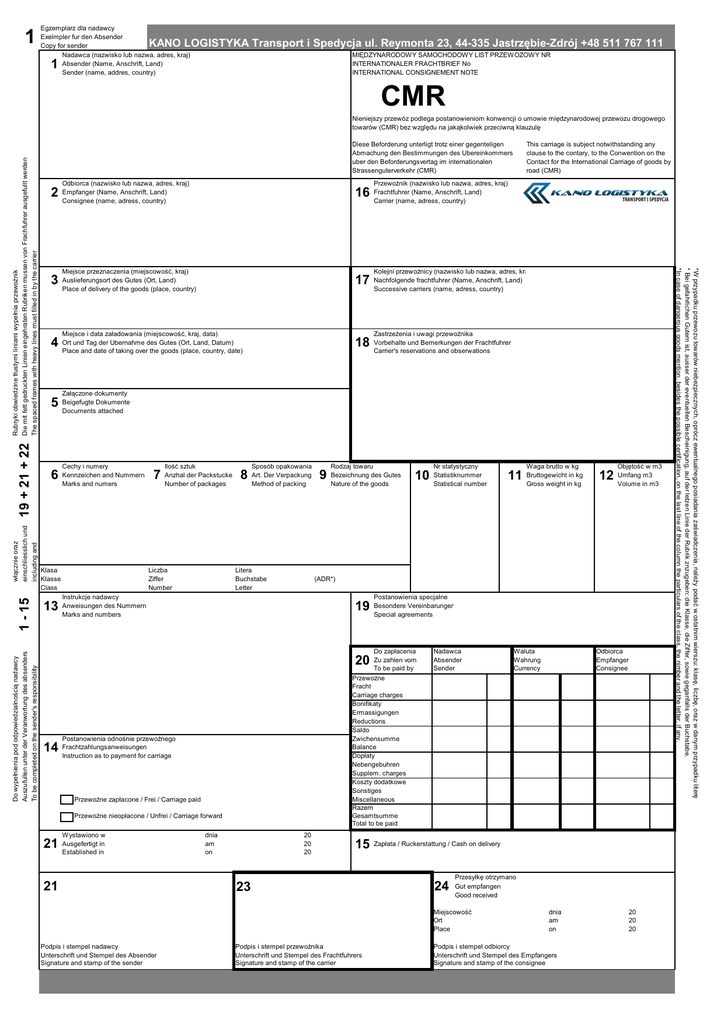 1 Egzemplarz dla nadawcy Exelmpler fur den Absender Copy for sender Nadawca (nazwisko lub nazwa, adres, kraj) Absender (Name, Anschrift, Land) Sender (name, addres, country) KANO LOGISTYKA Transport i Spedycja ul. Reymonta 23, 44-335 Jastrzębie-Zdrój +48 511 767 111 MIĘDZYNARODOWY SAMOCHODOWY LIST PRZEWOZOWY NR INTERNATIONALER FRACHTBRIEF No INTERNATIONAL CONSIGNEMENT NOTE 1 CMR 19 + 21 + 22 włącznie oraz einschliesslich und including and 1 - 15 Do wypełnienia pod odpowiedzialnością nadawcy Auszufullen unter der Veranwortung des absenders To be completed on the sender's responsibility Diese Beforderung unterligt trotz einer gegenteligen Abmachung den Bestimmungen des Ubereinkommers uber den Beforderungsvertag im internationalen Strassenguterverkehr (CMR) This carriage is subject notwithstanding any clause to the contary, to the Conwention on the Contact for the International Carriage of goods by road (CMR) 2 Odbiorca (nazwisko lub nazwa, adres, kraj) Empfanger (Name, Anschrift, Land) Consignee (name, adress, country) 16 Przewoźnik (nazwisko lub nazwa, adres, kraj) Frachtfuhrer (Name, Anschrift, Land) Carrier (name, adress, country) 3 Miejsce przeznaczenia (miejscowość, kraj) Auslieferungsort des Gutes (Ort, Land) Place of delivery of the goods (place, country) 17 Kolejni przewoźnicy (nazwisko lub nazwa, adres, kraj) Nachfolgende frachtfuhrer (Name, Anschrift, Land) Successive carriers (name, adress, country) 4 Miejsce i data załadowania (miejscowość, kraj, data) Ort und Tag der Ubernahme des Gutes (Ort, Land, Datum) Place and date of taking over the goods (place, country, date) 18 Zastrzeżenia i uwagi przewoźnika Vorbehalte und Bemerkungen der Frachtfuhrer Carrier's reservations and obserwations 5 Załączone dokumenty Beigefugte Dokumente Documents attached 6 Cechy i numery Kennzeichen and Nummern Marks and numers Klasa Klasse Class 13 7 Ilość sztuk Anzhal der Packstucke Number of packages Liczba Ziffer Number 8 Sposób opakowania Art. Der Verpackung Method of packing Litera Buchstabe Letter 9 Rodzaj towaru Bezeichnung des Gutes Nature of the goods Instrukcje nadawcy Anweisungen des Nummern Marks and numbers 19 Postanowienia odnośnie przewoźnego Frachtzahlungsanweisungen Instruction as to payment for carriage Przewoźne nieopłacone / Unfrei / Carriage forward Wystawiono w Ausgefertigt in Established in 21 dnia am on 20 20 20 15 23 Nadawca Absender Sender Waga brutto w kg Bruttogewicht in kg Gross weight in kg 12 Objętość w m3 Umfang m3 Volume in m3 Podpis i stempel przewoźnika Unterschrift und Stempel des Frachtfuhrers Signature and stamp of the carrier Waluta Wahrung Currency Odbiorca Empfanger Consignee Zapłata / Ruckerstattung / Cash on delivery 24 Przesyłkę otrzymano Gut empfangen Good received Miejscowość Ort Place Podpis i stempel nadawcy Unterschrift und Stempel des Absender Signature and stamp of the sender 11 Postanowienia specjalne Besondere Vereinbarungen Special agreements Do zapłacenia Zu zahlen vom To be paid by Przewoźne Fracht Carriage charges Bonifikaty Ermassigungen Reductions Saldo Zwichensumme Balance Dopłaty Nebengebuhren Supplem. charges Koszty dodatkowe Sonstiges Miscellaneous Razem Gesamtsumme Total to be paid Przewoźne zapłacone / Frei / Carriage paid 21 Nr statystyczny Statistiknummer Statistical number (ADR*) 20 14 10 dnia am on Podpis i stempel odbiorcy Unterschrift und Stempel des Empfangers Signature and stamp of the consignee 20 20 20 *W przypadku przewozu towarów niebezpiecznych, oprócz ewentualnego posiadania zaświadczenia, należy podać w ostatnim wierszu: klasę, liczbę, oraz w danym przypadku literę * Bei gefahrlichen Gutern ist, ausser der eventuellen Bescheinigung, auf der letzen Linie der Rubrik znzugeben: die Klasse, die Ziffer, sowie geganfalls der Buchstabe. *In case of dangerous goods mention, besides the possible certification, on the last line of the column the particulars of the class, the nimber and the letter, if any. Rubryki obwiedzine tłustymi liniami wypełnia przewoźnik Die mit fett gedruckten Linien eingehraten Rubriken mussen von Frachfuhrer ausgefullt werden The spaced frames with heavy lines must filled in by the carrier Nieniejszy przewóz podlega postanowieniom konwencji o umowie międzynarodowej przewozu drogowego towarów (CMR) bez względu na jakąkolwiek przeciwną klauzulę