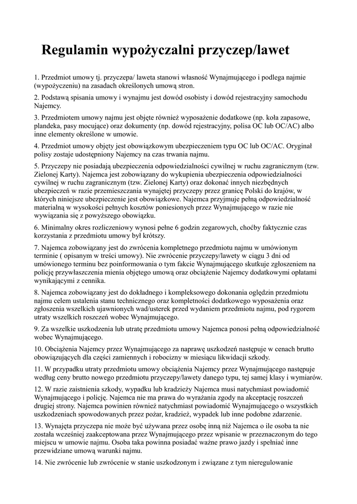 Regulamin wypożyczalni przyczep/lawet 1. Przedmiot umowy tj. przyczepa/ laweta stanowi własność Wynajmującego i podlega najmie (wypożyczeniu) na zasadach określonych umową stron. 2. Podstawą spisania umowy i wynajmu jest dowód osobisty i dowód rejestracyjny samochodu Najemcy. 3. Przedmiotem umowy najmu jest objęte również wyposażenie dodatkowe (np. koła zapasowe, plandeka, pasy mocujące) oraz dokumenty (np. dowód rejestracyjny, polisa OC lub OC/AC) albo inne elementy określone w umowie. 4. Przedmiot umowy objęty jest obowiązkowym ubezpieczeniem typu OC lub OC/AC. Oryginał polisy zostaje udostępniony Najemcy na czas trwania najmu. 5. Przyczepy nie posiadają ubezpieczenia odpowiedzialności cywilnej w ruchu zagranicznym (tzw. Zielonej Karty). Najemca jest zobowiązany do wykupienia ubezpieczenia odpowiedzialności cywilnej w ruchu zagranicznym (tzw. Zielonej Karty) oraz dokonać innych niezbędnych ubezpieczeń w razie przemieszczania wynajętej przyczepy przez granicę Polski do krajów, w których niniejsze ubezpieczenie jest obowiązkowe. Najemca przyjmuje pełną odpowiedzialność materialną w wysokości pełnych kosztów poniesionych przez Wynajmującego w razie nie wywiązania się z powyższego obowiązku. 6. Minimalny okres rozliczeniowy wynosi pełne 6 godzin zegarowych, choćby faktycznie czas korzystania z przedmiotu umowy był krótszy. 7. Najemca zobowiązany jest do zwrócenia kompletnego przedmiotu najmu w umówionym terminie ( opisanym w treści umowy). Nie zwrócenie przyczepy/lawety w ciągu 3 dni od umówionego terminu bez poinformowania o tym fakcie Wynajmującego skutkuje zgłoszeniem na policję przywłaszczenia mienia objętego umową oraz obciążenie Najemcy dodatkowymi opłatami wynikającymi z cennika. 8. Najemca zobowiązany jest do dokładnego i kompleksowego dokonania oględzin przedmiotu najmu celem ustalenia stanu technicznego oraz kompletności dodatkowego wyposażenia oraz zgłoszenia wszelkich ujawnionych wad/usterek przed wydaniem przedmiotu najmu, pod rygorem utraty wszelkich roszczeń wobec Wynajmującego. 9. Za wszelkie uszkodzenia lub utratę przedmiotu umowy Najemca ponosi pełną odpowiedzialność wobec Wynajmującego. 10. Obciążenia Najemcy przez Wynajmującego za naprawę uszkodzeń następuje w cenach brutto obowiązujących dla części zamiennych i robocizny w miesiącu likwidacji szkody. 11. W przypadku utraty przedmiotu umowy obciążenia Najemcy przez Wynajmującego następuje według ceny brutto nowego przedmiotu przyczepy/lawety danego typu, tej samej klasy i wymiarów. 12. W razie zaistnienia szkody, wypadku lub kradzieży Najemca musi natychmiast powiadomić Wynajmującego i policję. Najemca nie ma prawa do wyrażania zgody na akceptację roszczeń drugiej strony. Najemca powinien również natychmiast powiadomić Wynajmującego o wszystkich uszkodzeniach spowodowanych przez pożar, kradzież, wypadek lub inne podobne zdarzenie. 13. Wynajęta przyczepa nie może być używana przez osobę inną niż Najemca o ile osoba ta nie została wcześniej zaakceptowana przez Wynajmującego przez wpisanie w przeznaczonym do tego miejscu w umowie najmu. Osoba taka powinna posiadać ważne prawo jazdy i spełniać inne przewidziane umową warunki najmu. 14. Nie zwrócenie lub zwrócenie w stanie uszkodzonym i związane z tym nieregulowanie należności za uszkodzenia, względnie przekroczenie ustalonego w Umowie terminu spowoduje skierowanie sprawy do Sądu. Wszelkie koszty związane z odzyskaniem sprzętu lub należności (łącznie z kosztami pośrednimi i sądowymi) ponosi Najemca. 15. Najemca jest w pełni odpowiedzialny za wszelkie roszczenia zgłoszone przez Wynajmującego, do których doszło podczas trwania umownego lub bezumownego najmu. 16. Najemca przyjmuje do wiadomości konieczność udostępnienia Wynajmującemu przyczepy/lawety w celu wykonania przeglądu technicznego w stacji diagnostycznej przed datą wskazaną w dowodzie rejestracyjnym. 17. Najemca może wykonać badanie techniczne we własnym zakresie po wcześniejszym ustaleniu z Wynajmującym warunków i opłat za dokonanie tej czynności. 18. Nie wolno obciążać przyczepy/lawety powyżej dopuszczalnej nośności określonej w dowodzie rejestracyjnym przyczepy. 19. W przypadku zwrotu przyczepy/lawety przed terminem nie będą zwracane należności za pozostały czas najmu. 20. Najemca odpowiada materialnie za wszelkie braki i uszkodzenia w przyczepie/lawecie i osprzęcie spowodowane przez Wynajmującego jak również spowodowane przez osoby trzecie w trakcie najmu. 21. Wynajmujący nie ponosi odpowiedzialności za mocowanie i sposób transportu przedmiotów przewożonych przez Najemcę. Ubezpieczenie przewożonych przedmiotów Najemca może dokonać we własnym zakresie. 22. Najemca podpisując umowę oświadcza że znane są mu przepisy kodeksu ruchu drogowego dotyczące użytkowania i poruszania się z przyczepami/lawetami oraz że posiada uprawnienia do holowania najmowanej przyczepy/lawety. 23. Zabronione jest dokonywanie przez Wypożyczającego, samodzielnych przeróbek czy modyfikacji w elementach konstrukcji i wyposażenia przyczepy/lawety (za wyjątkiem podstawowych czynności obsługowych tj. wymiana koła, wymiana żarówki i dokonanie innych czynności uzgodnionych z Wynajmującym). 24. Najemca wyraża zgodę na przetwarzanie danych osobowych w celach realizacji umowy oraz na przekazywanie ich osobom trzecim w wypadku wystąpienia roszczeń ubezpieczeniowych bądź prawnych. 25. W sprawach nieuregulowanych niniejszym regulaminem i podpisaną umową mają zastosowanie przepisy Kodeksu Cywilnego.