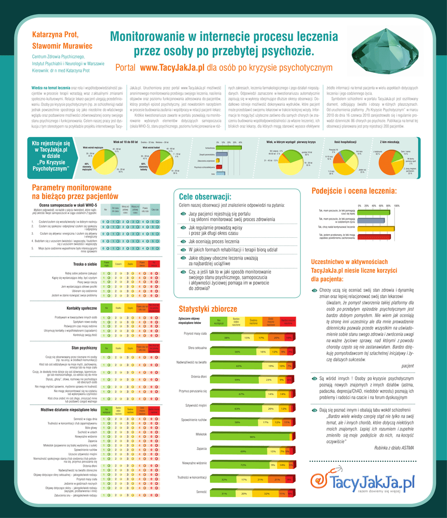 Monitorowanie w internecie procesu leczenia przez osoby po przebytej psychozie. Katarzyna Prot, Sławomir Murawiec Centrum Zdrowia Psychicznego, Instytut Psychiatrii i Neurologii w Warszawie Kierownik: dr n med Katarzyna Prot Portal www.TacyJakJa.pl dla osób po kryzysie psychotycznym JakJa.pl. Uruchomiona przez portal www.TacyJakJa.pl możliwość anonimowego monitorowania przebiegu swojego leczenia, nasilenia objawów oraz poziomu funkcjonowania adresowana do pacjentów, którzy przebyli epizod psychotyczny, jest nowatorskim narzędziem w procesie budowania zaufania i współpracy w relacji pacjent-lekarz. Krótkie kwestionariusze zawarte w portalu pozwalają na monitorowanie wybranych elementów dotyczących samopoczucia (skala WHO-5), stanu psychicznego, poziomu funkcjonowania w róż- Wiedza na temat leczenia oraz rola i współodpowiedzialność pacjentów w procesie terapii wzrastają wraz z aktualnymi zmianami społeczno-kulturowymi. Relacje lekarz-pacjent ulegają przedefiniowaniu. Osoby po kryzysie psychotycznym (np. ze schizofrenią) nadal jednak powszechnie spostrzega się jako niezdolne do właściwego wglądu oraz pozbawione możliwości zrównoważonej oceny swojego stanu psychicznego i funkcjonowania. Celem naszej pracy jest dyskusja z tym stereotypem na przykładzie projektu internetowego Tacy- Kto rejestruje się w TacyJakja.pl w dziale „Po Kryzysie Psychotycznym” Wiek od 18 do 60 lat Wiek wśród mężczyzn Średnia – 32 lata; Mediana – 30 lat Wiek wśród kobiet 40 - 60 lat 15 % 30 - 39 lat 35 % 30 - 39 lat 43 % 40% stanowią mężczyźni Wybierz odpowiedź, na każde z pięciu twierdzeń, które najlepiej określa Twoje samopoczucie w ciągu ostatnich 2 tygodni. 1. 2. Czułam/czułem się wesoła/wesoły i w dobrym nastroju Czułam się spokojna i odprężona/ czułem się spokojny i odprężony 3. Czułam się aktywna i energiczna / czułem się aktywny i energiczny 4. Budziłam się z uczuciem świeżości i wypoczęta / budziłem się z uczuciem świeżości i wypoczęty 5. Moje życie codzienne wypoełnione było interesującymi mnie sprawami Troska o siebie Robię sobie jedzenie (zakupy) Kąpię się wystarczająco żeby, być czystym Piorę swoje rzeczy Jem wystarczająco zdrowe posiłki Ubieram się codziennie Jestem w stanie rozwiązać swoje problemy Nie Możliwe działanie niepożądane leku Senność w ciągu dnia Trudności w koncentracji i/lub zapamiętywaniu Bóle głowy Suchość w ustach Niewyraźne widzenie Zaparcia Mlekotok (pojawienie się białej wydzieliny z sutek) Spowolnienie ruchów Uczucie sztywności mięśni Niemożność spokojnego stania i/lub siedzenia i/lub położenia się, przymus poruszania się Drżenia dłoni Nadwrażliwość na światło słoneczne Objawy dotyczące sfery seksualnej – jakiegokolwiek rodzaju Przyrost masy ciała Jedzenie w godzinach nocnych Objawy dotyczące skóry – jakirgokolwiek rodzaju (wysypki, przebarwienia i inne) Zaburzenia snu – jakiegokolwiek rodzaju Schizofrenia 56 i więcej - 0 % 46-55 lat - 2 % Zespół paranoidalny 19 - 29 lat 39 % 31 - 45 lat - 13 % 0 1 2 3 4 5 0 1 2 3 4 5 J ak regularnie prowadzą wpisy i przez jak długi okres czasu 0 1 2 3 4 5 Jak oceniają proces leczenia 0 1 2 3 4 5 W jakich formach rehabilitacji i terapii biorą udział Nie dotyczy 1 1 1 2 2 2 3 3 3 4 4 4 0 0 0 1 2 3 4 0 1 1 2 2 3 3 4 4 0 0 Nie Rzadko Często Nie chcę lub Prawie cały lub nie potrafię cały czas odpowiedzieć 1 1 1 2 2 2 3 3 3 4 4 4 0 0 0 1 2 3 4 0 1 2 3 4 0 Nie 1 Rzadko 2 Często 3 Nie chcę lub Prawie cały lub nie potrafię cały czas odpowiedzieć 4 2 3 4 0 1 2 3 4 0 Bardzo słabo nasilone 1 2 3 4 0 1 2 3 4 0 1 2 3 4 0 Dość mocno nasilone Średnio nasilone Bardzo mocno nasilone 15% 17% 20% 10% Sfera seksualna 56% 16% 12% 9% 7% 1 2 3 4 0 Nadwrażliwość na światło 63% Bardzo słabo nasilone Średnio nasilone Dość mocno nasilone 1 1 1 1 1 1 1 1 1 2 2 2 2 2 2 2 2 2 3 3 3 3 3 3 3 3 3 4 4 4 4 4 4 4 4 4 0 0 0 0 0 0 0 0 0 1 2 3 4 0 2 2 2 2 2 2 3 3 3 3 3 3 4 4 4 4 4 4 0 0 0 0 0 0 1 2 3 4 0 Spowolnienie ruchów 58% 9% 6% 14% 17% 12% 12% 11% 96% Zaparcia Niewyraźne widzenie Senność 7% 20% Mlekotok Trudności w koncentracji 10% 14% 63% Bardzo mocno nasilone 1 1 1 1 1 1 23% 67% Sztywność mięśni Nie występuje 19% 59% Przymus poruszania się 80% 100% Uczestnictwo w aktywnościach TacyJakJa.pl niesie liczne korzyści dla pacjenta: Przyrost masy ciała Drżenia dłoni 60% Tak, jestem przekonany, że leki mogą zapobiec powtórnemu zachorowaniu 0 1 40% Tak, chcę nadal kontynuować leczenie Statystyki zbiorcze 38% 20% Tak, mam poczucie, że leki pomagają w codziennym życiu zy, a jeśli tak to w jaki sposób monitorowanie C swojego stanu psychicznego, samopoczucia i aktywności życiowej pomaga im w powrocie do zdrowia? Nie występuje Z żoną /mężem; partnerem 23 % Jeden raz 23 % Tak, mam poczucie, że leki pomagają czuć się lepiej J akie objawy uboczne leczenia uważają za najbardziej uciążliwe Zgłaszane objawy niepożądane leków W domu pomocy społ. 2% 0% J acy pacjenci rejestrują się portalu i są skłonni monitorować swój proces zdrowienia 5 Prawie zawsze Sam / sama 13 % z todzicami 62 % 6-10 razy 16 % Celem naszej obserwacji jest znalezienie odpowiedzi na pytania: Cały czas Ani razu 19 % Podejście i ocena leczenia: 4 Zwykle Powyżej 10 3% Z kim mieszkają 18 - 30 lat 55 % Inne 3 Czasami Ilość hospitalizacji 1-5 razy 39 % 2 Prawie nigdy poniżej 18 lat 30 % Cele obserwacji: Mniej niż Więcej niż Prawie połowę połowę cały czas czasu czasu źródło informacji na temat pacjenta w wielu aspektach dotyczących leczenia i jego codziennego życia. Symbolem schizofrenii w portalu TacyJakJa.pl jest oszlifowany diament, odbijający światło i obrazy w różnych płaszczyznach. Od uruchomienia platformy „Po Kryzysie Psychotycznym” w marcu 2010 do dnia 16 czerwca 2010 zarejestrowało się i regularnie prowadzi dzienniczki 86 chorych po psychozie. Publikacja na temat t