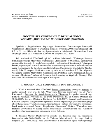 Ks. Paweł RABCZYŃSKI Wyz sze Seminarium Duchowne Metropolii Warmińskiej „Hosianum” w Olsztynie Studia Warmińskie XLIV-XLV (2007-2008) ROCZNE SPRAWOZDANIE Z DZIAŁALNOŚCI WSDMW „HOSIANUM” W OLSZTYNIE (2006/2007) Zgodnie z Regulaminem Wyz szego Seminarium Duchownego Metropolii Warmińskiej „Hosianum” w Olsztynie z dnia 17 września 2004 roku (Rozdział VII, § 2, p. 9), przedkłada sie Roczne Sprawozdanie z działalności Seminarium, które obejmuje okres od 1 września 2006 do 31 sierpnia 2007 roku. Rok akademicki 2006/2007 był 442. rokiem działalności Wyz szego Seminarium Duchownego Metropolii Warmińskiej „Hosianum” w Olsztynie. Seminarium prowadziło formacje do kapłaństwa zgodnie z zaleceniami Konferencji Episkopatu Polski, wyraz onymi w Ratio institutionis sacerdotalis pro Polonia, zatwierdzonymi przez Kongregacje ds. Wychowania Katolickiego (Seminariów i Instytutów Naukowych) dnia 26 sierpnia 1999 roku oraz zgodnie ze wskazaniami J.E. Ks. Abpa dra Wojciecha Ziemby Metropolity Warmińskiego. Podobnie jak w poprzednich latach, Alumni „Hosianum” odbywali formacje intelektualna na Wydziale Teologii Uniwersytetu Warmińsko-Mazurskiego w Olsztynie. I. MODERATORZY SEMINARIUM I INNI PRACOWNICY 1. W roku akademickim 2006/2007 Zarzad Seminarium tworzyli: Rektor: ks. prałat kanonik prof. zw. dr hab. Władysław Nowak; Wicerektor: ks. dr Paweł Rabczyński; Dyrektor ds. Administracyjnych (Ekonom): ks. prałat kanonik mgr Ludwik Kaniuga; Prefekci: ks. dr Piotr Dernowski, ks. dr Cezary Opalach (do 30.06.2007), ks. mgr Zdzisław Kieliszek (od 1.07.2007). Zarzad, pod kierunkiem Rektora, odbywał cotygodniowe spotkania w celu organizacji z ycia seminaryjnego i koordynacji pracy wychowawczej. Kompetencje i zakres obowiazków poszczególnych osób wyznaczał Statut i Regulamin „Hosianum”. Rektor, Wicerektor oraz Prefekci prowadzili w kaz da środe konferencje wychowawcze dla Alumnów zgodnie z harmonogramem ustalonym przez Rektora. 2. Funkcje Ojców Duchownych pełnili: ks. kanonik mgr lic. Kazimierz Dawcewicz (do 20.04.2007), ks. dr Tadeusz Marcinkowski, ks. mgr Andrzej Migrała (od 18.04.2007). Jako przewodnicy i mistrzowie z ycia wewnetrznego 252 KS. PAWEŁ RABCZYŃSKI prowadzili oni regularne rozmowy z Alumnami oraz kierownictwo duchowe. Ponadto Spowiednikami Alumnów byli: ks. kan. mgr Marian Dubicki, ks. kan. mgr lic. Romuald Zapadka, ks. prałat mgr Ryszard Andrukiewicz, ks. mgr lic. Janusz Wieszczyński, ks. mgr lic. Andrzej Adamczyk. Spowiednicy pełnili swoja posługe w ustalone i podane do wiadomości Alumnom dni kaz dego tygodnia. 3. Dyrektorem Chóru WSD MW „Hosianum” był ks. kanonik dr Sławomir Ropiak. Próby chóru odbywały sie w kaz dy wtorek. 4. Komisje ds. Świeceń i Posług tworzyli: bp dr Jacek Jezierski, ks. prałat kan. dr Edward Michoń, ks. kan. inf. dr Jan Jerzy Górny, ks. prałat kan. dr Wiesław Wiecek, ks. kan. dr hab. Edward Wiszowaty — prof. UWM, ks. prałat kan. prof. Władysław Nowak — Rektor, ks. dr Paweł Rabczyński — Wicerektor, ks. dr Piotr Dernowski — Prefekt, ks. dr Cezary Opalach — Prefekt, ks. prałat kan. dr Jan Guzowski, ks. prałat kan. dr Andrzej Lesiński, ks. kan. prof. Andrzej Kopiczko, ks. mgr lic. Tomasz Garwoliński, ks. dr Lucjan Świto, ks. kan. mgr lic. Stanisław Zinkiewicz. Komisja obradowała tradycyjnie trzy razy w ciagu roku: na poczatku roku formacji, po pierwszym semestrze i na zakończenie roku. 5. Dyrektorem Biblioteki WSD MW „Hosianum” był ks. mgr lic. Tomasz Garwoliński. W Bibliotece pracowały takz e: mgr Małgorzata Bujnowska, mgr Iwona Spałek, Teresa Zabczyk. 6. Dyrektorem Wydawnictwa WSD MW „Hosianum” był ks. prałat kanonik dr Jan Guzowski, który pełnił takz e funkcje Redaktora Naczelnego „Studiów Warmińskich”. Sekretarzem Redakcji tego rocznika naukowego była dr Katarzyna Parzych. 7. Członkami Komisji Ekonomicznej WSD MW „Hosianum” byli: Przewodniczacy — ks. infułat kanonik dr Jan J. Górny; Członkowie — ks. prałat mgr Andrzej Pluta, ks. kanonik mgr Stanisław Jasiński, ks. prałat mgr lic. Leszek Niedźwiedź. 8. W działach administracyjnych i gospodarczych Seminarium (łacznie z gospodarstwem rolnym w Klewkach) zatrudnionych było 30 osób świeckich, w tym trzy Siostry ze Zgromadzenia Sióstr św. Katarzyny Dziewicy i Meczennicy: s. mgr lic. Łucja Jaworska, s. mgr Marianna Ulman, s. Emilia Ostrowska. Kapelanem Sióstr był ks. prałat kanonik mgr Ludwik Kaniuga. II. ALUMNI 1. Roku akademickim 2006/2007 w WSD MW „Hosianum” w Olsztynie rozpoczeło 89 Alumnów. Na Roku I — 20, na Roku II — 20, na Roku III — 11, na Roku IV — 10, na Roku V — 18, na Roku VI — 10. Alumni odbywali comiesieczne dni skupienia, uczestniczyli w cotygodniowych konferencjach ascetycznych i wychowawczych. ROCZNE SPRAWOZDANIE Z DZIAŁALNOŚCI WSDMW „HOSIANUM” 253 2. W pierwszym semestrze Alumni pełnili nastepujace funkcje: senior — dn Jacek Moz ejko, wicesenior — Bartłomiej Sobierajski (rok V), gospodarz — dn Paweł Kacprzak, wicegospodarz — Adam Łukowski (rok V), sacelan — dn Krzysztof Sowa, wicesacelan — Krzysztof Pliszka (rok V), ceremoniarz — dn Andrzej Baj, wiceceremoniarz — Wojciech Milczarek (rok V), infirmarz — Daniel Kociecki (rok V), wiceinfirmarz — Piotr Zygmunt (rok IV), organista — Łukasz Kowalski (rok V), wiceorganista — Dariusz Sonak (rok III). W drugim semestrze: senior — Bartłomiej Sobierajski (rok V), wicesenior — Jarosław Dobrzeniecki (rok IV), gospodarz — Adam Łukowski (rok V), wicegospodarz — Roman Dabkowski (rok IV), sacelan — Krzysztof Pliszka (rok V), wicesacelan — Maciej Burdyński (rok IV), ceremoniarz — Wojciech Milczarek (rok V), wiceceremoniarz — Bartłomiej Koziej (rok IV), infirmarz — Daniel Kociecki (rok V), wiceinfirmarz — Sebastian Chandzel (rok IV), organista — Łukasz Kowalski (rok V), wiceorganista — Dariusz Sonak (rok III). 3. W roku akademickim 2006/2007 Al