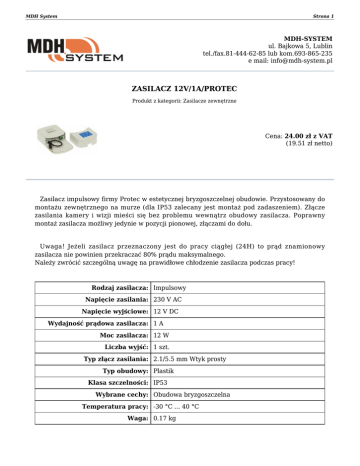 MDH System Strona 1 MDH-SYSTEM ul. Bajkowa 5, Lublin tel./fax.81-444-62-85 lub kom.693-865-235 e mail: [email protected] ZASILACZ 12V/1A/PROTEC Produkt z kategorii: Zasilacze zewnętrzne Cena: 24.00 zł z VAT (19.51 zł netto) Zasilacz impulsowy firmy Protec w estetycznej bryzgoszczelnej obudowie. Przystosowany do montażu zewnętrznego na murze (dla IP53 zalecany jest montaż pod zadaszeniem). Złącze zasilania kamery i wizji mieści się bez problemu wewnątrz obudowy zasilacza. Poprawny montaż zasilacza możliwy jedynie w pozycji pionowej, złączami do dołu. Uwaga! Jeżeli zasilacz przeznaczony jest do pracy ciągłej (24H) to prąd znamionowy zasilacza nie powinien przekraczać 80% prądu maksymalnego. Należy zwrócić szczególną uwagę na prawidłowe chłodzenie zasilacza podczas pracy! Rodzaj zasilacza: Impulsowy Napięcie zasilania: 230 V AC Napięcie wyjściowe: 12 V DC Wydajność prądowa zasilacza: 1 A Moc zasilacza: 12 W Liczba wyjść: 1 szt. Typ złącz zasilania: 2.1/5.5 mm Wtyk prosty Typ obudowy: Plastik Klasa szczelności: IP53 Wybrane cechy: Obudowa bryzgoszczelna Temperatura pracy: -30 °C ... 40 °C Waga: 0.17 kg MDH System Strona 2 Zasilacz z zamkniętą obudową: Widok wewnątrz, po zdjęciu pokrywy: MDH System Strona 3 Widok z tyłu: Zasilanie do kamery podłączone jest bardzo łatwo i estetycznie: MDH System Strona 4 Opakowanie zasilacza: MDH System Strona 5 Polaryzacja wtyku 2.1/5.5mm: Aby otworzyć pokrywę należy pociągnąć za szczelinę w miejscu pokazanym na zdjęciu: Zapraszamy do naszego sklepu internetowego www.mdh-system.pl Dokument wygenerowany 2017-03-04 o godzinie 15:09