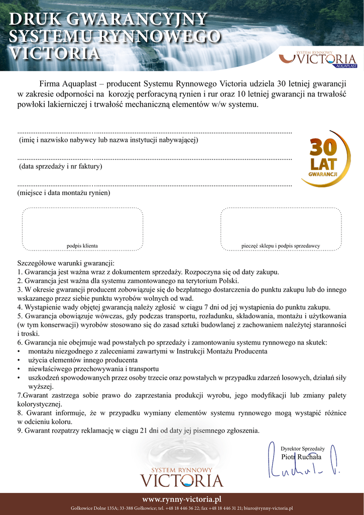 DRUK GWARANCYJNY Systemu Rynnowego Victoria system rynnowy Firma Aquaplast – producent Systemu Rynnowego Victoria udziela 30 letniej gwarancji w zakresie odporności na korozję perforacyną rynien i rur oraz 10 letniej gwarancji na trwałość powłoki lakierniczej i trwałość mechaniczną elementów w/w systemu. .......................................…........................................................................................................... (imię i nazwisko nabywcy lub nazwa instytucji nabywającej) .......................................…........................................................................................................... (data sprzedaży i nr faktury) .......................................…........................................................................................................... (miejsce i data montażu rynien) podpis klienta pieczęć sklepu i podpis sprzedawcy Szczegółowe warunki gwarancji: 1. Gwarancja jest ważna wraz z dokumentem sprzedaży. Rozpoczyna się od daty zakupu. 2. Gwarancja jest ważna dla systemu zamontowanego na terytorium Polski. 3. W okresie gwarancji producent zobowiązuje się do bezpłatnego dostarczenia do punktu zakupu lub do innego wskazanego przez siebie punktu wyrobów wolnych od wad. 4. Wystąpienie wady objętej gwarancją należy zgłosić w ciągu 7 dni od jej wystąpienia do punktu zakupu. 5. Gwarancja obowiązuje wówczas, gdy podczas transportu, rozładunku, składowania, montażu i użytkowania (w tym konserwacji) wyrobów stosowano się do zasad sztuki budowlanej z zachowaniem należytej staranności i troski. 6. Gwarancja nie obejmuje wad powstałych po sprzedaży i zamontowaniu systemu rynnowego na skutek: • montażu niezgodnego z zaleceniami zawartymi w Instrukcji Montażu Producenta • użycia elementów innego producenta • niewłaściwego przechowywania i transportu • uszkodzeń spowodowanych przez osoby trzecie oraz powstałych w przypadku zdarzeń losowych, działań siły wyższej. 7.Gwarant zastrzega sobie prawo do zaprzestania produkcji wyrobu, jego modyfikacji lub zmiany palety kolorystycznej. 8. Gwarant informuje, że w przypadku wymiany elementów systemu rynnowego mogą wystąpić różnice w odcieniu koloru. 9. Gwarant rozpatrzy reklamację w ciągu 21 dni od daty jej pisemnego zgłoszenia. Dyrektor Sprzedaży Piotr Ruchała www.rynny-victoria.pl Gołkowice Dolne 135A; 33-388 Gołkowice; tel. +48 18 446 36 22; fax +48 18 446 31 21; [email protected]