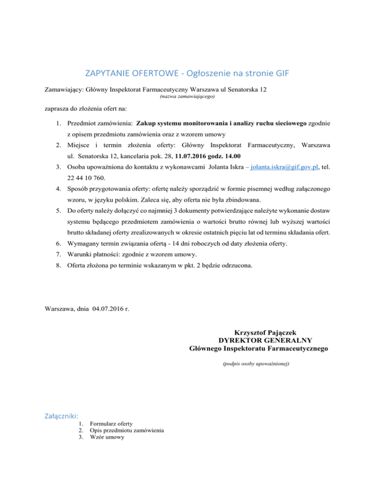 ZAPYTANIE OFERTOWE - Ogłoszenie na stronie GIF Zamawiający: Główny Inspektorat Farmaceutyczny Warszawa ul Senatorska 12 (nazwa zamawiającego) zaprasza do złożenia ofert na: 1. Przedmiot zamówienia: Zakup systemu monitorowania i analizy ruchu sieciowego zgodnie z opisem przedmiotu zamówienia oraz z wzorem umowy 2. Miejsce i termin złożenia oferty: Główny Inspektorat Farmaceutyczny, Warszawa ul. Senatorska 12, kancelaria pok. 28, 11.07.2016 godz. 14.00 3. Osoba upoważniona do kontaktu z wykonawcami Jolanta Iskra – [email protected], tel. 22 44 10 760. 4. Sposób przygotowania oferty: ofertę należy sporządzić w formie pisemnej według załączonego wzoru, w języku polskim. Zaleca się, aby oferta nie była zbindowana. 5. Do oferty należy dołączyć co najmniej 3 dokumenty potwierdzające należyte wykonanie dostaw systemu będącego przedmiotem zamówienia o wartości brutto równej lub wyższej wartości brutto składanej oferty zrealizowanych w okresie ostatnich pięciu lat od terminu składania ofert. 6. Wymagany termin związania ofertą - 14 dni roboczych od daty złożenia oferty. 7. Warunki płatności: zgodnie z wzorem umowy. 8. Oferta złożona po terminie wskazanym w pkt. 2 będzie odrzucona. Warszawa, dnia 04.07.2016 r. Krzysztof Pajączek DYREKTOR GENERALNY Głównego Inspektoratu Farmaceutycznego (podpis osoby upoważnionej) Załączniki: 1. 2. 3. Formularz oferty Opis przedmiotu zamówienia Wzór umowy