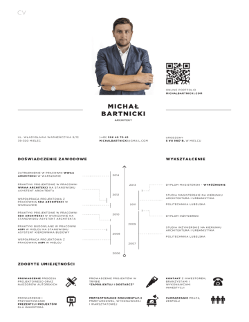 CV ONL I NE P ORT F OL I O MIC H AL B ART NIC K I.C OM M ICH AŁ BART N ICKI ARC H I T E KT UL . WŁA D YSŁA W A W A RNEŃCZ YKA 9/12 3 9 - 3 0 0 M I E LE C |+48| 5 0 6 40 7 0 42 MI CHAL B ART NIC K I@ GMAI L .C OM DO Ś W I A DC Z E N IE ZA W OD OW E Z AT R UDN I E N I E W P R A COWNI WWAA A R C H ITE K C I W W A R SZAWIE WYK SZ TA ŁC E NI E 2 014 P R A K TY KI P R O J E K TO W E W PRACOWNI W W A A A R C HITE K C I N A STANOWISKU A S Y S TE N T A R C HI TE KTA 2 013 2 012 W S P Ó ŁP R A C A P R O J E K T OWA Z P R A C OW N I Ą SDA A R C HI TEKCI W W A R SZA W I E P R A K TY KI P R O J E K TO W E W PRACOWNI S D A AR C HITE K C I W W ARSZ AWIE NA S T A N O W I SK U A SYSTE N T ARCHITEKTA P R A K TY KI B UD O W L A N E W PRACOWNI A S P I W M I E LC U N A STANOWISKU A S Y S TE N T KI E R O W N I KA BUDOWY U RODZONY 5 V I I 1 9 8 7 R. W MI E L C U DY P L OM MAGI S T E RS KI - WY RÓŻN I E N I E S T U DI A MAGI S T E RS KI E NA KI E RU N K U ARC H I T E KT U RA I U RB ANI S T Y KA 2 011 2 010 P OL I T E C H NI KA L U B E L S KA DY P L OM I NŻY NI E RS KI 2 009 S T U DI A I NŻY NI E RS KI E NA KI E RU N K U ARC H I T E KT U RA I U RB ANI S T Y KA 2 008 W S P Ó ŁP R A C A P R O J E K T OWA Z P R A C OW N I Ą A SP I W MI ELCU P OL I T E C H NI KA L U B E L S KA 2 007 2 006 Z DO BYT E UM I E J Ę T N OŚ C I P R O WA DZE N IE P R O C E S U P R O J EKTO W E GO O R A Z N A D Z OR Ó W A UTO R SKI CH PROWADZ ENI E P ROJ E KT ÓW W TRYBIE “Z APROJ EKT U J I DOS T ARC Z ” K ONT AK T Z I NW E S T ORE M, B RANŻY S T AMI I W Y KONAW C AMI I NW E S T Y C J I P R O W A D ZE N I E I P R Z Y GO TO W A N I E P R E Z EN TC JI P R O JE K TÓW D L A IN W E STO R A PRZ YGOTOWANIE DOK U ME NT AC JI PRZ ETARGO W E J , W Y KONAW C ZE J I WARSZ TAT OW E J Z ARZ ĄDZ ANIE P RAC Ą ZE S P OŁU CV O SI Ą G N I Ę C I A Z A W OD OW E P ROJ E KT P RY W AT NE GO WNĘ T R ZA MIE S Z K AL NE GO - RE AL I ZAC J A P R O W A D ZE N I E | W P R A COWI WWAA| P R O J EKTU E K SP O ZYC J I STAŁEJ W DOMU U R OD ZE N IA F R YDE R YKA CHOPI NA W Ż E L A ZO W E J W O L I P R O J EKT B UD O W L A N Y W Y S T AW A ZW Y C I Ę S KI E J KOL E K C J I LA M P JU S T L IGH T P ODC ZAS Ł ÓDŹ DE S I G N F E S T I W AL 2 014 2 013 P R O W A D ZE N I E | W P R A COWNI WWAA| P R O J EKTU K O N K UR SO WEGO TRYBUNY D L A EM IR A N A Q A TA R NATI ONAL DAY W K A T A R ZE | KO N KUR S ZAMKNIĘTY| P I E R WSZA N A GR O DA 2 012 2 011 P R O W A D ZE N I E | W P R A COWI WWAA| P R O J EKTU E K SP O ZYC J I STAŁEJ W G A L ER II ŚR E DN IW IE C ZNEJ MUZ EUM N A R O DO W E GO W WA R S Z AWI E R E AL IZA C J A 2 009 2 008 P R O W A D ZE N I E | W P R A COWI WWAA| P R O J EKTU E K SP O ZYC J I FESTIWALU “ W A R SZA WA W B UD O WI E 4” DLA M U Z E U M SZTUK I N O WOCZ ESNEJ W W AR SZA WIE - R E A LI ZACJA 2 007 2 006 P R O W A D ZE N I E | W P R A COWNI WWAA| P R O J EKTU K O N K UR SO WEGO EKSPOZ YCJ I S T A Ł E J W MUZE UM HIS TORI I POLSKI W W A R SZA W I E - P I E R W SZ A NAGRODA O PR O G RAM O W A N IE W Y S T AW A ZW Y C I Ę S KI E J KOL E K C J I LA M P JU S T L IGH T W S H OW ROOMI E MA R K I DU P ONT W ME DI OL ANI E U DZI AŁ W KONKU RS I E NA MU RA L D LA AK ADE MII GÓRNIC Z O H U T NIC Z EJ W KRAKOW I E - F I NAL I S T A 2 010 P R O W A D ZE N I E | W P R A COWI WWAA| P R O J EKTU P A W I L O N U KULTURALNO E K S PO ZY C Y J N E G O “STACJ A MERCEDES” W WA R SZA W I E - R E A L I Z ACJA U DZI AŁ W KONKU RS I E ROC A DES I G N E R W Y RÓŻNI E NI E U DZI AŁ W KONKU RS I E JU S T L IG H T DU P ONT C ORIAN NA OP RAC OWA N I E NOW E J L I NI I P RODU KT ÓW OŚ W I E T L E NI OW Y C H P I E RW S ZA NAGRODA, W DROŻE N I E D O P RODU KC J I P RZY GOT OW ANI E C ZĘ Ś C I GRAF I C Z N E J W Y S T AW Y F E S T I W AL U “WARS ZA W A W B U DOWIE 3 ” P RZY GOT OW ANI E I DE NT Y F I KAC J I W I ZU AL NE J W Y S T AW Y P ROJ E K TÓ W DY P L OMOW Y C H “S T ART ! ARC H I T E K C I ” W L U B L I NI E AUTO DE S K AU T O C AD RHINOC E ROS 4.0/ 5.0 ADOB E P H OT OS H OP ADOB E I L L U S T RAT OR ADOB E I NDE S I GN V-RAY SKETC H U P AUTO DE S K 3 DS MAX MANDE L B U L B E R DO DAT K O W E RYSU NE K ODRĘ C ZNY UMI E J Ę T N O Ś C I JĘZ YK ANGI E L S KI PRAWO J AZDY KAT . B Z AI NT E RE S O W A N IA N O W E TE C HN O LO G I E / HA R D W A R E MALA RS T W O / RYSU NE K DE S I GN Wyrażam zgodę na przetwarzanie moich danych osobowych zawartych w mojej ofercie pracy dla potrzeb niezbędnych do realizacji procesu rekrutacji (zgodnie z Ustawą z dnia 29.08.1997 roku o Ochroni e Danych Osobowych; tekst jednolity: Dz. U. z 2002r. Nr 101, poz. 926 ze zm.).