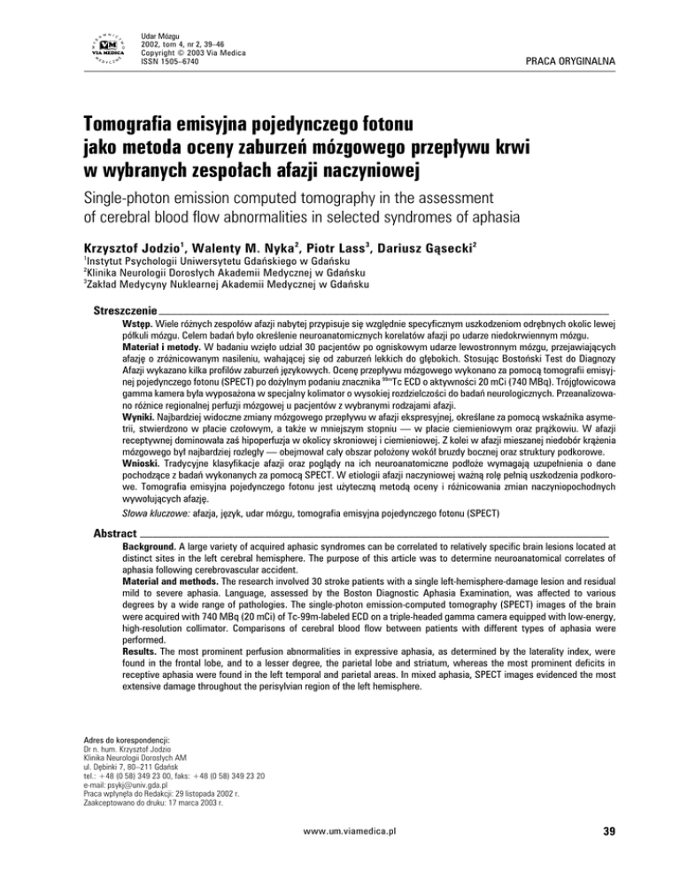 Udar Mózgu 2002, tom 4, nr 2, 39–46 Copyright © 2003 Via Medica ISSN 1505–6740 PRACA ORYGINALNA Tomografia emisyjna pojedynczego fotonu jako metoda oceny zaburzeń mózgowego przepływu krwi w wybranych zespołach afazji naczyniowej Single-photon emission computed tomography in the assessment of cerebral blood flow abnormalities in selected syndromes of aphasia Krzysztof Jodzio 1, Walenty M. Nyka 2, Piotr Lass 3, Dariusz Gąsecki 2 1 Instytut Psychologii Uniwersytetu Gdańskiego w Gdańsku Klinika Neurologii Dorosłych Akademii Medycznej w Gdańsku 3 Zakład Medycyny Nuklearnej Akademii Medycznej w Gdańsku 2 Streszczenie ________________________________________________________________________ Wstęp. Wiele różnych zespołów afazji nabytej przypisuje się względnie specyficznym uszkodzeniom odrębnych okolic lewej półkuli mózgu. Celem badań było określenie neuroanatomicznych korelatów afazji po udarze niedokrwiennym mózgu. Materiał i metody. W badaniu wzięło udział 30 pacjentów po ogniskowym udarze lewostronnym mózgu, przejawiających afazję o zróżnicowanym nasileniu, wahającej się od zaburzeń lekkich do głębokich. Stosując Bostoński Test do Diagnozy Afazji wykazano kilka profilów zaburzeń językowych. Ocenę przepływu mózgowego wykonano za pomocą tomografii emisyjnej pojedynczego fotonu (SPECT) po dożylnym podaniu znacznika 99mTc ECD o aktywności 20 mCi (740 MBq). Trójgłowicowa gamma kamera była wyposażona w specjalny kolimator o wysokiej rozdzielczości do badań neurologicznych. Przeanalizowano różnice regionalnej perfuzji mózgowej u pacjentów z wybranymi rodzajami afazji. Wyniki. Najbardziej widoczne zmiany mózgowego przepływu w afazji ekspresyjnej, określane za pomocą wskaźnika asymetrii, stwierdzono w płacie czołowym, a także w mniejszym stopniu — w płacie ciemieniowym oraz prążkowiu. W afazji receptywnej dominowała zaś hipoperfuzja w okolicy skroniowej i ciemieniowej. Z kolei w afazji mieszanej niedobór krążenia mózgowego był najbardziej rozległy — obejmował cały obszar położony wokół bruzdy bocznej oraz struktury podkorowe. Wnioski. Tradycyjne klasyfikacje afazji oraz poglądy na ich neuroanatomiczne podłoże wymagają uzupełnienia o dane pochodzące z badań wykonanych za pomocą SPECT. W etiologii afazji naczyniowej ważną rolę pełnią uszkodzenia podkorowe. Tomografia emisyjna pojedynczego fotonu jest użyteczną metodą oceny i różnicowania zmian naczyniopochodnych wywołujących afazję. Słowa kluczowe: afazja, język, udar mózgu, tomografia emisyjna pojedynczego fotonu (SPECT) Abstract ___________________________________________________________________________ Background. A large variety of acquired aphasic syndromes can be correlated to relatively specific brain lesions located at distinct sites in the left cerebral hemisphere. The purpose of this article was to determine neuroanatomical correlates of aphasia following cerebrovascular accident. Material and methods. The research involved 30 stroke patients with a single left-hemisphere-damage lesion and residual mild to severe aphasia. Language, assessed by the Boston Diagnostic Aphasia Examination, was affected to various degrees by a wide range of pathologies. The single-photon emission-computed tomography (SPECT) images of the brain were acquired with 740 MBq (20 mCi) of Tc-99m-labeled ECD on a triple-headed gamma camera equipped with low-energy, high-resolution collimator. Comparisons of cerebral blood flow between patients with different types of aphasia were performed. Results. The most prominent perfusion abnormalities in expressive aphasia, as determined by the laterality index, were found in the frontal lobe, and to a lesser degree, the parietal lobe and striatum, whereas the most prominent deficits in receptive aphasia were found in the left temporal and parietal areas. In mixed aphasia, SPECT images evidenced the most extensive damage throughout the perisylvian region of the left hemisphere. Adres do korespondencji: Dr n. hum. Krzysztof Jodzio Klinika Neurologii Dorosłych AM ul. Dębinki 7, 80–211 Gdańsk tel.: +48 (0 58) 349 23 00, faks: +48 (0 58) 349 23 20 e-mail: [email protected] Praca wpłynęła do Redakcji: 29 listopada 2002 r. Zaakceptowano do druku: 17 marca 2003 r. www.um.viamedica.pl 39 Udar Mózgu 2002, tom 4, nr 2 Conclusions. There is a need for reinterpretation of the anatomical correlation of selected aphasic syndromes, especially classic expressive (Broca’s) and receptive (Wernicke’s) aphasias. The present study highlights the integrative role of some subcortical structures in language and speech functions. The results support the usefulness of regional cerebral blood flow SPECT imaging as a diagnostic aid in the post-stroke aphasias. Key words: aphasia, language, cerebrovascular accident, single-photon emission-computed tomography (SPECT) Wstęp Mózgowych korelatów mowy i języka oraz ich zaburzeń poszukuje się od dawna. Pierwsze naukowe próby poczyniono już w II połowie XIX wieku, kiedy zwrócono uwagę na rolę lewej półkuli mózgu w czynnościach werbalnych. Starano się je przypisać do niewielkich fragmentów kory mózgu (tzw. ośrodków), której uszkodzenie w części dolnej płata czołowego miało wywoływać zaburzenia ekspresji słownej, zaś uszkodzenie w części tylnej górnego zakrętu skroniowego — zaburzenia rozumienia mowy [1]. Spośród modeli klasycznych szczególnie dużą popularność zyskało stanowisko koneksjonistyczne, sformułowane pierwotnie przez Wernickego [2, 3], a rozwinięte współcześnie przez Geschwinda [4]. Wspomniani asocjacjoniści podkreślili znaczenie połączeń nerwowych dla prawidłowego funkcjonowania mowy, mając na myśli włókna komunikujące poszczególne ośrodki między sobą, jak również ośrodki z tymi strukturami, leżące poza tzw. obszarem mowy, ale ważne dla przebiegu innych procesów poznawczych. Istnienie tego obszaru, utożs