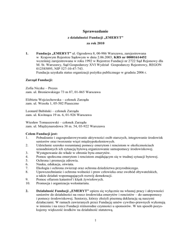 Sprawozdanie z działalności Fundacji „EMERYT” za rok 2010 1. Fundacja „EMERYT” ul. Ogrodowa 8, 00-986 Warszawa, zarejestrowana w Krajowym Rejestrze Sądowym w dniu 2.06.2003, KRS nr 00001614452 wcześniej zarejestrowana w roku 1992 w Rejestrze Fundacji nr 2722 Sąd Rejonowy dla M. St. Warszawy, Sąd Gospodarczy XVI Wydział Gospodarczy Rejestrowy, REGON 012585095, NIP 527-10-47-743. Fundacja uzyskała status organizacji pożytku publicznego w grudniu 2006 r. Zarząd Fundacji: Zofia Niczke – Prezes zam. ul. Broniewskiego 73 m 87, 01-865 Warszawa Elżbieta Wojciechowska – członek Zarządu zam. ul. Wesoła 1, 05-502 Piaseczno Leonard Babiński – członek Zarządu zam. ul. Kwitnąca 19 m. 6, 01-926 Warszawa Wiesław Tomaszewski – członek Zarządu zam. ul. Międzynarodowa 38 m. 54, 03-922 Warszawa Celem Fundacji jest: 1. Pobudzanie i zagospodarowywanie aktywności osób starszych, integrowanie środowisk seniorów oraz tworzenie więzi międzypokoleniowych. 2. Udzielanie szeroko rozumianej pomocy emerytom i rencistom w okolicznościach uzasadnionych ich sytuacją bytową organizowanie samopomocy środowiskowej. 3. Występowanie do władz w obronie bytu emerytów. 4. Pomoc społeczna emerytom i rencistom znajdującym się w trudnej sytuacji bytowej. 5. Ochrona i promocja zdrowia. 6. Nauka, edukacja, oświata. 7. Ekologia i ochrona zwierząt oraz ochrona dziedzictwa przyrodniczego. 8. Upowszechnianie i ochrona wolności i praw człowieka oraz swobód obywatelskich, a także działań wspomagających rozwój demokracji. 9. Pomoc ofiarom katastrof i klęsk żywiołowych. 10. Promocja i organizacja wolontariatu. 2. Działalność Fundacji „EMERYT” opiera się wyłącznie na własnej pracy i aktywności seniorów do działalności na rzecz środowiska emerytów i rencistów – do samopomocy i pomocy środowiskowej. Seniorzy, którzy złożyli pisemną deklarację są naszymi działaczami. W ramach zawieranych przez Fundację umów cywilno-prawnych wykonują w imieniu i na rzecz Fundacji różnorodne czynności u sponsorów. W ten sposób pozyskujemy większość środków na działalność statutową. 1 W roku 2010 działalność statutowa realizowana była jako: I. Działalność statutowa pożytku publicznego –nieodpłatna II. Działalność statutowa pożytku publicznego – odpłatna III. Inne wpływy. Szczegółowe rozliczenie finansowe działalności w roku 2010 przedstawiono w tabeli nr 1 Wszystkie projekty były realizowane zgodnie z przyjętym budżetem, zatwierdzonym Uchwałą nr 55/10 Rady Fundacji „EMERYT” z dnia 30 marca 2010 r. I. Działalność statutowa pożytku publicznego – nieodpłatna W ramach tej działalności realizowano następujące projekty: Proj. nr. 1 DNI DOBROCZYNNOŚCI - Zakupiono talony za kwotę 5.000 zł i przekazano 250 naszym podopiecznym przed świętami Bożego Narodzenia. Spotkania Wigilijnego nie mogliśmy zorganizować z uwagi na brak dofinansowania przez Urząd M. St. Warszawy – Biuro Polityki Społecznej. - Zakupiono środki czystości i higieny osobistej za kwotę 513,20 zł., wykonano 50 paczek, które dostarczono własnym transportem (dwa kursy) do Ośrodka Pomocy Społecznej w Wilkowie z prośbą o przekazanie osobom starszym, poszkodowanym przez powódź. - Udzielano, w uzasadnionych przypadkach, zapomogi na wykup lekarstw i leczenie. Łączny koszt projektu wyniósł 53.632,34 zł Wpływy (pomimo usilnych starań) 0,00 zł Niedobór środków - 53.632,34 zł został w całości sfinansowany z działu III - Inne wpływy. Proj. nr. 2 PROFILAKTYKA ZDROWOTNA SENIORÓW zad..„ JAK DBAĆ O ZDROWIE” – realizowane dzięki wsparciu finansowemu Urzędu M. St. Warszawy. Był to 3-letni bogaty w różnorodność tematyki i działań projekt. Końcowe sprawozdanie zamieszczono na naszej stronie internetowej: www.fundacja-emeryt.org. Oto krótka charakterystyka:: Edukacja pro-zdrowotna 34 spotkania edukacyjne, wykłady prowadzone przez wybitnych specjalistów nt.: a) zmian funkcjonowania organizmu, postępujących z wiekiem, b) żywienia seniorów c) aktywności ruchowej seniorów, d) dbałości o narządy ruchu, e) chorób cywilizacyjnych, f) aktywności psychofizycznej seniorów Łącznie 727 słuchaczy – seniorów. Aktywność pro-zdrowotna - dobyło się 27 całodziennych, grupowych wyjazdów na inhalacje przy tężni w Konstancinie i spacerów w Ogrodzie Botanicznym w Powsinie. Łącznie 216 uczestników – seniorów. Nauka chodu Nordic Walking, prowadzona była tylko w roku 2010. W tych zajęciach uczestniczyło 58 seniorów. Łączny koszt projektu w 2010 r. wyniósł 24.539,91 zł Wpływy: 19.764,00 zł Urząd M. St. Warszawy – 19.550,- zł darowizna - 214, - zł Niedobór środków: - 4.775,91 zł 2 został w całości sfinansowany z proj. nr 7 SPONSORING. Proj. nr. 3 TURYSTYKA I REKREACJA SENIORÓW W ramach tego projektu, Zarząd postanowił zorganizować jednodniowy wyjazd integracyjny szlakiem Fryderyka Chopina – autokarem 35-osobowym. Postanowiono w ten sposób uczcić 18-tą rocznicę naszej działalności, a także i twórczości F. Chopina. W imprezie uczestniczyło 35 seniorów – działaczy fundacji, przedstawiciele sponsorów i sympatyków aktywności seniorów. Chęć uczestnictwa zgłosił też poseł na sejm RP z okręgu Dzielnicy Wola, a gdy okazało się, że nie będzie mógł wziąć udziału w imprezie, przez swojego asystenta przekazał życzenia Fundacji i prezent w postaci płyty CD z utworami Fryderyka Chopina wszystkim uczestnikom imprezy. Poza pięknie odrestaurowanym i unowocześnionym Muzeum F. Chopina w Żelazowej Woli, obiedzie w restauracji Pola Magdy Gesler, przygotowanym specjalnie dla naszej grupy ( po promocyjnej cenie), odwiedziliśmy także odrestaurowaną gotycko – renesansową świątynię w Brochowie, w której rodzice Chopina zawarli związek małżeński, a ich syn Fryderyk został ochrzczony. Wracaliśmy przez Guzów, zapomniane miejsce, a przecież tutaj najwcześni