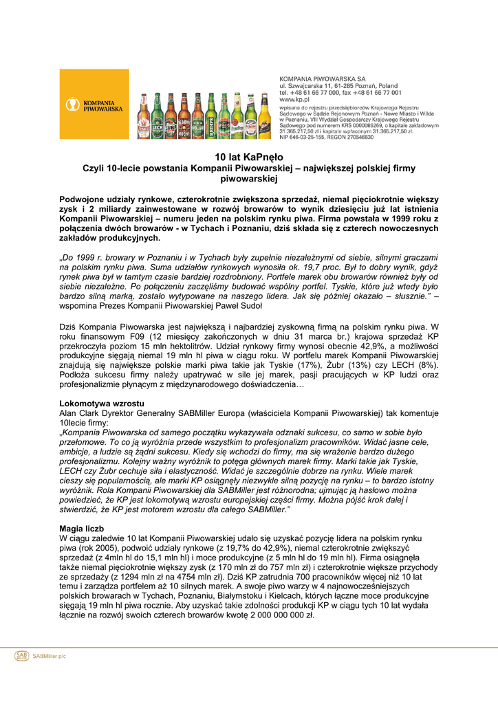 10 lat KaPnęło Czyli 10-lecie powstania Kompanii Piwowarskiej – największej polskiej firmy piwowarskiej Podwojone udziały rynkowe, czterokrotnie zwiększona sprzedaż, niemal pięciokrotnie większy zysk i 2 miliardy zainwestowane w rozwój browarów to wynik dziesięciu już lat istnienia Kompanii Piwowarskiej – numeru jeden na polskim rynku piwa. Firma powstała w 1999 roku z połączenia dwóch browarów - w Tychach i Poznaniu, dziś składa się z czterech nowoczesnych zakładów produkcyjnych. „Do 1999 r. browary w Poznaniu i w Tychach były zupełnie niezależnymi od siebie, silnymi graczami na polskim rynku piwa. Suma udziałów rynkowych wynosiła ok. 19,7 proc. Był to dobry wynik, gdyż rynek piwa był w tamtym czasie bardziej rozdrobniony. Portfele marek obu browarów również były od siebie niezależne. Po połączeniu zaczęliśmy budować wspólny portfel. Tyskie, które już wtedy było bardzo silną marką, zostało wytypowane na naszego lidera. Jak się później okazało – słusznie.” – wspomina Prezes Kompanii Piwowarskiej Paweł Sudoł Dziś Kompania Piwowarska jest największą i najbardziej zyskowną firmą na polskim rynku piwa. W roku finansowym F09 (12 miesięcy zakończonych w dniu 31 marca br.) krajowa sprzedaż KP przekroczyła poziom 15 mln hektolitrów. Udział rynkowy firmy wynosi obecnie 42,9%, a możliwości produkcyjne sięgają niemal 19 mln hl piwa w ciągu roku. W portfelu marek Kompanii Piwowarskiej znajdują się największe polskie marki piwa takie jak Tyskie (17%), Żubr (13%) czy LECH (8%). Podłoża sukcesu firmy należy upatrywać w sile jej marek, pasji pracujących w KP ludzi oraz profesjonalizmie płynącym z międzynarodowego doświadczenia… Lokomotywa wzrostu Alan Clark Dyrektor Generalny SABMiller Europa (właściciela Kompanii Piwowarskiej) tak komentuje 10lecie firmy: „Kompania Piwowarska od samego początku wykazywała odznaki sukcesu, co samo w sobie było przełomowe. To co ją wyróżnia przede wszystkim to profesjonalizm pracowników. Widać jasne cele, ambicje, a ludzie są żądni sukcesu. Kiedy się wchodzi do firmy, ma się wrażenie bardzo dużego profesjonalizmu. Kolejny ważny wyróżnik to potęga głównych marek firmy. Marki takie jak Tyskie, LECH czy Żubr cechuje siła i elastyczność. Widać je szczególnie dobrze na rynku. Wiele marek cieszy się popularnością, ale marki KP osiągnęły niezwykle silną pozycję na rynku – to bardzo istotny wyróżnik. Rola Kompanii Piwowarskiej dla SABMiller jest różnorodna; ujmując ją hasłowo można powiedzieć, że KP jest lokomotywą wzrostu europejskiej części firmy. Można pójść krok dalej i stwierdzić, że KP jest motorem wzrostu dla całego SABMiller.” Magia liczb W ciągu zaledwie 10 lat Kompanii Piwowarskiej udało się uzyskać pozycję lidera na polskim rynku piwa (rok 2005), podwoić udziały rynkowe (z 19,7% do 42,9%), niemal czterokrotnie zwiększyć sprzedaż (z 4mln hl do 15,1 mln hl) i moce produkcyjne (z 5 mln hl do 19 mln hl). Firma osiągnęła także niemal pięciokrotnie większy zysk (z 170 mln zł do 757 mln zł) i czterokrotnie większe przychody ze sprzedaży (z 1294 mln zł na 4754 mln zł). Dziś KP zatrudnia 700 pracowników więcej niż 10 lat temu i zarządza portfelem aż 10 silnych marek. A swoje piwo warzy w 4 najnowocześniejszych polskich browarach w Tychach, Poznaniu, Białymstoku i Kielcach, których łączne moce produkcyjne sięgają 19 mln hl piwa rocznie. Aby uzyskać takie zdolności produkcji KP w ciągu tych 10 lat wydała łącznie na rozwój swoich czterech browarów kwotę 2 000 000 000 zł. Dzięki tak znacznym inwestycjom browar w Tychach stał się największym browarem SABMiller w Europie, a jego moce produkcyjne wzrosły z 2,9 mln hl do 8 mln hl piwa. Browar w Poznaniu zwiększył swoje zdolności z 2,1 mln hl do aż 7,5 mln hl piwa, browar w Białymstoku z 800 tys. hl do 2,5 mln hl. Z kolei zakupiony w ubiegłym roku browar w Kielcach może rocznie uwarzyć 1 mln hl piwa. 10-LECIE KOMPANII PIWOWARSKIEJ W LICZBACH Rok 1999 rok – powstanie KP 2009 rok – 10 lecie KP Lech, Tyskie, 10,5 Tyskie, Lech, Żubr, Dębowe Mocne, Wojak, Redd’s, Gingers, Pilsner Urquell, Peroni Nastro Azzurro, Miller Genuine Draft Udziały rynkowe Sprzedaż Moce produkcyjne Liczba pracowników Browary wchodzące w skład KP 19,7% 42,9% 4 mln hl 5 mln hl 15,1 mln hl 19 mln hl 2500 osób 3200 osób Lech Browary Wielkopolski (Poznań), Tyskie Browary Książęce (Tychy) Zysk netto Przychody ze sprzedaży 170 mln zł 1 294 mln zł Lech Browary Wielkopolski (Poznań), Tyskie Browary Książęce (Tychy), Browar Dojlidy (Białystok), Browar Belgia (Kielce) 757 mln zł 4 754 mln zł Kategoria Portfel marek Tabela 1: Zestawienie najważniejszych faktów w latach 1999 i 2009. Więcej informacji na temat 10-lecia KP na stronie: http://www.kp.pl/pl/10_lat_KP *** Do redaktora: Kompania Piwowarska - Lider branży piwowarskiej w Polsce Kompania Piwowarska jest największym przedsiębiorstwem piwowarskim w Polsce. Kilkusetletnie doświadczenia w warzeniu piwa, nowoczesna technologia i rygorystyczne przestrzeganie zasad produkcji na światowym poziomie (World Class Manufacturing) gwarantują najwyższą jakość jej produktów. Do portfela marek należy m.in. Tyskie (ulubione piwo Polaków), Żubr (druga marka w Polsce pod względem wielkości sprzedaży), Lech, Dębowe Mocne, Redd's, Wojak, a także międzynarodowe marki premium: Pilsner Urquell, Miller Genuine Draft oraz Peroni Nastro Azzurro. Kompania Piwowarska powstała w 1999 roku w wyniku połączenia Tyskich Browarów Książęcych i Lech Browary Wielkopolski. W roku 2003 do Kompanii dołączył Browar Dojlidy w Białymstoku a w roku 2008 – browar w Kielcach. Wielkość sprzedaży osiągniętej przez KP w roku finansowym zakończonym 31 marca 2009 wyniosła 15,1 mln hektolitrów piwa. SABMiller – jeden z największych na świecie producentów piwa Kompania Piwowarska jes