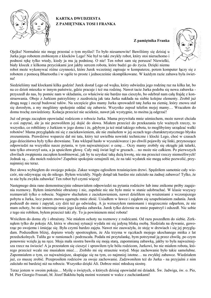 KARTKA DWUDZIESTA Z PAMIĘTNIKA TOSI I FRANKA Z pamiętnika Franka Ojejku! Normalnie nie mogę przestać o tym myśleć! To było niesamowite! Bawiliśmy się dzisiaj u Jurka jego robotem zrobionym z klocków Lego! Nie był to taki zwykły robot, który stoi nieruchomo i podnosi rękę tylko wtedy, kiedy ja mu ją podniosę. O nie! Ten robot sam się porusza! Niewielki, biały klocek z kilkoma przyciskami jest jakby sercem robota, które budzi go do życia. Dzięki niemu robot może wykonywać różne czynności, które Jurek wcześniej zapisuje w komputerze, potem komputer łączy się z robotem z pomocą Bluetootha i w ogóle to proste i jednocześnie skomplikowane. W każdym razie zabawa była świetna! Siedzieliśmy nad klockami kilka godzin! Jurek dostał Lego od wujka, który odwiedza jego rodzinę raz na kilka lat, bo na co dzień mieszka w innym państwie, gdzie pracuje i też ma rodzinę. Nawet tacie Jurka podoba się nowa zabawka przyszedł do nas, by pomóc nam w składaniu, co właściwie nie bardzo nas cieszyło, bo odebrał nam całą frajdę z konstruowania. Oboje z Jurkiem patrzyliśmy z zazdrością jak tata Jurka nakłada na siebie kolejne elementy. Zrobił już drugą nogę i zaczął budować tułów. Na szczęście głos mamy Jurka sprowadził tatę Jurka na ziemię, który znowu stał się dorosłym, a my mogliśmy spokojnie oddać się zabawie. Wszystko zepsuł telefon mojej mamy… Wracałem do domu trochę zawiedziony. Kolacja przecież nie ucieknie, nawet jak wystygnie, to można ją odgrzać! Już od progu zacząłem opowiadać rodzicom o robocie Jurka. Mama przywitała mnie uśmiechem, może nawet chciała o coś zapytać, ale ja nie pozwoliłem jej dojść do słowa. Miałem przecież do przekazania tyle ważnych rzeczy, to wszystko, co robiliśmy z Jurkiem w jego domu i że, gdybym ja też miał takiego robota, to moglibyśmy urządzać walki robotów! Mama przyglądała mi się z zaciekawieniem, ale nie znalazłem w jej oczach tego charakterystycznego błysku zrozumienia. Prawdziwe wsparcie dał mi tata, który też uwielbia nowinki techniczne i klocki Lego, choć w czasach jego dzieciństwa były tylko drewniane. Tata wklepał hasło w wyszukiwarce i po chwili pojawiły się linki, przynoszące odpowiedzi na wszystkie nasze pytania, w tym najważniejsze: o cenę… Oczy mamy zrobiły się okrągłe jak talarki, tata tylko otworzył usta, a ja spuściłem głowę. Cały mój świat legł w gruzach… no może nie całkiem. Po pierwszych chwilach zwątpienia zacząłem kombinować, jak by tu uzyskać taką dużą kwotę, nie ma przecież rzeczy niemożliwych! Jednak są… dla moich rodziców! Zupełnie spokojnie oznajmili mi, że na taki wydatek nie mogą sobie pozwolić, przynajmniej nie teraz. Bez słowa wybiegłem do swojego pokoju. Zakaz wstępu ogłosiłem trzaśnięciem drzwi. Spędziłem samotnie cały wieczór, nie odzywając się do nikogo. Byłem wściekły. Nigdy dotąd tak bardzo nie zależało na żadnej zabawce! Tylko, że to nie była zwykła zabawka! Ten robot był czymś więcej! Następnego dnia rano demonstracyjnie odmawiałem odpowiedzi na pytania rodziców lub inne znikome próby zagajenia rozmowy. Byłem śmiertelnie obrażony i nic, zupełnie nic nie było mnie w stanie udobruchać. W klasie wszyscy rozmawiali tylko o robocie. Najpierw słuchałem z zaciekawieniem, nawet dzieliłem się wrażeniami z wczorajszego pobytu u Jurka, lecz potem znowu ogarnęła mnie złość. Usiadłem w ławce i zająłem się uzupełnianiem zadania. Jurek podszedł do mnie i zapytał, czy dziś też go odwiedzę. A ja wzruszyłem ramionami i niegrzecznie odparłem, że nie mam ochoty, bo nie interesuje mnie jego kiepska zabawka. Jurek tylko dziwnie na mnie popatrzył i odszedł. Nic sobie z tego nie robiłem, byłem przecież taki zły. To ja powinienem mieć robota! Wróciłem do domu zły i obrażony. Nie miałem ochoty na rozmowy z rodzicami. Od razu poszedłem do siebie. Zerknąłem tylko do pokoju Ali, która w obecnej sytuacji wydała mi się jedyną bliską osobą. Siedziała na dywanie, gaworząc po swojemu i śmiejąc się. Była czymś bardzo zajęta. Nawet nie zauważyła, że stoję w drzwiach i się jej przyglądam. Podszedłem bliżej, dopiero wtedy spostrzegłem, że Ala trzyma w rączkach mojego ukochanego miśka z lat przedszkolnych. Tuliła go w ramionach i podrzucała. Podała mi przytulankę, bym potrzymał ją przez chwilę, po czym ponownie wzięła ją na ręce. Moja mała siostra bawiła się moją starą, zapomnianą zabawką, jakby to była najważniejsza rzecz na świecie! A ja przestałem się cieszyć i sprawiłem tyle bólu rodzicom, Jurkowi, bo nie miałem robota, którego przecież wcale nie musiałem mieć… Zrobiło mi się strasznie wstyd. Moje zachowanie było takie samolubne. Zapomniałem o tym, co najważniejsze, skupiając się na tym, co najmniej istotne… na zwykłej zabawce. Wiedziałem już, co muszę zrobić. Przeprosiłem rodziców za swoje zachowanie. Zadzwoniłem też do Jurka - na przyjaźni z nim zależało mi bardziej niż na robocie. Wszystko dzięki Ali. Dobrze mieć młodszą siostrę. Teraz jestem w swoim pokoju… Myślę o świętych, o których dzisiaj opowiadał mi dziadek. Św. Jadwiga, św. o. Pio, bł. Pier Giorgio Frassati, bł. Józef Bakhita będą moimi wzorami w walce z zachciankami!