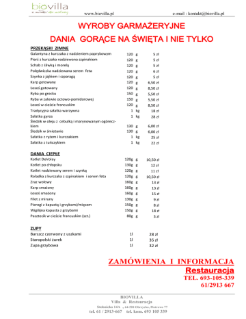www.biovilla.pl e-mail : [email protected] WYROBY GARMAŻERYJNE DANIA GORĄCE NA ŚWIĘTA I NIE TYLKO PRZEKĄSKI ZIMNE Galantyna z kurczaka z nadzieniem paprykowym Pierś z kurczaka nadziewana szpinakiem Schab z śliwką i morelą Polędwiczka nadziewana serem feta Szynka z jajkiem i szparagą Karp gotowany Łosoś gotowany Ryba po grecku Ryba w zalewie octowo-pomidorowej Łosoś w cieście francuskim Tradycyjna sałatka warzywna Sałatka gyros Śledzik w oleju z cebulką i marynowanym ogóreczkiem Śledzik w śmietanie Sałatka z ryżem i kurczakiem Sałatka z tuńczykiem 120 g 5 zł 120 g 120 g 5 zł 5 zł 120 g 120 g 120 g 120 g 150 g 150 g 120 g 1 kg 1 kg 6 zł 5 zł 6,50 zł 8,50 zł 5,50 zł 5,50 zł 8,50 zł 18 zł 28 zł 130 130 1 1 g g kg kg 6,00 zł 6,00 zł 25 zł 22 zł Kotlet DeVolay Kotlet po chłopsku Kotlet nadziewany serem i szynką Roladka z kurczaka z szpinakiem i serem feta Zraz wołowy 120g 130g 120g 120g 160g g g g g g Karp smażony Łosoś smażony Filet z miruny Pierogi z kapustą i grzybami/mięsem Wigilijna kapusta z grzybami Pasztecik w cieście francuskim (szt.) 160g 160g 130g 150g 150g 80g g g g g g g 10,50 zł 12 zł 11 zł 10,50 zł 13 zł 13 zł 15 zł 9 zł 8 zł 18 zł 3 zł DANIA CIEPŁE ZUPY Barszcz czerwony z uszkami Staropolski żurek Zupa grzybowa 1l 1l 1l 28 zł 35 zł 32 zł ZAMÓWIENIA I INFORMACJA Restauracja TEL. 693-105-339 61/2913 667 BIOVILLA Villa & Restauracja Stobnicko 14A , 64-520 Obrzycko, Piotrowo 77 tel. 61 / 2913-667 tel. kom. 693 105 339
