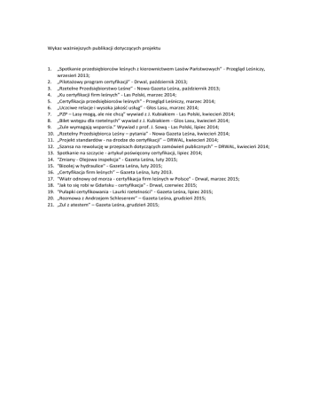 Wykaz ważniejszych publikacji dotyczących projektu 1. 2. 3. 4. 5. 6. 7. 8. 9. 10. 11. 12. 13. 14. 15. 16. 17. 18. 19. 20. 21. „Spotkanie przedsiębiorców leśnych z kierownictwem Lasów Państwowych” - Przegląd Leśniczy, wrzesień 2013; „Pilotażowy program certyfikacji” - Drwal, październik 2013; „Rzetelne Przedsiębiorstwo Leśne” - Nowa Gazeta Leśna, październik 2013; „Ku certyfikacji firm leśnych” - Las Polski, marzec 2014; „Certyfikacja przedsiębiorców leśnych” - Przegląd Leśniczy, marzec 2014; „Uczciwe relacje i wysoka jakość usług” - Głos Lasu, marzec 2014; „PZP – Lasy mogą, ale nie chcą” wywiad z J. Kubiakiem - Las Polski, kwiecień 2014; „Bilet wstępu dla rzetelnych” wywiad z J. Kubiakiem - Glos Lasu, kwiecień 2014; „Zule wymagają wsparcia.” Wywiad z prof. J. Sową - Las Polski, lipiec 2014; „Rzetelny Przedsiębiorca Leśny – pytania” - Nowa Gazeta Leśna, kwiecień 2014; „Projekt standardów - na drodze do certyfikacji” – DRWAL, kwiecień 2014; „Szansa na rewolucję w przepisach dotyczących zamówień publicznych” – DRWAL, kwiecień 2014; Spotkanie na szczycie - artykuł poświęcony certyfikacji, lipiec 2014; "Zmiany - Olejowa inspekcja" - Gazeta Leśna, luty 2015; "Bioolej w hydraulice" - Gazeta Leśna, luty 2015; „Certyfikacja firm leśnych” – Gazeta Leśna, luty 2013. "Wiatr odnowy od morza - certyfikacja firm leśnych w Polsce" - Drwal, marzec 2015; "Jak to się robi w Gdańsku - certyfikacja" - Drwal, czerwiec 2015; "Pułapki certyfikowania - Laurki rzetelności" - Gazeta Leśna, lipiec 2015; „Rozmowa z Andrzejem Schleserem” – Gazeta Leśna, grudzień 2015; „Zul z atestem” – Gazeta Leśna, grudzień 2015;