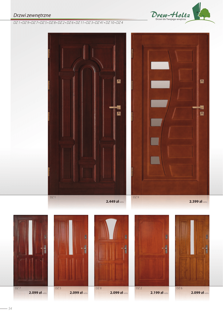 Drzwi zewnętrzne Drzwi do Twojego wnętrza DZ 1 • DZ 9 • DZ 7 • DZ 5 • DZ 8 • DZ 2 • DZ 6 • DZ 11 • DZ 3 • DZ 41 • DZ 10 • DZ 4 DZ 1 DZ 9 2.449 zł netto DZ 7 DZ 5 2.099 zł netto 54 DZ 8 2.099 zł netto 2.399 zł netto DZ 2 2.099 zł netto DZ 6 2.199 zł netto 2.099 zł netto Drzwi zewnętrzne DZ 3 2.399 zł netto DZ 41 DZ11 DZ 10 2.399 zł netto Konstrukcja skrzydła Konstrukcję skrzydła stanowi rama o grubości 52 mm wykonana z wyselekcjonowanej klejonki sosnowej, co zapobiega wypaczaniu się skrzydła. Oklejona jest obustronnie 4 mm wodoodporną sklejką dębową, całkowita grubość drzwi wynosi 60 mm. Wypełnienie ramy stanowią płyciny wykonane z płyty izolacyjnej, zawierającej piankę poliuretanową, oklejoną wodoodporną dębową sklejką o grubości 9 mm, uszczelnione dodatkowo silikonem firmy Remmers. Użyte w produkcji szyby zespolone, składają się z lustra weneckiego i szyby bezpiecznej bezbarwnej co stanowi poczucie bezpieczeństwa i prywatności wewnątrz domu. W obróbce drewna zastosowano najnowsze dostępne technologie zapewniające drzwiom niezwykle wysoką jakość, dokładność wykonania i estetykę. Drzwi zabezpieczone ekologicznym czterowarstwowym systemem wodnym niemieckiej firmy Remmers. 2.399 zł netto DZ 4 2.299 zł netto Wyposażenie standardowe • 4 zawiasy czopowe wkręcane (regulacja zawiasów w trzech płaszczyznach, zabezpieczenie przed wykręceniem). • 2 niezależne zamki ryglowe. • podwójna uszczelka w ościeżnicy i w skrzydle. • próg aluminiowy. Wymiary skrzydeł • szerokość: 80; 90 cm. • wysokość: 204 cm. Dokładne wymiary na stronie 72 Opcje dostępne za dopłatą • skrzydło o szerokości „100”– 10% ceny, • drzwi nietypowe pod względem wymiarów – 20% ceny, 2.099 zł netto • kolor z poza palety –15% ceny, • niestandardowe szklenie – wycena indywidualna, • naświetle górne – 20% ceny • dostawka boczna stała: - do 50 cm – 50% ceny, - od 50 cm do 75 cm – 70% ceny, - powyżej 75 cm – 100% ceny, • dostawka boczna ruchoma: - do 50 cm – 55% ceny, - od 50 cm do 75 cm – 75% ceny, • ościeżnica niestandardowa – do wyceny indywidualnej, • bolce antywyważeniowe 100 zł netto • opaska kpl na jedną stronę – 100 zł netto, • ćwierćwałek kpl na jedną stronę – 75 zł netto. SOSNA JASNY DĄB AFROMOZJA MAHOŃ TEAK ORZECH Gama kolorystyczna 55 Drzwi zewnętrzne Drzwi do Twojego wnętrza DZ 14 • DZ 12 • DZ 16 • DZ 18 • DZ 15 • DZ 17 • DZ 13 • DZ 9 DZ 14 DZ 12 2.699 zł netto Konstrukcja skrzydła Konstrukcję skrzydła stanowi rama o grubości 52 mm wykonana z wyselekcjonowanej klejonki sosnowej, co zapobiega wypaczaniu się skrzydła. Oklejona jest obustronnie 4 mm wodoodporną sklejką dębową, całkowita grubość drzwi wynosi 60 mm. Wypełnienie ramy stanowią płyciny wykonane z płyty izolacyjnej , zawierającej piankę poliuretanową, oklejoną wodoodporną dębową sklejką o grubości 9 mm, uszczelnione dodatkowo silikonem firmy Remmers. Użyte w produkcji szyby zespolone, składają się z lustra weneckiego i szyby bezpiecznej bezbarwnej co stanowi poczucie bezpieczeństwa i prywatności wewnątrz domu. W obróbce drewna zastosowano najnowsze dostępne technologie zapewniające drzwiom niezwykle wysoką jakość, dokładność wykonania i estetykę. Drzwi zabezpieczone ekologicznym czterowarstwowym systemem wodnym niemieckiej firmy Remmers. 2.499 zł netto Wyposażenie standardowe • 4 zawiasy czopowe wkręcane (regulacja zawiasów w trzech płaszczyznach, zabezpieczenie przed wykręceniem). • 2 niezależne zamki ryglowe. • podwójna uszczelka w ościeżnicy i w skrzydle. • próg aluminiowy. Wymiary skrzydeł • szerokość: 80; 90 cm. • wysokość: 204 cm. Dokładne wymiary na stronie 72 Opcje dostępne za dopłatą • skrzydło o szerokości „100”– 10% ceny, • drzwi nietypowe pod względem wymiarów – 20% ceny, • kolor z poza palety –15% ceny, • niestandardowe szklenie – wycena indywidualna, • naświetle górne – 20% ceny • dostawka boczna stała: - do 50 cm – 50% ceny, - od 50 cm do 75 cm – 70% ceny, - powyżej 75 cm – 100% ceny, • dostawka boczna ruchoma: - do 50 cm – 55% ceny, - od 50 cm do 75 cm – 75% ceny, • ościeżnica niestandardowa – do wyceny indywidualnej, • bolce antywyważeniowe 100 zł netto • opaska kpl na jedną stronę – 100 zł netto, • ćwierćwałek kpl na jedną stronę – 75 zł netto. 56 SOSNA JASNY DĄB AFROMOZJA MAHOŃ TEAK ORZECH Gama kolorystyczna Drzwi zewnętrzne DZ 18 DZ 15 2.399 zł netto DZ 17 2.499 zł netto 2.449 zł netto DZ 16 2.499 zł netto DZ 9 + naświetle boczne DZ 13 DZ9 + naświetle boczne i górne 2.449 zł netto 57