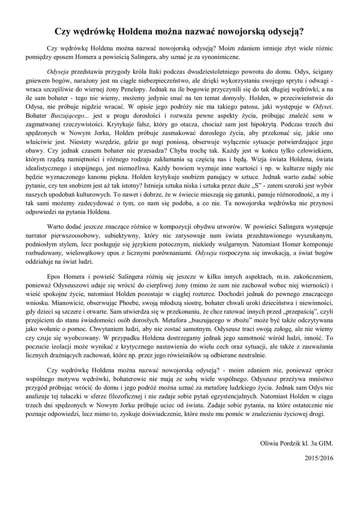Czy wędrówkę Holdena można nazwać nowojorską odyseją? Czy wędrówkę Holdena można nazwać nowojorską odyseją? Moim zdaniem istnieje zbyt wiele różnic pomiędzy eposem Homera a powieścią Salingera, aby uznać je za synonimiczne. Odyseja przedstawia przygody króla Itaki podczas dwudziestoletniego powrotu do domu. Odys, ścigany gniewem bogów, narażony jest na ciągłe niebezpieczeństwo, ale dzięki wykorzystaniu swojego sprytu i odwagi wraca szczęśliwie do wiernej żony Penelopy. Jednak na ile bogowie przyczynili się do tak długiej wędrówki, a na ile sam bohater - tego nie wiemy, możemy jedynie snuć na ten temat domysły. Holden, w przeciwieństwie do Odysa, nie próbuje nigdzie wracać. W opisie jego podróży nie ma takiego patosu, jaki występuje w Odysei. Bohater Buszującego... jest u progu dorosłości i rozważa pewne aspekty życia, próbując znaleźć sens w zagmatwanej rzeczywistości. Krytykuje fałsz, który go otacza, chociaż sam jest hipokrytą. Podczas trzech dni spędzonych w Nowym Jorku, Holden próbuje zasmakować dorosłego życia, aby przekonać się, jakie ono właściwie jest. Niestety wszędzie, gdzie go nogi poniosą, obserwuje wyłącznie sytuacje potwierdzające jego obawy. Czy jednak czasem bohater nie przesadza? Chyba trochę tak. Każdy jest w końcu tylko człowiekiem, którym rządzą namiętności i różnego rodzaju zakłamania są częścią nas i będą. Wizja świata Holdena, świata idealistycznego i utopijnego, jest niemożliwa. Każdy bowiem wyznaje inne wartości i np. w kulturze nigdy nie będzie wyznaczonego kanonu piękna. Holden krytykuje snobizm panujący w sztuce. Jednak warto zadać sobie pytanie, czy ten snobizm jest aż tak istotny? Istnieja sztuka niska i sztuka przez duże „S” - zatem szeroki jest wybór naszych upodobań kulturowych. To nawet i dobrze, że w świecie mieszają się gatunki, panuje różnorodność, a my i tak sami możemy zadecydować o tym, co nam się podoba, a co nie. Ta nowojorska wędrówka nie przynosi odpowiedzi na pytania Holdena. Warto dodać jeszcze znaczące różnice w kompozycji obydwu utworów. W powieści Salingera występuje narrator pierwszoosobowy, subiektywny, który nie zarysowuje nam świata przedstawionego wyszukanym, podniosłym stylem, lecz posługuje się językiem potocznym, niekiedy wulgarnym. Natomiast Homer komponuje rozbudowany, wielowątkowy epos z licznymi porównaniami. Odyseja rozpoczyna się inwokacją, a świat bogów oddziałuje na świat ludzi. Epos Homera i powieść Salingera różnią się jeszcze w kilku innych aspektach, m.in. zakończeniem, ponieważ Odyseuszowi udaje się wrócić do cierpliwej żony (mimo że sam nie zachował wobec niej wierności) i wieść spokojne życie, natomiast Holden pozostaje w ciągłej rozterce. Dochodzi jednak do pewnego znaczącego wniosku. Mianowicie, obserwując Phoebe, swoją młodszą siostrę, bohater chwali uroki dzieciństwa i niewinności, gdy dzieci są szczere i otwarte. Sam utwierdza się w przekonaniu, że chce ratować innych przed „przepaścią”, czyli przejściem do stanu świadomości osób dorosłych. Metafora „buszującego w zbożu” może być także odczytywana jako wołanie o pomoc. Chwytaniem ludzi, aby nie zostać samotnym. Odyseusz traci swoją załogę, ale nie wiemy czy czuje się wyobcowany. W przypadku Holdena dostrzegamy jednak jego samotność wśród ludzi, inność. To poczucie izolacji może wynikać z krytycznego nastawienia do wielu cech oraz sytuacji, ale także z zauważania licznych drażniących zachowań, które np. przez jego rówieśników są odbierane neutralnie. Czy wędrówkę Holdena można nazwać nowojorską odyseją? - moim zdaniem nie, ponieważ oprócz wspólnego motywu wędrówki, bohaterowie nie mają ze sobą wiele wspólnego. Odyseusz przeżywa mnóstwo przygód próbując wrócić do domu i jego podróż można uznać za metaforę ludzkiego życia. Jednak sam Odys nie analizuje tej tułaczki w sferze filozoficznej i nie zadaje sobie pytań egzystencjalnych. Natomiast Holden w ciągu trzech dni spędzonych w Nowym Jorku próbuje uciec od świata. Zadaje sobie pytania, na które ostatecznie nie poznaje odpowiedzi, lecz mimo to, zyskuje doświadczenie, które może mu pomóc w znalezieniu życiowej drogi. Oliwia Pordzik kl. 3a GIM. 2015/2016