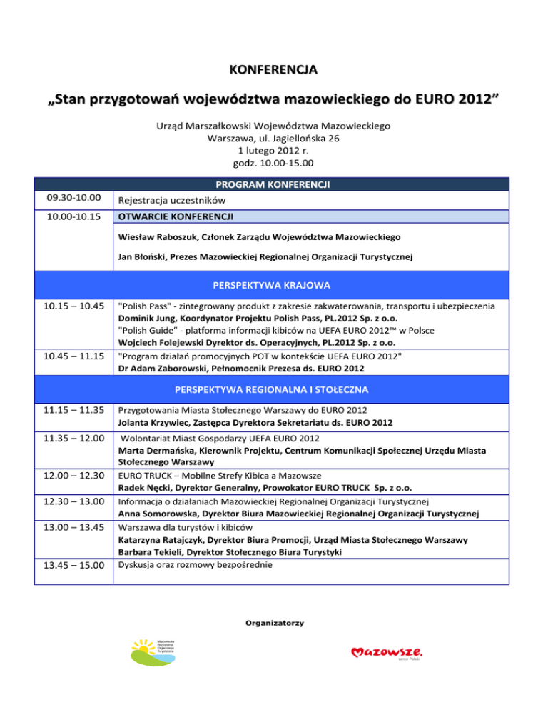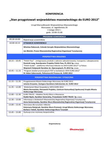 KONFERENCJA „Stan przygotowań województwa mazowieckiego do EURO 2012” Urząd Marszałkowski Województwa Mazowieckiego Warszawa, ul. Jagiellońska 26 1 lutego 2012 r. godz. 10.00-15.00 PROGRAM KONFERENCJI 09.30-10.00 Rejestracja uczestników 10.00-10.15 OTWARCIE KONFERENCJI Wiesław Raboszuk, Członek Zarządu Województwa Mazowieckiego Jan Błoński, Prezes Mazowieckiej Regionalnej Organizacji Turystycznej PERSPEKTYWA KRAJOWA 10.15 – 10.45 10.45 – 11.15 "Polish Pass" - zintegrowany produkt z zakresie zakwaterowania, transportu i ubezpieczenia Dominik Jung, Koordynator Projektu Polish Pass, PL.2012 Sp. z o.o. "Polish Guide” - platforma informacji kibiców na UEFA EURO 2012™ w Polsce Wojciech Folejewski Dyrektor ds. Operacyjnych, PL.2012 Sp. z o.o. "Program działań promocyjnych POT w kontekście UEFA EURO 2012" Dr Adam Zaborowski, Pełnomocnik Prezesa ds. EURO 2012 PERSPEKTYWA REGIONALNA I STOŁECZNA 11.15 – 11.35 Przygotowania Miasta Stołecznego Warszawy do EURO 2012 Jolanta Krzywiec, Zastępca Dyrektora Sekretariatu ds. EURO 2012 11.35 – 12.00 Wolontariat Miast Gospodarzy UEFA EURO 2012 Marta Dermańska, Kierownik Projektu, Centrum Komunikacji Społecznej Urzędu Miasta Stołecznego Warszawy EURO TRUCK – Mobilne Strefy Kibica a Mazowsze Radek Nęcki, Dyrektor Generalny, Prowokator EURO TRUCK Sp. z o.o. Informacja o działaniach Mazowieckiej Regionalnej Organizacji Turystycznej Anna Somorowska, Dyrektor Biura Mazowieckiej Regionalnej Organizacji Turystycznej Warszawa dla turystów i kibiców Katarzyna Ratajczyk, Dyrektor Biura Promocji, Urząd Miasta Stołecznego Warszawy Barbara Tekieli, Dyrektor Stołecznego Biura Turystyki Dyskusja oraz rozmowy bezpośrednie 12.00 – 12.30 12.30 – 13.00 13.00 – 13.45 13.45 – 15.00 Organizatorzy