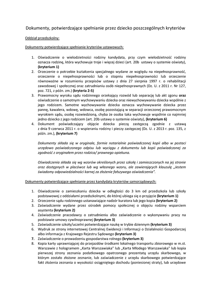 Dokumenty, potwierdzające spełnianie przez dziecko poszczególnych kryteriów Oddział przedszkolny: Dokumenty potwierdzające spełnianie kryteriów ustawowych: 1. Oświadczenie o wielodzietności rodziny kandydata, przy czym wielodzietność rodziny oznacza rodzinę, która wychowuje troje i więcej dzieci (art. 20b ustawy o systemie oświaty), (kryterium 1) 2. Orzeczenie o potrzebie kształcenia specjalnego wydane ze względu na niepełnosprawność, orzeczenie o niepełnosprawności lub o stopniu niepełnosprawności lub orzeczenie równoważne w rozumieniu przepisów ustawy z dnia 27 sierpnia 1997 r. o rehabilitacji zawodowej i społecznej oraz zatrudnianiu osób niepełnosprawnych (Dz. U. z 2011 r. Nr 127, poz. 721, z późn. zm.) (kryteria 2-5) 3. Prawomocny wyroku sądu rodzinnego orzekający rozwód lub separację lub akt zgonu oraz oświadczenie o samotnym wychowywaniu dziecka oraz niewychowywaniu dziecka wspólnie z jego rodzicem. Samotne wychowywanie dziecka oznacza wychowywanie dziecka przez pannę, kawalera, wdowę, wdowca, osobę pozostającą w separacji orzeczonej prawomocnym wyrokiem sądu, osobę rozwiedzioną, chyba że osoba taka wychowuje wspólnie co najmniej jedno dziecko z jego rodzicem (art. 20b ustawy o systemie oświaty), (kryterium 6) 4. Dokument poświadczający objęcie dziecka pieczą zastępczą zgodnie z ustawą z dnia 9 czerwca 2011 r. o wspieraniu rodziny i pieczy zastępczej (Dz. U. z 2013 r. poz. 135, z późn. zm.), (kryterium 7) Dokumenty składa się w oryginale, formie notarialnie poświadczonej kopii albo w postaci urzędowo poświadczonego odpisu lub wyciągu z dokumentu lub kopii poświadczonej za zgodność z oryginałem przez rodzica/ prawnego opiekuna. Oświadczenia składa się wg wzorów określonych przez szkołę i zamieszczonych na jej stronie oraz dostępnych w placówce lub wg własnego wzoru, ale zawierających klauzulę „Jestem świadomy odpowiedzialności karnej za złożenie fałszywego oświadczenia”. Dokumenty potwierdzające spełnianie przez kandydata kryteriów samorządowych: 1. Oświadczenie o zamieszkaniu dziecka w odległości do 3 km od przedszkola lub szkoły podstawowej z oddziałami przedszkolnymi, do której ubiega się o przyjęcie (kryterium 1) 2. Orzeczenie sądu rodzinnego ustanawiające nadzór kuratora lub jego kopia (kryterium 2) 3. Zaświadczenie wydane przez ośrodek pomocy społecznej o objęciu rodziny wsparciem asystenta (kryterium 2) 4. Zaświadczenie pracodawcy o zatrudnieniu albo zaświadczenie o wykonywaniu pracy na podstawie umowy cywilnoprawnej (kryterium 3) 5. Zaświadczenie szkoły/uczelni potwierdzające naukę w trybie dziennym (kryterium 3) 6. Wydruk ze strony internetowej Centralnej Ewidencji i Informacji o Działalności Gospodarczej albo informacja z Krajowego Rejestru Sądowego (kryterium 3) 7. Zaświadczenie o prowadzeniu gospodarstwa rolnego (kryterium 3) 8. Kopia karty uprawniającej do przejazdów środkami lokalnego transportu zbiorowego w m.st. Warszawie z hologramem „Karta Warszawiaka” lub „Karta Młodego Warszawiaka” lub kopia pierwszej strony zeznania podatkowego opatrzonego prezentatą urzędu skarbowego, w którym zostało złożone zeznanie, lub zaświadczenie z urzędu skarbowego potwierdzające fakt złożenia zeznania o wysokości osiągniętego dochodu (poniesionej straty), lub urzędowe poświadczenie odbioru wydane przez elektroniczną skrzynkę podawczą systemu teleinformatycznego administracji podatkowej (UPO) (kryterium 4) 9. Oświadczenie o wysokości dochodu na osobę w rodzinie, liczbie osób w rodzinie oraz wysokości dochodu w rodzinie będącej podstawą obliczenia wysokości dochodu na osobę w rodzinie kandydata (kryterium 6) 10. Uprawnienie do skorzystania przez rodziców z kryterium: „Dziecko, którego rodzeństwo w kolejnym roku szkolnym będzie rozpoczynało lub kontynuowało edukację przedszkolną w przedszkolu lub oddziale przedszkolnym w szkole podstawowej wskazanej na pierwszej pozycji we wniosku o przyjęcie potwierdza na wniosku dyrektor przedszkola lub szkoły podstawowej wskazanej na pierwszej pozycji we wniosku o przyjęcie” potwierdza na wniosku dyrektor przedszkola lub szkoły podstawowej wskazanej na pierwszej pozycji we wniosku o przyjęcie (kryterium 5) Kopie dokumentów wskazanych w pkt. 2 i 8 poświadcza za zgodność z oryginałem rodzic/opiekun prawny dziecka. Oświadczenia składa się wg wzorów określonych przez szkołę i zamieszczonych na jej stronie oraz dostępnych w placówce lub wg własnego wzoru, ale zawierających klauzulę „Jestem świadomy odpowiedzialności karnej za złożenie fałszywego oświadczenia”. Klasa pierwsza: TYLKO dla dzieci spoza rejonu biorących udział w postępowaniu rekrutacyjnym (dzieci rejonowe przyjmowane są „z urzędu” na podstawie zgłoszenia rodzica): 1. Oświadczenie o wielodzietności rodziny kandydata, przy czym wielodzietność rodziny oznacza rodzinę, która wychowuje troje i więcej dzieci (art. 20b ustawy o systemie oświaty), (kryterium 6) 2. Orzeczenie o potrzebie kształcenia specjalnego wydane ze względu na niepełnosprawność, orzeczenie o niepełnosprawności lub o stopniu niepełnosprawności lub orzeczenie równoważne w rozumieniu przepisów ustawy z dnia 27 sierpnia 1997 r. o rehabilitacji zawodowej i społecznej oraz zatrudnianiu osób niepełnosprawnych (Dz. U. z 2011 r. Nr 127, poz. 721, z późn. zm.) (kryteria 7-10) 3. Prawomocny wyroku sądu rodzinnego orzekający rozwód lub separację lub akt zgonu oraz oświadczenie o samotnym wychowywaniu dziecka oraz niewychowywaniu dziecka wspólnie z jego rodzicem. Samotne wychowywanie dziecka oznacza wychowywanie dziecka przez pannę, kawalera, wdowę, wdowca, osobę pozostającą w separacji orzeczonej prawomocnym wyrokiem sądu, osobę rozwiedzioną, chyba że osoba taka wychowuje wspólnie co najmniej jedno dziecko z jego rodzicem (art. 20b ustawy o systemie oświaty), (kryterium 11) 4. Dokument pośw