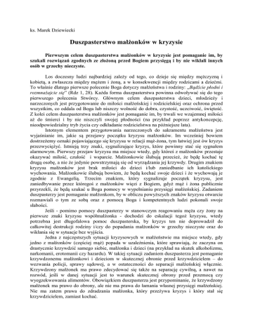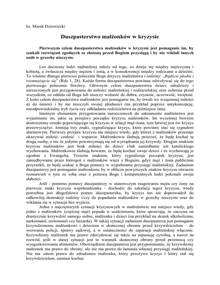 ks. Marek Dziewiecki Duszpasterstwo małżonków w kryzysie Pierwszym celem duszpasterstwa małżonków w kryzysie jest pomaganie im, by szukali rozwiązań zgodnych ze złożoną przed Bogiem przysięgą i by nie wikłali innych osób w grzechy nieczyste. Los doczesny ludzi najbardziej zależy od tego, co dzieje się między mężczyzną i kobietą, a zwłaszcza między mężem i żoną, a w konsekwencji między rodzicami a dziećmi. To właśnie dlatego pierwsze polecenie Boga dotyczy małżeństwa i rodziny: „Bądźcie płodni i rozmnażajcie się” (Rdz 1, 28). Każda forma duszpasterstwa powinna odwoływać się do tego pierwszego polecenia Stwórcy. Głównym celem duszpasterstwa dzieci, młodzieży i narzeczonych jest przygotowanie do miłości małżeńskiej i rodzicielskiej oraz ochrona przed wszystkim, co oddala od Boga lub niszczy wolność do dobra, czystość, uczciwość, świętość. Z kolei celem duszpasterstwa małżonków jest pomaganie im, by trwali we wzajemnej miłości aż do śmierci i by nie niszczyli swojej płodności (na przykład poprzez antykoncepcję, nieodpowiedzialny tryb życia czy odkładanie rodzicielstwa na późniejsze lata). Istotnym elementem przygotowania narzeczonych do sakramentu małżeństwa jest wyjaśnianie im, jakie są przejawy początku kryzysu małżonków. Im wcześniej bowiem dostrzeżemy oznaki pojawiającego się kryzysu w relacji mąż-żona, tym łatwiej jest ów kryzys przezwyciężyć. Istnieją trzy znaki, sygnalizujące kryzys, które powinny stać się sygnałem alarmowym. Pierwszy przejaw kryzysu ma miejsce wtedy, gdy któreś z małżonków przestaje okazywać miłość, czułość i wsparcie. Małżonkowie ślubują przecież, że będę kochać tę drugą osobę, a nie że jedynie powstrzymają się od wyrządzania jej krzywdy. Drugim znakiem kryzysu małżonków jest brak miłości do dzieci i/lub zaniedbanie ich katolickiego wychowania. Małżonkowie ślubują bowiem, że będą kochać swoje dzieci i że wychowają je zgodnie z Ewangelią. Trzecim znakiem, który sygnalizuje początek kryzysu, jest zaniedbywanie przez któregoś z małżonków więzi z Bogiem, gdyż mąż i żona publicznie przyrzekli, że będą szukać u Boga pomocy w wypełnianiu przysięgi małżeńskiej. Zadaniem duszpasterzy jest pomaganie małżonkom, by w obliczu powyższych znaków kryzysu otwarcie rozmawiali o tym ze sobą oraz z pomocą Boga i kompetentnych ludzi pokonali swoje słabości. Jeśli - pomimo pomocy duszpasterzy w stanowczym reagowaniu męża czy żony na pierwsze znaki kryzysu współmałżonka - dochodzi do eskalacji tegoż kryzysu, wtedy potrzebna jest długofalowa pomoc duszpasterska, by kryzys ten nie doprowadził do całkowitej destrukcji rodziny i/czy do popadania małżonków w grzechy nieczyste oraz do wikłania się w sytuacje bez wyjścia. Jedna z najczęstszych sytuacji kryzysowych w małżeństwie ma miejsce wtedy, gdy jedno z małżonków (częściej mąż) popada w uzależnienia, które sprawiają, że zaczyna on drastycznie krzywdzić samego siebie, małżonka i dzieci (na przykład na skutek alkoholizmu, narkomanii, erotomanii czy hazardu). W takiej sytuacji zadaniem duszpasterza jest pomaganie krzywdzonemu małżonkowi i dzieciom w skutecznej obronie przed krzywdzicielem – do wezwania policji, sprawy sądowej, a w ostateczności do separacji małżeńskiej włącznie. Krzywdzony małżonek ma prawo zdecydować się także na separację cywilną, a nawet na rozwód, jeśli w danej sytuacji jest to warunek skutecznej obrony przed przemocą czy wyegzekwowania alimentów. Obowiązkiem duszpasterza jest przypominanie, że krzywdzony małżonek ma prawo do obrony, ale nie ma prawa do łamania własnej przysięgi małżeńskiej. Nie ma zatem prawa do zdradzania małżonka, który przeżywa kryzys i który stał się krzywdzicielem, zamiast kochać. Druga z typowych form kryzysu ma miejsce wtedy, gdy jeden z małżonków zaczyna prowadzić podwójne życie i dopuszcza się zdrady, mimo że sam przyznaje, iż nie miał niczego do zarzucenia żonie czy mężowi. W takiej sytuacji duszpasterz powinien wspierać zdradzonego i skrzywdzonego małżonka, zwłaszcza poprzez tworzenie grup formacyjnych dla małżonków opuszczonych, by mieli siłę po katolicku wychowywać dzieci i trwać w wierności małżeńskiej. Z kolei tego, kto odszedł i zdradził, ksiądz powinien mobilizować do radykalnego nawrócenia, do rozstania się z kochanką/kochankiem oraz do powrotu do swoich bliskich. Trzecia z typowych form kryzysu ma miejsce wtedy, gdy jedno z małżonków staje się psychicznym czy duchowym dręczycielem współmałżonka. Przykładem może być sytuacja, w której żona okazuje się skrajnie niedojrzała emocjonalnie i zadręcza męża swoimi przeżyciami, albo skupia się wyłącznie na dzieciach, całkowicie zaniedbując więzi z mężem. W tej sytuacji – podobnie jak w poprzednich – zadaniem duszpasterza jest wyjaśnianie, że krzywdzony małżonek ma prawo do obrony, do separacji małżeńskiej włącznie, ale nie ma prawa do łamania własnej przysięgi i do wchodzenia w związki cudzołożne. W katolickim małżeństwie obowiązuje zasada: „to, że kocham ciebie, nie daje ci prawa, byś mnie krzywdził.” Wynika ona z faktu, że Jezus uczy nas miłości nie tylko ofiarnej, ale też mądrej, która nie może być mylona z naiwnością, podporządkowaniem się złu czy z tworzeniem komuś komfortu błądzenia. Duszpasterstwo małżonków w kryzysie, prowadzone zgodnie z zasadami Ewangelii, ma chronić małżonków przed najbardziej skrajnymi formami kryzysu, jakim jest nie tylko rozpad małżeństwa i rodziny, lecz wikłanie się jednego czy obojga małżonków w grzechy nieczyste i/czy w związki z trzecimi osobami. Obowiązkiem kapłana jest wyjaśniać, że w świetle Ewangelii istnieje radykalna różnica między sytuacją małżonków, którzy z uzasadnionych powodów żyją w separacji i mogą przys