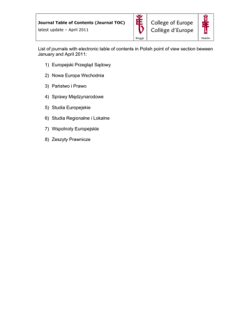 Journal Table of Contents (Journal TOC) latest update – April 2011 List of journals with electronic table of contents in Polish point of view section beween January and April 2011: 1) Europejski Przegląd Sądowy 2) Nowa Europa Wschodnia 3) Państwo i Prawo 4) Sprawy Międzynarodowe 5) Studia Europejskie 6) Studia Regionalne i Lokalne 7) Wspolnoty Europejskie 8) Zeszyty Prawnicze Back to title list Europejski Przegląd Sądowy Numer 3 2011 Thomas Giegerich Ostatnie słowo Niemiec w sprawie zjednoczonej Europy - wyrok Federalnego Trybunatu Konstytucyjnego w sprawie Traktatu z Lizbony 4 Anna Dorabialska Między normą kolizyjną a instytucją uznania -nazwisko w orzecznictwie TS 18 Filip Grzegorczyk Dyrektywa 2006/43/WE w sprawie sprawozdań finansowych w kontekście funkcjonowania rynku wewnętrznego 25 Błażej Kuźniacki Podatek od postojów w celach turystycznych od nierezydentów autonomicznego regionu państwa członkowskiego - glosa do wyroku TS z 17.11.2009 r. w sprawie C-169/08 Presiclente del Consiglio des Ministri v. Regione Sardegna 36 Mariusz Baran Nakaz windykacji bezprawnie przyznanej pomocy a zasada powagi rzeczy osądzonej - glosa do wyroku TS z 18.07.2007 r. w sprawie C-119/05 Ministero delllndustria, del Commercio e deII'Artigianato v. Lucchini SpA 44 Roman Namysłowski Obejście prawa w podatku VAT - konieczność odwrócenia podatkowych skutków transakcji - wprowadzenie i wyrok TS z 21.02.2006 r. w sprawie C-255/02 Halifax pk, Leeds Permanent Development Sen/ices Ltd, County Wide Property lnvestments Lid v. Commissioners of Customs & Excise 51 Back to title list Europejski Przegląd Sądowy Numer 4 2011 Barbara Nita Ograniczenia w przekazywaniu na podstawie EN A w demokratycznym państwie prawnym (cz. I) ............................................. 4 Elżbieta Miśkowicz Klauzula stałości (standstill) jako podstawa utrzymywania w legislacjach krajowych wyłączeń w zakresie prawa do odliczenia VAT. 13 Marcin Kamiński Konstruowanie wzorca legalności decyzji administracyjnej na podstawie prawa UE przez polskie sądy administracyjne (cz.l)22 Monika Domańska Zakaz dyskryminacji ze względu na wiek w orzecznictwie TS 28 Rafał Lipniewicz Unikanie podwójnego opodatkowania w świetle swobody przepływu kapitału w UE ‐ glosa do wyroku TS z 3.06.2010 r. w sprawie C-487/08 Komisja Europejska v. Hiszpania ..............................38 Wojciech Brzozowski Małżeństwo, życie rodzinne, związki osób tej samej płci glosa do wyroku ETPCz z 24.06.2010 r. w sprawie Schalk i Kopf v. Austria 42 Roman Namysłowski Spójność systemu podatkowego jako przesłanka uzasadniająca ograniczenie swobód traktatowych wprowadzenie i wyrok TS z 28.01.1992 r. w sprawie C-204/90 Hans-Martin Bachmann v. Belgia 46 O wadze słowa - także śpiewanego ..............................50 Robert Stefanicki (red.) Aktualne tendencje w prawie konsumenckim (recenzja Aleksandry Kunkiel-Kryńskiej)................. 52 Back to title list Europejski Przegląd Sądowy Numer 2 2011 artykuły i rozprawy Ewa Łętowska Czekając na Godota, czyli jak wykonywać wyroki ETPCz (uwagi na tle sprawy Moskal v. Polska) ...................... 4 Marcin Radwan Wybrane zagadnienia postępowania wywołanego przez bezprawne uprowadzenie lub zatrzymanie dziecka w innym państwie członkowskim ..11 Piotr Kucharski Kontrola NBP przez Najwyższą Izbę Kontroli w świetle prawa UE 21 Monika Tomaszewska Wiek emerytalny jako uzasadnienie wypowiedzenia umowy o pracę na tle orzecznictwa Sądu Najwyższego ......................... 32 Mirosław Stec Prawo do odszkodowania w przypadku opóźnienia lotu - glosa do wyroku TS z 19.11.2009 r. w sprawie C-402/07 Sturgeon v. Condor oraz Bock i Lepuschitzv. Air France ...40 Elżbieta Hanna Morawska Odpowiedzialność państwa za bierność wobec przemocy domowej i dyskryminację jej ofiar - glosa do wyroku ETPCz z 9.06.2009 r. w sprawie Opuz v. Turcja 45 Roman Namysłowski Opodatkowanie osób fizycznych - zakaz dyskryminacji ze względu na obywatelstwo - wprowadzenie i wyrok TS z 14.02.1993 r. w sprawie C-279/93 Finanzamt Koein-AItstadt v. Roland Schumacker....... 53 Back to title list Nowa Europa Wschodnia Numer 2 2011 Kronika i komentarze Marek Matusiak Azja Centralna................................................... 7 Kamil Kłysiński Białoruś ............................................................... 9 Wojciech Górecki Kaukaz. ........................................................... 12 Jadwiga Rogoża Rosja.................. ............................................... 14 Sławomir Matuszak Ukraina......................................................... 19 Paweł Kowal Miękki realizm. ...................................................... 22 Marcin Wojciechowski Nie ulec chwilowym nastrojom ............ 30 WolfgangTemplin Wciągać Rosję do dialogu ............................. 35 Andriej Riabow Ograniczeni partnerzy...................................... 39 Marcin Kaczmarski Dlaczego Rosja nie boi się Chin? 45 Szymon Kardaś Pragmatyczna przyjaźń..................................... 56 Katarzyna Kwiatkowska Siermiężna dama ................................. 63 Piotr Pogorzelski Korporacja Ukraina. ........................................ 69 Wojciech Konończuk Rosyjska gorączka sztuki ......................... 76 Joanna Bocheńska Muzułmanka to znaczy obywatelka 89 Rozmowa z Mihailem Formuzalem Znajduję wsparcie w Rosji ... 97 Marta Jaroszewicz Wizowy rubikon ............................................ 101 Iwona Kaliszewska Terror od (dagestańskiego) podwórka .108 Rozmowa z Wołodymyrem Fesenką Władza ma kompleks Majdanu 113 Aleksandra Kowalczuk Jutro nie zależy od nas ........................... 129 Lucyna Dąbrowska Nie tylko babuszki i seksowne krasunie 132 Iza Chruślińska Ukraina zaklęta w książkach 142 Polska - partner Wschodu Iryna Sołonenko Ukraina liczy na Polskę ................................. . 155 Walerij Karbalewicz Biał