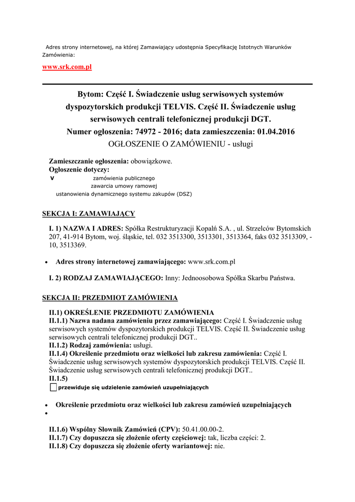 Adres strony internetowej, na której Zamawiający udostępnia Specyfikację Istotnych Warunków Zamówienia: www.srk.com.pl Bytom: Część I. Świadczenie usług serwisowych systemów dyspozytorskich produkcji TELVIS. Część II. Świadczenie usług serwisowych centrali telefonicznej produkcji DGT. Numer ogłoszenia: 74972 - 2016; data zamieszczenia: 01.04.2016 OGŁOSZENIE O ZAMÓWIENIU - usługi Zamieszczanie ogłoszenia: obowiązkowe. Ogłoszenie dotyczy: V zamówienia publicznego zawarcia umowy ramowej ustanowienia dynamicznego systemu zakupów (DSZ) SEKCJA I: ZAMAWIAJĄCY I. 1) NAZWA I ADRES: Spółka Restrukturyzacji Kopalń S.A. , ul. Strzelców Bytomskich 207, 41-914 Bytom, woj. śląskie, tel. 032 3513300, 3513301, 3513364, faks 032 3513309, 10, 3513369. Adres strony internetowej zamawiającego: www.srk.com.pl I. 2) RODZAJ ZAMAWIAJĄCEGO: Inny: Jednoosobowa Spółka Skarbu Państwa. SEKCJA II: PRZEDMIOT ZAMÓWIENIA II.1) OKREŚLENIE PRZEDMIOTU ZAMÓWIENIA II.1.1) Nazwa nadana zamówieniu przez zamawiającego: Część I. Świadczenie usług serwisowych systemów dyspozytorskich produkcji TELVIS. Część II. Świadczenie usług serwisowych centrali telefonicznej produkcji DGT.. II.1.2) Rodzaj zamówienia: usługi. II.1.4) Określenie przedmiotu oraz wielkości lub zakresu zamówienia: Część I. Świadczenie usług serwisowych systemów dyspozytorskich produkcji TELVIS. Część II. Świadczenie usług serwisowych centrali telefonicznej produkcji DGT.. II.1.5) przewiduje się udzielenie zamówień uzupełniających Określenie przedmiotu oraz wielkości lub zakresu zamówień uzupełniających II.1.6) Wspólny Słownik Zamówień (CPV): 50.41.00.00-2. II.1.7) Czy dopuszcza się złożenie oferty częściowej: tak, liczba części: 2. II.1.8) Czy dopuszcza się złożenie oferty wariantowej: nie. II.2) CZAS TRWANIA ZAMÓWIENIA LUB TERMIN WYKONANIA: Zakończenie: 31.12.2016. SEKCJA III: INFORMACJE O CHARAKTERZE PRAWNYM, EKONOMICZNYM, FINANSOWYM I TECHNICZNYM III.1) WADIUM Informacja na temat wadium: Część I - 3 000,00 zł (słownie: trzy tysiące złotych 00/100) Część II - 3 000,00 zł (słownie: trzy tysiące złotych 00/100) III.2) ZALICZKI III.3) WARUNKI UDZIAŁU W POSTĘPOWANIU ORAZ OPIS SPOSOBU DOKONYWANIA OCENY SPEŁNIANIA TYCH WARUNKÓW III.3.2) Wiedza i doświadczenie Opis sposobu dokonywania oceny spełniania tego warunku o Zamawiający uzna warunek w zakresie wiedzy i doświadczenia za spełniony, jeżeli Wykonawca wykaże się należytym wykonaniem głównych usług w okresie ostatnich trzech lat przed upływem terminu składania ofert, a jeżeli okres prowadzenia działalności jest krótszy - w tym okresie, w tym co najmniej jedną usługą w ramach jednej umowy polegającą na : Część I: świadczeniu usług serwisowych centrali telefonicznych o wartości minimum 25 000,00 zł brutto, wraz z dowodami realizacji wszystkich usług ujętych w wykazie, Część II: świadczeniu usług serwisowych systemów dyspozytorskich, o wartości minimum 25 000,00 zł brutto, wraz z dowodami realizacji wszystkich usług ujętych w wykazie, III.4) INFORMACJA O OŚWIADCZENIACH LUB DOKUMENTACH, JAKIE MAJĄ DOSTARCZYĆ WYKONAWCY W CELU POTWIERDZENIA SPEŁNIANIA WARUNKÓW UDZIAŁU W POSTĘPOWANIU ORAZ NIEPODLEGANIA WYKLUCZENIU NA PODSTAWIE ART. 24 UST. 1 USTAWY III.4.1) W zakresie wykazania spełniania przez wykonawcę warunków, o których mowa w art. 22 ust. 1 ustawy, oprócz oświadczenia o spełnianiu warunków udziału w postępowaniu należy przedłożyć: potwierdzenie posiadania uprawnień do wykonywania określonej działalności lub czynności, jeżeli przepisy prawa nakładają obowiązek ich posiadania, w szczególności koncesje, zezwolenia lub licencje; wykaz wykonanych, a w przypadku świadczeń okresowych lub ciągłych również wykonywanych, głównych dostaw lub usług, w okresie ostatnich trzech lat przed upływem terminu składania ofert albo wniosków o dopuszczenie do udziału w postępowaniu, a jeżeli okres prowadzenia działalności jest krótszy - w tym okresie, wraz z podaniem ich wartości, przedmiotu, dat wykonania i podmiotów, na rzecz których dostawy lub usługi zostały wykonane, oraz załączeniem dowodów, czy zostały wykonane lub są wykonywane należycie; III.4.2) W zakresie potwierdzenia niepodlegania wykluczeniu na podstawie art. 24 ust. 1 ustawy, należy przedłożyć: oświadczenie o braku podstaw do wykluczenia; aktualny odpis z właściwego rejestru lub z centralnej ewidencji i informacji o działalności gospodarczej, jeżeli odrębne przepisy wymagają wpisu do rejestru lub ewidencji, w celu wykazania braku podstaw do wykluczenia w oparciu o art. 24 ust. 1 pkt 2 ustawy, wystawiony nie wcześniej niż 6 miesięcy przed upływem terminu składania wniosków o dopuszczenie do udziału w postępowaniu o udzielenie zamówienia albo składania ofert; III.4.4) Dokumenty dotyczące przynależności do tej samej grupy kapitałowej lista podmiotów należących do tej samej grupy kapitałowej w rozumieniu ustawy z dnia 16 lutego 2007 r. o ochronie konkurencji i konsumentów albo informacji o tym, że nie należy do grupy kapitałowej; III.6) INNE DOKUMENTY Inne dokumenty niewymienione w pkt III.4) albo w pkt III.5) 1. Wypełnione formularze cenowe - załącznik nr 7.1., 7.2., do druku OFERTA 2. Wykonawca w druku OFERTA - załącznik nr 1 do druku SIWZ zobowiązany jest złożyć zobowiązanie z tytułu gwarancji zgodnie z pkt. II ppkt.1. Załącznika Nr 2 do SIWZ 3. Wykonawca zobowiązany jest do złożenia w ofercie Oświadczenia - Załącznik nr 8 do druku OFERTA, iż nie będzie zatrudniał osób korzystających z urlopów górniczych albo urlopu dla pracowników zakładu przeróbki mechanicznej zgodnie z opisem w pkt II ppkt 2 Załącznika nr 2 do SIWZ. SEKCJA IV: PROCEDURA IV.1) TRYB UDZIELENIA ZAMÓWIENIA IV.1.1) Tryb udzielenia zamówienia: przetarg nieograniczony. IV.2) KRYTERIA OCENY OFERT IV.2.1) Kryteria oceny ofert: cena oraz 
