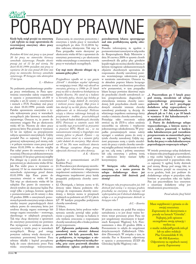 Kiedy będę mógł przejść na emeryturę i jak wpłynie na moje uprawnienia do wcześniejszej emerytury okres pracy pod ziemią? Posiadam 40 letni staż pracy w tym ponad 20 lat pracy na stanowisku kierowcy samochodu ciężarowego. Ponadto obecnie pracuję już od 12 lat pod ziemią. Na dzień 01.01.1999r posiadam staż pracy w wymiarze 26 lat oraz ponad 20 letni staż pracy na stanowisku kierowcy samochodu ciężarowego. W bieżącym roku ukończyłem 57 lat życia. L. – Kłodawa Na podstawie przedstawionego przebiegu pracy stwierdzamy, że Pana uprawnienia emerytalne należy rozpatrywać w oparciu o postanowienia art.184 w związku z art.32 ustawy o emeryturach i rentach z FUS. Posiadany staż pracy na dzień 01.01.1999r pozwala ustalić Pańskie uprawnienia emerytalne z tytułu wykonywania pracy w warunkach szczególnych jako kierowcy samochodu ciężarowego. Oznacza to, że prawo do emerytury osiągnie Pan po ukończeniu wieku 60 lat. Niestety ale okres pracy górniczej który Pan posiada w wymiarze 12 lat nie wpłynie na przyspieszenie nabycia uprawnień emerytalnych. Gdyby posiadał Pan co najmniej 5 lat pracy górniczej wykonywanej pod ziemią stale i w pełnym wymiarze czasu pracy przed dniem 01.01.1999r to obecnie mógłby Pan nabyć prawo do emerytury o 6 lat wcześniej. Obecnie po udokumentowaniu co najmniej 15 lat pracy górniczej mógłby Pan ubiegać się o prawo do emerytury pomostowej po ukończeniu wieku 60 lat. Jak Pan widzi praca w wymiarze co najmniej 15 lat na stanowisku kierowcy samochodu ciężarowego przed dniem 01.01.1999r daje Panu prawo do emerytury również w wieku 60 lat. Tak więc po ukończeniu wieku 60 lat nabędzie Pan prawo do emerytury z dwóch tytułów ale skorzystać będzie Pan mógł tylko z jednego, bowiem zgodnie z postanowieniami art.16 ustawy z dnia 19 grudnia 2008r o emeryturach pomostowych prawdo emerytury ustaje z dniem miedzy innymi: poprzedzających dzień nabycia prawa do emerytury, która jest ustalona decyzją organu rentowego lub innego organu emerytalno – rentowego, określonego w odrębnych przepisach. Tak więc chcąc skorzystać z uprawnień do emerytury pomostowej nie powinien Pan występować o ustalenie prawa do emerytury z tytułu pracy w warunkach szczególnych. Biorąc pod uwagę powyższe radzimy wtedy skorzystać z emerytury pomostowej bowiem Pana zebrane składki i kapitał początkowy będą do czasu ukończenia przez Pana wieku emerytalnego waloryzowane. strona 10 Zaznaczamy, że emerytura pomostowa i emerytura z tytułu pracy w warunkach szczególnych po dniu 31.12.2014r będzie naliczana identycznie. Tak więc w Pana przypadku warto skorzystać po ukończeniu wieku 60 lat z uprawnień do emerytury pomostowej a po ukończeniu wieku emerytalnego z emerytury z tytułu pracy w warunkach szczególnych. Czy mąż może obecnie ubiegać się o uznanie pylicy płuc ? Przypadkowo wpadła mi w ręce gazeta „Górnik” i chciałabym uzyskać informację na następujący temat. Mąż mój odszedł na emeryturę górniczą w 1990r po 25 latach pracy na dole w charakterze kombajnisty na kopalni Knurów. Nie starał się o badanie w kierunku pylicy, chociaż jego koledzy go namawiali i mają dodatek do emerytury ( nieliczni jeszcze żyjący). Mąż przez te lata skarżył się na bóle pleców, dokuczliwe odpluwanie ale to lekceważył. Nieliczne wizyty u lekarza rodzinnego kończyły się przepisaniem środków przeciwbólowych bez żadnych badań dodatkowych, chociażby RTG. Ponieważ w ostatnim czasie bóle się nasiliły mąż prześwietlił się prywatnie w pracowni RTG. Wyszło mu , że ma zaawansowane zmiany w kręgosłupie oraz zmiany pylicze w płucach. Pytanie – czy można jeszcze starać się o uznanie pylicy i jakiś dodatek do emerytury. Mąż obecnie ma 67 lat. Nie mam możliwości dotarcia do Waszego czasopisma dlatego proszę odpowiedz skierować na adres domowy. A. K. - Knurów Zgodnie z postanowieniami art.235 Kodeksu Pracy: §1. Pracodawca jest obowiązany niezwłocznie zgłosić właściwemu okręgowemu inspektorowi sanitarnemu i właściwemu okręgowemu inspektorowi pracy każdy przypadek podejrzenia choroby zawodowej: §2. Obowiązek, o którym mowa w §1, dotyczy także lekarza podmiotu właściwego do rozpoznania choroby zawodowej, o którym mowa w przepisach wydanych na podstawie art.237 § 1 pkt.6. §2¹. W każdym przypadku podejrzenia choroby zawodowej: 1) lekarz, 2) lekarz dentysta, który podczas wykonywania zawodu powziął takie podejrzenie u pacjenta - kieruje na badania w celu wydania orzeczenia o rozpoznaniu choroby zawodowej albo o braku podstaw do jej rozpoznania. §2². Zgłoszenia podejrzenia choroby zawodowej może również dokonać pracownik lub były pracownik, który podejrzewa, że występujące u niego objawy mogą wskazywać na taką chorobę, przy czym pracownik aktualnie zatrudniony zgłasza podejrzenie za pośrednictwem lekarza sprawującego nad nim profilaktyczną opiekę zdrowotną. Ponadto informujemy, że zgodnie z postanowieniami zawartymi w załączniku do Rozporządzenia Rady Ministrów z dnia 30 czerwca 2009r w sprawie chorób zawodowych dla pylicy płuc górników kopalń węgla nie można określić okresu, w którym wystąpienie udokumentowanych objawów chorobowych upoważnia do rozpoznania choroby zawodowej pomimo wcześniejszego zakończenia pracy w narażeniu zawodowym. Oznacza to, że aktualnie poprzez lekarza leczącego powinna zostać uruchomiona procedura w/w postanowień, w tym przypadku lekarz leczący powinien skierować męża do przychodni chorób zawodowych celem przeprowadzenia diagnostyki i stwierdzenia istnienia choroby zawodowej. Jeśli przychodnia chorób zawodowych stwierdzi istnienie choroby zawodowej przekazuje tą decyzję do właściwego inspektora sanitarnego który orzeka o istnieniu choroby zawodowej. Posiadając takie orzeczenie należy zwrócić się do ZUS-u celem ustalenia uszczerbku na zdrowiu i wypłacenie jednorazowego odszkodow