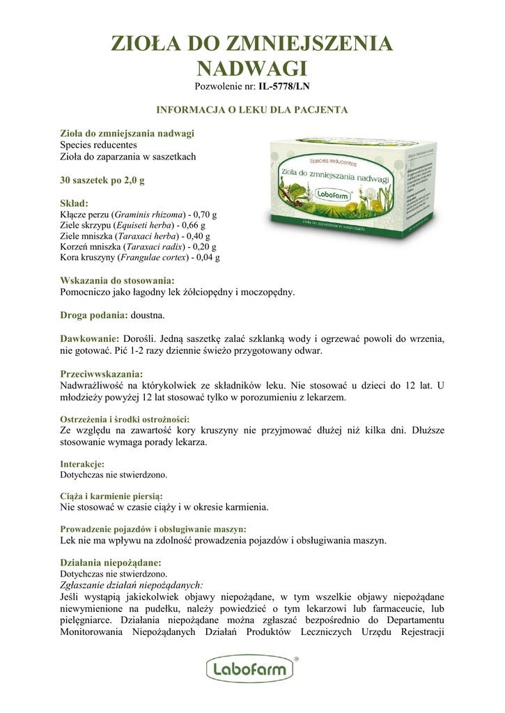 ZIOŁA DO ZMNIEJSZENIA NADWAGI Pozwolenie nr: IL-5778/LN INFORMACJA O LEKU DLA PACJENTA Zioła do zmniejszania nadwagi Species reducentes Zioła do zaparzania w saszetkach 30 saszetek po 2,0 g Skład: Kłącze perzu (Graminis rhizoma) - 0,70 g Ziele skrzypu (Equiseti herba) - 0,66 g Ziele mniszka (Taraxaci herba) - 0,40 g Korzeń mniszka (Taraxaci radix) - 0,20 g Kora kruszyny (Frangulae cortex) - 0,04 g Wskazania do stosowania: Pomocniczo jako łagodny lek żółciopędny i moczopędny. Droga podania: doustna. Dawkowanie: Dorośli. Jedną saszetkę zalać szklanką wody i ogrzewać powoli do wrzenia, nie gotować. Pić 1-2 razy dziennie świeżo przygotowany odwar. Przeciwwskazania: Nadwrażliwość na którykolwiek ze składników leku. Nie stosować u dzieci do 12 lat. U młodzieży powyżej 12 lat stosować tylko w porozumieniu z lekarzem. Ostrzeżenia i środki ostrożności: Ze względu na zawartość kory kruszyny nie przyjmować dłużej niż kilka dni. Dłuższe stosowanie wymaga porady lekarza. Interakcje: Dotychczas nie stwierdzono. Ciąża i karmienie piersią: Nie stosować w czasie ciąży i w okresie karmienia. Prowadzenie pojazdów i obsługiwanie maszyn: Lek nie ma wpływu na zdolność prowadzenia pojazdów i obsługiwania maszyn. Działania niepożądane: Dotychczas nie stwierdzono. Zgłaszanie działań niepożądanych: Jeśli wystąpią jakiekolwiek objawy niepożądane, w tym wszelkie objawy niepożądane niewymienione na pudełku, należy powiedzieć o tym lekarzowi lub farmaceucie, lub pielęgniarce. Działania niepożądane można zgłaszać bezpośrednio do Departamentu Monitorowania Niepożądanych Działań Produktów Leczniczych Urzędu Rejestracji ZIOŁA DO ZMNIEJSZENIA NADWAGI Produktów Leczniczych, Wyrobów Medycznych i Produktów Biobójczych: Al. Jerozolimskie 181C, 02-222 Warszawa, tel.: 22 49-21-301, fax: 22 49-21-309, e-mail: [email protected]. Działania niepożądane można zgłaszać również podmiotowi odpowiedzialnemu. Dzięki zgłaszaniu działań niepożądanych można będzie zgromadzić więcej informacji na temat bezpieczeństwa stosowania leku. Przedawkowanie: Dotychczas nie stwierdzono. Pominięcie zastosowania: Nie należy stosować dawki podwójnej w celu uzupełnienia pominiętej dawki. Przechowywanie: Przechowywać w zamkniętych opakowaniach, w temperaturze nie wyższej niż 30C. Przechowywać w miejscu niedostępnym i niewidocznym dla dzieci. Produkt leczniczy wydawany bez przepisu lekarza – OTC. Podmiot odpowiedzialny: Laboratorium Farmaceutyczne Labofarm Sp. z o.o. S. k. ul. Lubichowska 176 b 83-200 Starogard Gdański tel. 058 561 20 08 e-mail: [email protected] Termin ważności: Nr serii: Data zatwierdzenia informacji: 09.11.2016