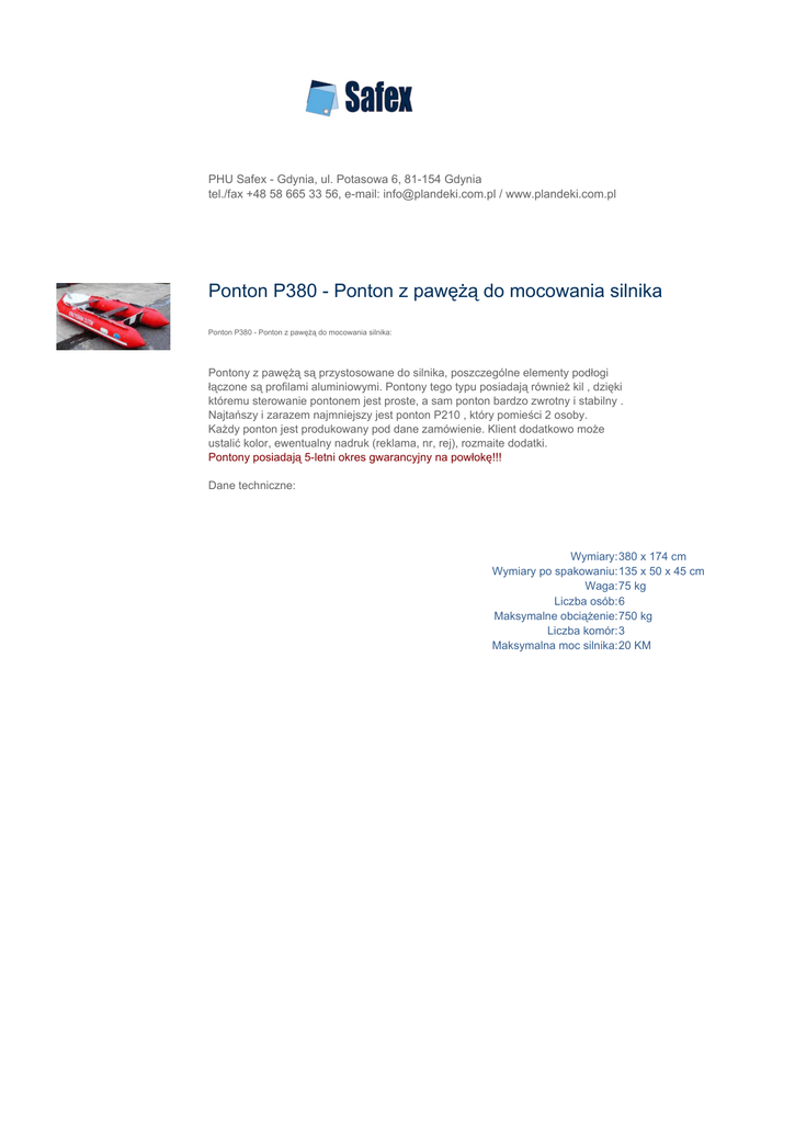 PHU Safex - Gdynia, ul. Potasowa 6, 81-154 Gdynia tel./fax +48 58 665 33 56, e-mail: [email protected] / www.plandeki.com.pl Ponton P380 - Ponton z pawężą do mocowania silnika Ponton P380 - Ponton z pawężą do mocowania silnika: Pontony z pawężą są przystosowane do silnika, poszczególne elementy podłogi łączone są profilami aluminiowymi. Pontony tego typu posiadają również kil , dzięki któremu sterowanie pontonem jest proste, a sam ponton bardzo zwrotny i stabilny . Najtańszy i zarazem najmniejszy jest ponton P210 , który pomieści 2 osoby. Każdy ponton jest produkowany pod dane zamówienie. Klient dodatkowo może ustalić kolor, ewentualny nadruk (reklama, nr, rej), rozmaite dodatki. Pontony posiadają 5-letni okres gwarancyjny na powłokę!!! Dane techniczne: Wymiary:380 x 174 cm Wymiary po spakowaniu:135 x 50 x 45 cm Waga:75 kg Liczba osób:6 Maksymalne obciążenie:750 kg Liczba komór:3 Maksymalna moc silnika:20 KM