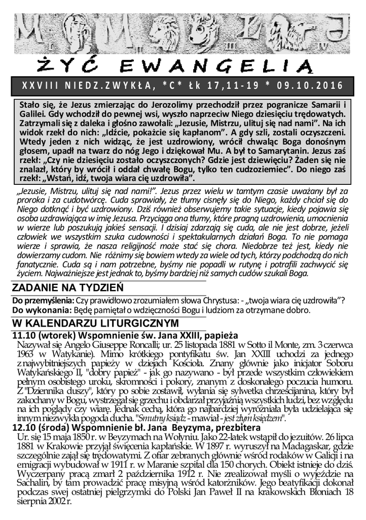 XXVIII NIEDZ.ZWYKŁA, *C* Łk 17,11-19 * 09.10.2016 Stało się, że Jezus zmierzając do Jerozolimy przechodził przez pogranicze Samarii i Galilei. Gdy wchodził do pewnej wsi, wyszło naprzeciw Niego dziesięciu trędowatych. Zatrzymali się z daleka i głośno zawołali: „Jezusie, Mistrzu, ulituj się nad nami”. Na ich widok rzekł do nich: „Idźcie, pokażcie się kapłanom”. A gdy szli, zostali oczyszczeni. Wtedy jeden z nich widząc, że jest uzdrowiony, wrócił chwaląc Boga donośnym głosem, upadł na twarz do nóg Jego i dziękował Mu. A był to Samarytanin. Jezus zaś rzekł: „Czy nie dziesięciu zostało oczyszczonych? Gdzie jest dziewięciu? Żaden się nie znalazł, który by wrócił i oddał chwałę Bogu, tylko ten cudzoziemiec”. Do niego zaś rzekł: „Wstań, idź, twoja wiara cię uzdrowiła”. „Jezusie, Mistrzu, ulituj się nad nami!”. Jezus przez wielu w tamtym czasie uważany był za proroka i za cudotwórcę. Cuda sprawiały, że tłumy cisnęły się do Niego, każdy chciał się do Niego dotknąć i być uzdrowiony. Dziś również obserwujemy takie sytuacje, kiedy pojawia się osoba uzdrawiająca w imię Jezusa. Przyciąga ona tłumy, które pragną uzdrowienia, umocnienia w wierze lub poszukują jakieś sensacji. I dzisiaj zdarzają się cuda, ale nie jest dobrze, jeżeli człowiek we wszystkim szuka cudowności i spektakularnych działań Boga. To nie pomaga wierze i sprawia, że nasza religijność może stać się chora. Niedobrze też jest, kiedy nie dowierzamy cudom. Nie różnimy się bowiem wtedy za wiele od tych, którzy podchodzą do nich fanatycznie. Cuda są i nam potrzebne, byśmy nie popadli w rutynę i potrafili zachwycić się życiem. Najważniejsze jest jednak to, byśmy bardziej niż samych cudów szukali Boga. ZADANIE NA TYDZIEŃ Do przemyślenia: Czy prawidłowo zrozumiałem słowa Chrystusa: - „twoja wiara cię uzdrowiła”? Do wykonania: Będę pamiętał o wdzięczności Bogu i ludziom za otrzymane dobro. W KALENDARZU LITURGICZNYM 11.10 (wtorek) Wspomnienie św. Jana XXIII, papieża Nazywał się Angelo Giuseppe Roncalli; ur. 25 listopada 1881 w Sotto il Monte, zm. 3 czerwca 1963 w Watykanie). Mimo krótkiego pontyfikatu św. Jan XXIII uchodzi za jednego z najwybitniejszych papieŜy w dziejach Kościoła. Znany głównie jako inicjator Soboru Watykańskiego II, "dobry papieŜ" - jak go nazywano - był przede wszystkim człowiekiem pełnym osobistego uroku, skromności i pokory, znanym z doskonałego poczucia humoru. Z "Dziennika duszy", który po sobie zostawił, wyłania się sylwetka chrześcijanina, który był zakochany w Bogu, wystrzegał się grzechu i obdarzał przyjaźnią wszystkich ludzi, bez względu na ich poglądy czy wiarę. Jednak cechą, która go najbardziej wyróŜniała była udzielająca się innym niezwykła pogoda ducha. "Smutny ksiądz - mawiał - jest złym księdzem". 12.10 (środa) Wspomnienie bł. Jana Beyzyma, prezbitera Ur. się 15 maja 1850 r. w Beyzymach na Wołyniu. Jako 22-latek wstąpił do jezuitów. 26 lipca 1881 w Krakowie przyjął święcenia kapłańskie. W 1897 r. wyruszył na Madagaskar, gdzie szczególnie zajął się trędowatymi. Z ofiar zebranych głównie wśród rodaków w Galicji i na emigracji wybudował w 1911 r. w Maranie szpital dla 150 chorych. Obiekt istnieje do dziś. Wyczerpany pracą zmarł 2 października 1912 r. Nie zrealizował myśli o wyjeździe na Sachalin, by tam prowadzić pracę misyjną wśród katorŜników. Jego beatyfikacji dokonał podczas swej ostatniej pielgrzymki do Polski Jan Paweł II na krakowskich Błoniach 18 sierpnia 2002 r. 13.10 (czwartek) Wspomnienie bł. Honorata Koźmińskiego, prezbitera Urodzony 16 października 1829 r. w Białej Podlaskiej, zm. 16 grudnia 1916 r. w Nowym Mieście). Jako student wydziału budownictwa Warszawskiej Szkoły Sztuk Pięknych w młodości stracił wiarę. Powrócił do niej w cytadeli, gdzie osadzono go pod zarzutem udziału w spisku. Po zwolnieniu wstąpił do zakonu kapucynów. Święcenia kapłańskie przyjął w 1852 r. )d 1889 r. zakładał liczne zgromadzenia bezhabitowe, czyli utajone wobec włdz carskich. Ich celem było prowadzenie domów opieki dla starców i chorych, internatów dla uczącej się młodzieŜy, stołówek dla ubogich i noclegowni. W zakonie wyróŜniał się praktykowaniem pokuty, pokory i posłuszeństwa. Beatyfikował go w 1988 r. Jan Paweł II. 14.10 (piątek) Wspomnienie św. Małgorzaty Marii Alacoque, dziewicy Urodzona 22 lipca 1647 w Lauthecourt – dziś część Verosvres – we Francji, zm. 17 października 1690 w Paray-le-Monial). W dzień św. Jana Ewangelisty (27 XII 1673 r.), Święta Małgorzata, dzięki specjalnej łasce mistycznej, została obdarzona poznaniem tajemnic Najświętszego Serca Pana Jezusa. Odkryła, Ŝe Serce Zbawiciela - tak często przez ludzi zapominane - wciąŜ świadczy o hojnej miłości Boga względem całej ludzkości. Jezus prosił ją o czynienie zadośćuczynienia za niewdzięczność tylu ludzi wobec bezgranicznej Miłość Boga, objawionej w dramacie Golgoty. Potem były kolejne objawienia, Jezus udzielał jej wskazań, jak szerzyć kult Jego Najświętszego Serca. Głębię duchowości związaną z kultem Serca Jezusa ukazywał nam wiele razy św. Jan Paweł II: Aby dziś prowadzić ewangelizację, trzeba uznać, Ŝe Serce Chrystusa jest sercem Kościoła. To Serce wzywa nas do nawrócenia i do pojednania. Jedynie to Serce 15.10 (sobota) Wspomnienie św. Teresy z Avila, dziewicy i doktora Kościoła Urodzona 28 marca 1515 w Ávila, zm. 15 października 1582 w Alba de Tormes – hiszpańska mistyczka, karmelitanka, pisarka kontrreformacji i teolog Ŝycia kontemplacyjnego. Była równieŜ reformatorką zakonu karmelitów i wraz ze świętym Janem od KrzyŜa jest uwaŜana za załoŜycielkę karmelitów bosych. Św. Teresie z Avila zawdzięczamy bogatą refleksję o zamieszkiwaniu trzech Boskich Osób w duszy chrześcijanina (por. Tw