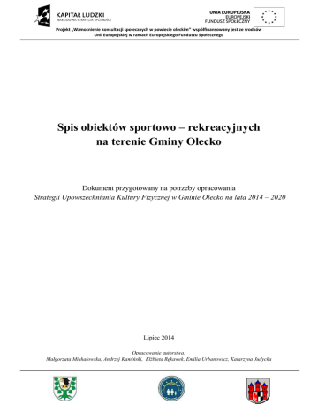 Projekt „Wzmocnienie konsultacji społecznych w powiecie oleckim’’ współfinansowany jest ze środków Unii Europejskiej w ramach Europejskiego Funduszu Społecznego Spis obiektów sportowo – rekreacyjnych na terenie Gminy Olecko Dokument przygotowany na potrzeby opracowania Strategii Upowszechniania Kultury Fizycznej w Gminie Olecko na lata 2014 – 2020 Lipiec 2014 Opracowanie autorstwa: Małgorzata Michałowska, Andrzej Kamiński, Elżbieta Rękawek, Emilia Urbanowicz, Katarzyna Judycka Projekt „Wzmocnienie konsultacji społecznych w powiecie oleckim’’ współfinansowany jest ze środków Unii Europejskiej w ramach Europejskiego Funduszu Społecznego Rozwój aktywności fizycznej i uprawiania różnorakich dyscyplin sportu uwarunkowany jest dostępnością do obiektów sportowych, ich stanem technicznym oraz wyposażeniem i jego jakością. Infrastruktura sportowo - rekreacyjna powinna być ogólnodostępna dla wszystkich grup społecznych, spełniać warunki bezpieczeństwa użytkowników tych obiektów oraz zapewniać właściwe warunki higieniczno-sanitarne do uczestnictwa w zajęciach sportowych, aktywności ruchowej, wypoczynku i zabawie. Prowadzenie aktywnego fizycznie trybu życia przez lokalne społeczeństwo wymaga opracowania systemu wsparcia, w tym finansowego obiektów sportowych, umożliwiającego łatwy dostęp do obiektów osobom prowadzącym aktywny styl życia. Obejmuje to publiczne finansowanie budowy, renowacji, modernizacji oraz konserwacji obiektów sportowych i sprzętu sportowego, a także możliwości nieodpłatnego lub za niewielką odpłatnością wykorzystania publicznych obiektów sportowo - rekreacyjnych. Nowoczesna infrastruktura sportowo-rekreacyjna stanowi jeden z podstawowych warunków aktywności w powszechnej kulturze fizycznej jak największej liczby mieszkańców, niezależnie od wieku, płci, stopnia sprawności fizycznej i statusu materialnego. Rozbudowa bazy sportowej i przygotowanie kadr dla kultury fizycznej są podstawowymi instrumentami w kreowaniu polityki w zakresie rozwoju kultury fizycznej i sportu. Na terenie Gminy Olecko jest wiele obiektów sportowych, rekreacyjnych sprzyjających rozwojowi i upowszechnianiu kultury fizycznej. Największy kompleks sportowo – rekreacyjny mieści się w Olecku w zabytkowym Parku Sportu i Rekreacji bezpośrednio przylegającym do Jeziora Oleckie Wielkie, w skład którego wchodzą: stadion lekkoatletyczno – piłkarski, boisko piłkarskie ze sztuczną murawą, boiska do siatkówki plażowej, korty tenisowe, amfiteatr - kamienna półrotunda. Ponadto na jego terenie znajduje się również nowowybudowana hala sportowo – widowiskowa „Lega”, w której jest: hala widowiskowo – sportowa, basen pływacki 25 m i rekreacyjny z jacuzzi oraz z atrakcyjnymi natryskami, ścianka wspinaczkowa, siłownia, sala do sportów walki, sala fitness, sala do squash, zespół SPA z sauną suchą i mokrą, łaźnią parową i solną, grotą lodową, kabiną infrared, pomieszczeniami do masażu, prysznicami wrażeń, pomieszczeniami do wypoczynku. Uzupełnieniem obiektów sportowych jest znajdujące się na terenie kompleksu obozowisko – pole biwakowe wraz z zapleczem socjalno - sanitarnym, które może jednorazowo pomieścić 60 osób. W hali sportowo – widowiskowej „Lega” możliwe jest organizowanie imprez sportowo – kulturalnych, które może jednorazowo obserwować ponad 1000 widzów. Przy hali usytuowany jest parking na 122 samochody osobowe (w tym 12 stanowisk dla osób niepełnosprawnych) oraz 8 autobusów. W minionych latach nad jeziorem organizowane były miejsca do kąpieli na plaży miejskiej „Skocznia”, „Szyjka”, „Dzika Plaża” oraz plaży „Dworek Mazurski”. Obecnie są dwa miejsca do kąpieli strzeżone, tj. „Skocznia” i „Szyjka”. Na plaży miejskiej „Skocznia” znajduje się wypożyczalnia sprzętu wodnego (45 kajaków z wyposażeniem, 4 rowery wodne, 10 łodzi wiosłowych), baza Wodnego Ochotniczego Pogotowia Ratunkowego. Na plaży miejskiej „Skocznia” i „Szyjka” znajdują się boiska do plażowej siatkówki i piłki nożnej. Projekt „Wzmocnienie konsultacji społecznych w powiecie oleckim’’ współfinansowany jest ze środków Unii Europejskiej w ramach Europejskiego Funduszu Społecznego Rozmieszczenie obiektów sportowo – rekreacyjnych znajdujących się w Parku Sportu i Rekreacji przedstawia poniższa mapa sytuacyjna. Rysunek 1. Park Sportu i Rekreacji w Olecku – mapa sytuacyjna. Miłośnicy sportów ekstremalnych mają do dyspozycji skate park, a osoby chętne do podniesienia sprawności na dworze mają do dyspozycji siłownię plenerową. Ponadto w sąsiedztwie jeziora znajdują się wyznaczone i oznakowane trasy biegowe w parku oraz trasa przyrodnicza tzw. Wiewiórcza Ścieżka. Dla dzieci utworzone są na terenie miasta 2 place zabaw (ul. Plac Wolności i ul .Sembrzyckiego). Ponadto, poza obiektami znajdującymi się w kompleksie sportowo – rekreacyjnym na ternie gminy funkcjonują boiska sportowe i sale gimnastyczne, w tym: boiska do piłki nożnej – 15 (5 – na terenie miasta i 10 na wsi), piłki koszykowej – 5(na terenie miasta), piłki ręcznej o nawierzchni asfaltowej – 4 (na terenie miasta), wielofunkcyjne – 7 (4 – na terenie miasta i 3 na wsi), sale gimnastyczne i pomocnicze – 12 (11 – na terenie miasta i 1 na wsi). Projekt „Wzmocnienie konsultacji społecznych w powiecie oleckim’’ współfinansowany jest ze środków Unii Europejskiej w ramach Europejskiego Funduszu Społecznego Stan techniczny obiektów, ich wyposażenia oraz utrzymania jest bardzo zróżnicowany, co przedstawia poniższe zestawienie. Przy ocenie infrastruktury sportowej została zastosowana czterostopniowa skala ocen obejmująca następujące kryteria: bardzo dobry – obiekty utrzymywane na bieżąco na wysokim poziomie technicznym , estetycznym, o dużej przepustowości i wykorzystaniu. Obiekty wyposażone w niezbędne urząd