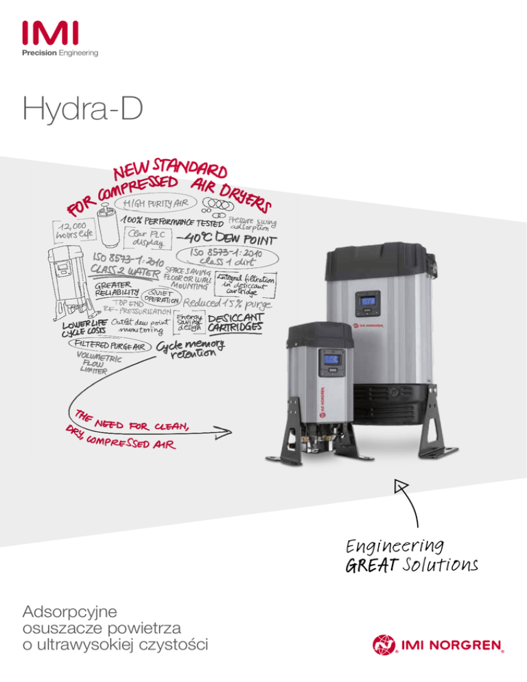 Hydra-D Engineering GREAT Solutions Adsorpcyjne osuszacze powietrza o ultrawysokiej czystości 02 Hydra-D Spis treści 03 Nasze możliwości 04 Hydra-D Rozwiązanie 05 Hydra-D Zasady działania 06 Hydra-D Charakterystyka 07 Dane techniczne Dostarczamy WSPANIAŁE rozwiązania inżynieryjne dzięki naszym pracownikom, produktom, innowacjom i usługom IMI Precision Engineering to światowy lider w dziedzinie sterowania ruchem i przepływami. Poprzez nawiązanie ścisłej współpracy z klientami dogłębnie poznajemy ich potrzeby w kontekście rozwiązań inżynieryjnych, a następnie mobilizujemy nasze zasoby i wiedzę, by dostarczyć wyjątkowe produkty i rozwiązania. Tam, gdzie decydujące znaczenie mają precyzja, szybkość i niezawodność rozwiązań inżynieryjnych, nasze globalne zasoby, doświadczenie w rozwiązywaniu problemów i oferta wysokowydajnych produktów sprawiają, że dostarczamy DOSKONAŁE rozwiązania. >Niezawodność Dostarczamy produkty wysokiej jakości i zapewniamy globalne wsparcie posprzedażowe. > Produkty o dużej wydajności W ofercie naszych światowej klasy produktów w dziedzinie sterowania przepływami i ruchem znajdują się takie marki, jak IMI Norgren, IMI Buschjost, IMI FAS, IMI Herion oraz IMI Maxseal. Jesteśmy w stanie dostarczać je osobno lub połączone w postaci doskonałych rozwiązań dostosowanych do indywidualnych potrzeb, zwiększających wydajność i produktywność. >Współpraca i rozwiązywanie problemów Nawiązujemy z naszymi klientami bliskie relacje, by precyzyjnie analizować ich problemy. Hydra-D Nasze możliwości Dzięki wieloletniemu doświadczeniu w produkcji wiodących na rynku osuszaczy sprężonego powietrza, nasz zespół doświadczonych inżynierów był w stanie zaangażować całą swoją bogatą wiedzę w wyeliminowanie wielu problemów związanych z adsorpcyjnymi osuszaczami powietrza. Seria Hydra-D IMI Norgren wyznacza nowe standardy dla osuszaczy sprężonego powietrza, łącząc najnowsze technologie zapewniające liczne zalety. Zapotrzebowanie na czyste i suche sprężone powietrze Bardzo wysoki stopień czystości Skompresowane powietrze jest ważnym źródłem energii, mającym szerokie zastosowanie w przemyśle. W przypadku niektórych procesów czyste i suche powietrze jest niezbędne do zapewnienia ich bezpiecznego, efektywnego i rentownego działania. Branże takie jak przetwórstwo i pakowanie żywności, produkcja napojów, przemysł chemiczny, farmaceutyczny, wytwórczy i przetwórczy, a także laboratoria potrzebują czystego, suchego powietrza, by funkcjonować. Problem z powietrzem polega na tym, że zawiera ono parę wodną. skraplającą się po ochłodzeniu. Woda i zabrudzenia w skompresowanym powietrzu stanowią istotny problem, ponieważ mogą uszkodzić urządzenia zasilane przez sprężarkę i zanieczyścić substancje przetwarzane przez te urządzenia. Wilgoć i wysoka temperatura sprężonego powietrza stanowią warunki sprzyjające rozwojowi mikroorganizmów, mogących być źródłem poważnych zanieczyszczeń w urządzeniach do przetwórstwa żywności lub napojów. W związku z tym, producenci wysokim nakładem kosztów usuwają wodę i brud z przewodów doprowadzających sprężone powietrze. Cicha praca Wyjątkowa efektywność 03 04 Hydra-D Hydra-D Rozwiązanie Seria osuszaczy sprężonego powietrza Hydra-D IMI Norgren pozwala skutecznie uniknąć wszelkich problemów związanych z zanieczyszczeniem sprężonego powietrza. Osuszacze Hydra-D zostały zaprojektowane z myślą o użytkownikach końcowych. Dzięki zastosowaniu nowoczesnych materiałów i najnowszych opatentowanych rozwiązań osuszacze dostarczają sprężone powietrze wysokiej jakości z dużą niezawodnością, przy niższych kosztach eksploatacji i uproszczonych procedurach konserwacji. Zalety Gwarantowana wydajność > Osuszacze Hydra-D IMI Norgren zapewniają najwyższe standardy czystości i dostarczają powietrze spełniające normę ISO 8573:1 – 2010, 2. klasy pod względem zanieczyszczeń (1 mikron) i 2. klasy pod względem zawartości wody (ciśnieniowy punkt rosy –40°C) > Wszystkie urządzenia są w pełni przetestowane pod kątem wycieków, prawidłowego funkcjonowania i wydajności Niezawodność > Wysoka skuteczność oddzielania wody, z wentylowaniem kondensatu przy każdym cyklu przy zastosowaniu zaworu elektromagnetycznego z wyzwalaczem czasowym > Wbudowany wolumetryczny ogranicznik przepływ zapobiega nadmiernej prędkości przepływu, eliminując ryzyko pojawienia się wilgoci i utraty punktu rosy > Filtry wylotowe nabojowe (patronowe) zapobiegają zanieczyszczeniu pyłem powietrza oczyszczającego, eliminując w ten sposób ryzyko zanieczyszczenia i utraty wydajności Branża piwowarska Cicha praca > Przewody wylotowe powietrza odznaczają się znacząco mniejszym poziomem hałasu Sterowanie i wyświetlacz > Czytelny wyświetlacz PLC zapewnia pełny dostęp do danych operacyjnych i monitorowania Energooszczędna konstrukcja > Wbudowane filtry wlotowe i wylotowe ograniczają spadek ciśnienia w porównaniu z filtrami zewnętrznymi Branża farmaceutyczna >Ilość powietrza oczyszczającego do regeneracji wynosi zaledwie 15% >Monitorowanie punktu rosy pozwala zaoszczędzić aż do 60% podczas podawania powietrza o obniżonej wilgotności wlotowej Prosta instalacja > Kompaktowa, zajmująca niewiele miejsca konstrukcja ze wspornikiem mocującym do podłogi lub ściany Branża spożywcza Łatwa konserwacja > Wymagane czynności serwisowe przeprowadzane co 12 000 godzin pracy polegają na wymianie opatentowanego zespołu filtra i wkładów osuszających, co zajmuje 15 minut. > Nie ma konieczności stosowania specjalnych narzędzi, brak wymagających obsługi filtrów zewnętrznych lub tłumików, nie ma potrzeby usuwania czynnika osuszającego luzem. Nowoczesne materiały dla przemysłu 05 Hydra-D Hydra-D Zasady działania Osuszacze powietrza Hydra-D wykorzystują zasadę adsorpcji zmiennociśnieniowej