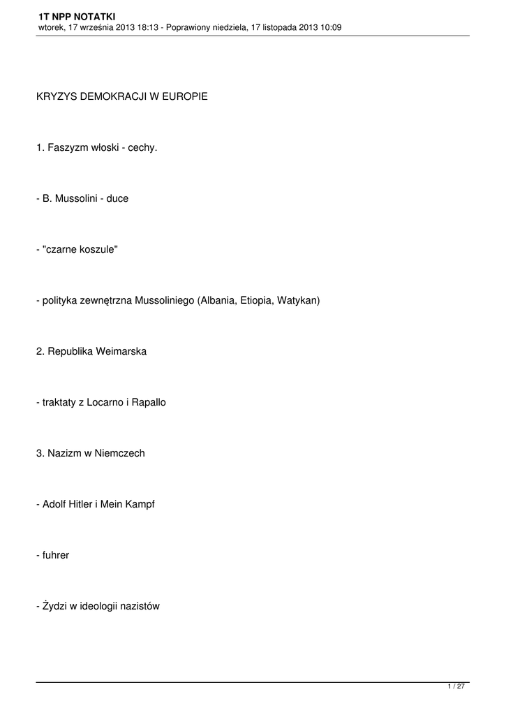 1T NPP NOTATKI wtorek, 17 września 2013 18:13 - Poprawiony niedziela, 17 listopada 2013 10:09 KRYZYS DEMOKRACJI W EUROPIE 1. Faszyzm włoski - cechy. - B. Mussolini - duce - "czarne koszule" - polityka zewnętrzna Mussoliniego (Albania, Etiopia, Watykan) 2. Republika Weimarska - traktaty z Locarno i Rapallo 3. Nazizm w Niemczech - Adolf Hitler i Mein Kampf - fuhrer - Żydzi w ideologii nazistów 1 / 27 1T NPP NOTATKI wtorek, 17 września 2013 18:13 - Poprawiony niedziela, 17 listopada 2013 10:09 - NSDAP - pucz w Monachium 4. Adolf Hitler przy władzy - okoliczności przejęcia władzy przez A. Hitlera (wybory parlamentarne - Hitler kanclerzem) - noc długich noży - polityka Hitlera po przejęciu władzy (delegalizacja KPN, walka z opozycją, rola SA i SS 5. Rządy nazistów - indoktrynacja - rola Hitlerjugend - rola propagandy (Goebbels) - początki łamania postanowień traktatu wersalskiego - ustawy norymberskie i "nac kryształowa" - walka z Żydami - obozy koncentracyjne i ich znaczenie 2 / 27 1T NPP NOTATKI wtorek, 17 września 2013 18:13 - Poprawiony niedziela, 17 listopada 2013 10:09 ZSRR W OKRESIE MIĘDZYWOJENNYM 1. Ekspansja terytorialna ROSJI BOLSZEWICKIEJ - podporządkowanie Zakaukazia (Gruzja, Armenia, Azerbejdźan) - uniezależnienie się Litwy,Łotwy, Estonii i Finlandii - XII 1922 - powstanie Związku Socjalistycznych Republik Radzieckich - ZSRR 2. Pojęcie komunizmu wojennego i Nowwej Polityki Ekonomicznej (NEP) 3. Droga Stalina do władza - likwidacja przeciwników politycznych po śmierci Lenina (1924) - czystki w WKP(b) - rola NKWD w utrzymaniu przez Stalina władzy 4. Industrializacja i kolektywizacja (wytłumaczyć pojęcia) 3 / 27 1T NPP NOTATKI wtorek, 17 września 2013 18:13 - Poprawiony niedziela, 17 listopada 2013 10:09 - sowchozy i kołchozy - rola kułaków - pojęcie gospodarki planowej - przyczyny Wielkiego Głodu na Ukrainie 5. Komunistyczny terror - ofiary systemu komunistycznego, postać Pawlika Morozowa - łagry i Gułagi - wielka czystka w l. 1936-38 6. Polityka zagraniczna ZSRR - rola układu w Rapallo - 1922 r. - pojęcie Kominternu 4 / 27 1T NPP NOTATKI wtorek, 17 września 2013 18:13 - Poprawiony niedziela, 17 listopada 2013 10:09 KULTURA OKRESU MIĘDZYWOJENNEGO 1. Zmiana roli i znaczenia kobiet w okresie międzywojennym 2. Rozwój techniki - główne wynalazki i ich społeczne znaczenie 3. Kultura masowa - pojęcie kultury masowej - rola filmu i telewizji (Charlie Chaplin, Rudolf Valentino, Greta Garbo, Pola Negri) 4. Rozwój mass mediów - pojęcie mass media - socrealizm i kino totalitarne 5. Architektura 5 / 27 1T NPP NOTATKI wtorek, 17 września 2013 18:13 - Poprawiony niedziela, 17 listopada 2013 10:09 - pojęcia: modernizm, funkcjonalizm 6. Sztuka - pojęcia: katastrofizm, egzystencjalizm - ekspresjonizm, abstrakcjonizm, kubizm POLITYKA ZAGRANICZNA II RP 1. Polska i jej sąsiedzi (podłoże konfliktu z ZSRR, Litwą, Czechosłowacją) 2. Znaczenie układów sojuszniczych Polski z Rumunią i Francją 3. Układy w Rapallo i Locarno - znaczenie dla pozycji Polski 6 / 27 1T NPP NOTATKI wtorek, 17 września 2013 18:13 - Poprawiony niedziela, 17 listopada 2013 10:09 4. Polityka równowagi wobec Niemiec i ZSRR a. rola traktatu o nieagresji z ZSRR (VII 1932) b. rola deklaracji o niestosowaniu przemocy z Niemcami (I 1934) c. pojęcie polityki równych odległości POLSKA W PRZEDEDNIU II WOJNY ŚWIATOWEJ 1. Konflikt o Zaolzie: zajęcie przez Polskę spornych terenów po konferencji w Monachium (2 X 1938) 2. Stosunki z Litwą - III 1938 3. Okoliczności niemieckich żądań wobec Polski 4. Brytyjsko - francuskie gwarancje dla Polski - IV 1939r. 7 / 27 1T NPP NOTATKI wtorek, 17 września 2013 18:13 - Poprawiony niedziela, 17 listopada 2013 10:09 5. Pakt Ribbentrop - Mołotow (tajny protokół) 6. 25 VIII 1939 - sojusz polsko - brytyjski 7. Aktywizacja polskiego społeczeństwa. II WOJNA ŚWIATOWA 1. Początek II wojny światowej a. okoliczności ataku Niemiec i Słowacji na Polskę b. obrona Westerplatte, bombardowanie Wielunia- symbole września c. pojęcie Blitzkriegu 2. Dziwna wojna na zachodzie - działania Francji i Wielkiej Brytanii 3. Przebieg kampanii wrześniowej 8 / 27 1T NPP NOTATKI wtorek, 17 września 2013 18:13 - Poprawiony niedziela, 17 listopada 2013 10:09 a. bitwa graniczna: Mokra, Wizna b. bitwa nad Bzurą i jej znaczenia c. 17 IX - wkroczenie wojsk radzieckich, przebieg sowieckiej agresji d. ewakuacja polskich władz e. oblężenie Warszawy, bitwa pod Kockiem, kapitulacja Polski 4. Bilans września 1939 - strany ludności. PODBÓJ EUROPY PRZEZ STALINA I HITLERA 1. Agresja ZSRR (1939-1940) a. atak na Polskę 9 / 27 1T NPP NOTATKI wtorek, 17 września 2013 18:13 - Poprawiony niedziela, 17 listopada 2013 10:09 b. przebieg wojny z Finlandią (wojna zimowa (1939-40), sytuacja polityczna w Finlandii c. agresja na Litwę, Łotwę i Estonię (1939-40) d. odebranie Besarabii Rumunii (1940) 2. Atak Niemiec na Danię i Norwegię - sytuacja w tych krajach 3. Atak Niemiec na Francję a. linia Maginota b. okoliczności ataku Niemiec na Francję c. przebieg wojny i klęska Francji d. Komitet Wolnej Francji i Charles de Gaulle 4. Bitwa o Anglię a. przygotowania brytyjskie do wojny b. przebieg bitwy (rola Polaków) 10 / 27 1T NPP NOTATKI wtorek, 17 września 2013 18:13 - Poprawiony niedziela, 17 listopada 2013 10:09 5. Wojna na Bałkanach a. X 1940 atak wojsk Włoskich na Grecję, przyczyny klęski Włochów b. sojusze Niemiec na Bałkanach (szczególnie rola Jugosławii) c. IV 1941: agresja Niemiec na Grecję i Jugosławię, ustasze w Chorwacji NIEMCY PO DRUGIEJ WOJNIE ŚWIATOWEJ 1. Decyzje zwycięskich mocarstw w sprawie Niemiec (Poczdam) - 5xd: denazyfikacja, demokratyzacja, demilitaryzacja, dekartelizacja, decentralizacja 11 / 27 1T NPP NOTATKI wtorek, 17 września 2013 18:13 - Poprawiony niedziela, 17 listopada 2013 10:09 - 4 strefy okupacyjne, pojęcie Bizonii i Tryzonii 2. Procesy norymberskie 3. Kryzys berliński - przyczyny konfliktu - bloka