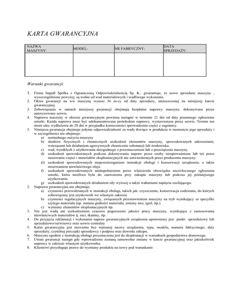 KARTA GWARANCYJNA NAZWA MASZYNY: MODEL: NR FABRYCZNY: DATA SPRZEDAŻY: Warunki gwarancji: 1. Firma Impall Spółka z Ograniczoną Odpowiedzialnością Sp. K.. gwarantuje, że nowo sprzedane maszyny , 2. 3. 4. 5. 2. 3. 4. 5. 6. 7. 8. wyszczególnione powyżej, są wolne od wad materiałowych i wadliwego wykonania. Okres gwarancji na ww maszynę wynosi 36 m-cy od daty sprzedaży, umieszczonej na niniejszej karcie gwarancyjnej. Zobowiązania w ramach niniejszej gwarancji obejmują bezpłatne naprawy maszyny, dokonywane przez autoryzowany serwis. Naprawa maszyny w okresie gwarancyjnym powinna nastąpić w terminie 21 dni od daty pisemnego zgłoszenia usterki. Każda naprawa musi być udokumentowana protokołem naprawy, wystawionym przez serwis. Termin ten może ulec wydłużeniu do 28 dni w przypadku konieczności sprowadzenia części z zagranicy. Niniejsza gwarancja obejmuje jedynie odpowiedzialność za wady tkwiące w produkcie w momencie jego sprzedaży i w szczególności nie obejmuje: a) normalnego zużycia maszyny b) skutków fizycznych i chemicznych uszkodzeń elementów maszyny, spowodowanych uderzeniami, wstrząsami lub działaniem agresywnych chemicznie substancji lub środowiska. c) wad, wynikłych z użytkowania niezgodnego z przeznaczeniem lub z przeciążenia maszyny. d) uszkodzeń spowodowanych podczas dokonywania napraw przez osoby nieupoważnione lub też przez stosowanie części i materiałów eksploatacyjnych nie zatwierdzonych przez producenta maszyny. e) uszkodzeń spowodowanych nieprzestrzeganiem instrukcji obsługi i konserwacji urządzenia, a także stosowaniem niewłaściwego oleju f) uszkodzeń spowodowanych niedopełnieniem przez właściciela obowiązku niezwłocznego zgłoszenia usterki, która możliwa była do zauważenia przy zakupie maszyny lub podczas jej późniejszego użytkowania. g) uszkodzeń spowodowanych działaniem siły wyższej a także wahaniami napięcia zasilającego. Naprawa gwarancyjna nie obejmuje: a) czynności przewidzianych w instrukcji obsługi, takich jak: czyszczenie, konserwacja codzienna, do których zobowiązany jest użytkownik we własnym zakresie b) czynności regulacyjnych maszyny, związanych przestawieniem maszyny na tryb wynikający ze specyfiki szytego materiału (np. zmiana grubości materiału, zmiany nici, igieł, itp.). c) wymiany elementów eksploatacyjnych itp. Nie jest wadą ani uszkodzeniem czasowe pogorszenie jakości pracy maszyny, wynikające z zastosowania niewłaściwych materiałów tj. nici, tkaniny, itp. Do przyjęcia reklamacji i wykonania napraw gwarancyjnych urządzenia uprawniony jest punkt sprzedażowy lub sprzedażowo/serwisowy oraz serwis centralny Karta gwarancyjna jest nieważna bez wpisanej nazwy urządzenia, typu, modelu, numeru fabrycznego, daty sprzedaży, czytelnej pieczątki sprzedawcy i podpisu oraz dowodu zakupu. Maszyna zgodnie z instrukcją obsługi przeznaczona jest do eksploatacji w warunkach gospodarstwa domowego. Utrata gwarancji nastąpi gdy wprowadzone zostaną samowolne zmiany w karcie gwarancyjnej oraz jakiekolwiek naprawy w zakresie własnym użytkownika. Klientowi przysługuje prawo do wymiany produktu na nowy pod warunkami: a) 9. 10. 11. 12. 13. w okresie gwarancji dokonano pięciu napraw, a urządzenie będzie wykazywało wady, które uniemożliwiają poprawną jego pracę b) serwis centralny stwierdzi na piśmie że usunięcie wady jest niemożliwe. Sprzęt musi znajdować się w oryginalnym opakowaniu. W przypadku bezpodstawnego zgłoszenia urządzenia do naprawy gwarancyjnej, koszty z tym związane ponosi użytkownik w pełnej wysokości. Gwarant nie ponosi odpowiedzialności za jakość usług punktów serwisowych. Serwis centralny: Impall Spółka z Ograniczoną Odpowiedzialnością Sp. K. do Działu Serwisu, ul. Pojezierska 95 w Łodzi, tel. (42) 640 30 13 wew. 115 lub 116 Gwarant: Impall Spółka z Ograniczoną Odpowiedzialnością Sp. K, ul. Pojezierska 95, 91-341 Łódź …………………........ Pieczątka sklepu .......................................... Podpis sprzedawcy ....................................................... Pieczątka autoryzowanego serwisu Adnotacje serwisowe: DATA ZGŁOSZENIA DATA WYKONANIA OPIS CZYNNOŚCI SERWISOWYCH PIECZĄTKA I PODPIS SERWISU