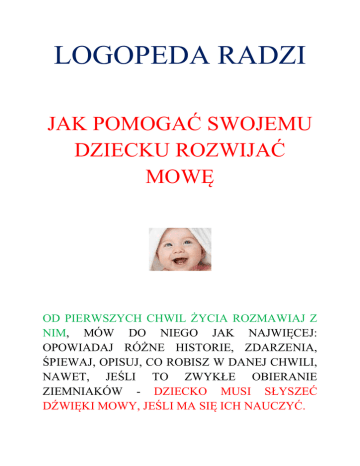 LOGOPEDA RADZI JAK POMOGAĆ SWOJEMU DZIECKU ROZWIJAĆ MOWĘ OD PIERWSZYCH CHWIL ŻYCIA ROZMAWIAJ Z NIM, MÓW DO NIEGO JAK NAJWIĘCEJ: OPOWIADAJ RÓŻNE HISTORIE, ZDARZENIA, ŚPIEWAJ, OPISUJ, CO ROBISZ W DANEJ CHWILI, NAWET, JEŚLI TO ZWYKŁE OBIERANIE ZIEMNIAKÓW - DZIECKO MUSI SŁYSZEĆ DŹWIĘKI MOWY, JEŚLI MA SIĘ ICH NAUCZYĆ. Gdy mówisz do dziecka, staraj się posługiwać prostymi zdaniami, unikaj niepotrzebnego spieszczania, tak zwana „mowa nianiek” nie pomaga twojemu dziecku w rozwoju kompetencji językowych (nieprawidłowy wzorzec językowy to jedna z przyczyn wad wymowy u dziecka). Dużo i systematycznie czytaj swojemu dziecku. Bajki, wiersze, wierszyki, rymowanki wzbogacają jego słownik czynny i bierny, pobudzają wyobraźnię, zacieśniają więź między wami (czas spędzony z dzieckiem jest bezcenny dla jego rozwoju mowy i nie tylko). Pamiętaj, że to, co naturalne, nie szkodzi twojemu dziecku, jeśli jednak z jakiś względów twoje dziecko korzysta z butelki, skróć maksymalnie okres jego karmienia, nie używaj dodatkowo smoczków ani gryzaków; utrudniają one prawidłowe ułożenie języka w jamie ustnej oraz wpływają negatywnie na sprawność języka. Nie przedłużaj okresu „papkowatego jedzenia”, dziecko musi nauczyć się prawidłowo gryźć, przeżuwać i połykać. Wprowadzaj do języka dziecka onomatopeje, tak zwane wyrazy dźwiękonaśladowcze, wzbogacają one mowę dziecka o nowe sylaby, a przecież sylaby budują późniejsze wyrazy. ONOMATOPEJE Jak robi kurka? Ko, ko, ko Jak robi kotek? Miał, miał, miał Jak robi owieczka? Be, be, be Jak robi krówka? Muuuu…. Jak robi gąska? Gę, gę, gę Jak robi piesek? Hau, hau, hau Jak pada deszczyk? Kap, kap, kap Jak robi pszczółka? Bzzzz… Jak robi wąż? Ssss…………. ĆWICZENIA BUZI I JĘZYKA Spróbuj ćwiczyć buzię i język dziecka; to poprawia ich sprawność oraz precyzję ruchów: - oblizywanie górnej i dolnej wargi - wylizywanie talerzyka - język raz w prawo, raz w lewą stronę - nauka kląskania (dźwięk wydawany przez konika) - parskanie - picie przez słomkę - nadymanie policzków