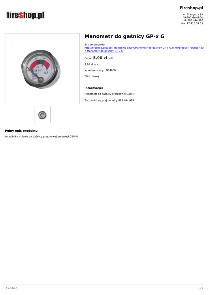 Fireshop.pl ul. Traugutta 9A 49-200 Grodków tel: 888 444 998 fax: 77 415 37 11 Manometr do gaśnicy GP-x G link do produktu: http://fireshop.pl/czesci-do-gasnic-gzwm/Manometr-do-gasnicy-GP-x-G.html?product_rewrite=30 7-Manometr-do-gasnicy-GP-x-G Cena: 5,90 zł netto 5,90 zł za szt. Nr referencyjny: G04060 Stan: Nowy Informacje: Manometr do gaśnicy proszkowej GZWM. Zadzwoń i zapytaj doradcy 888 444 998 Pełny opis produktu Wskaźnik ciśnienia do gaśnicy proszkowej produkcji GZWM. 4-03-2017 1/1
