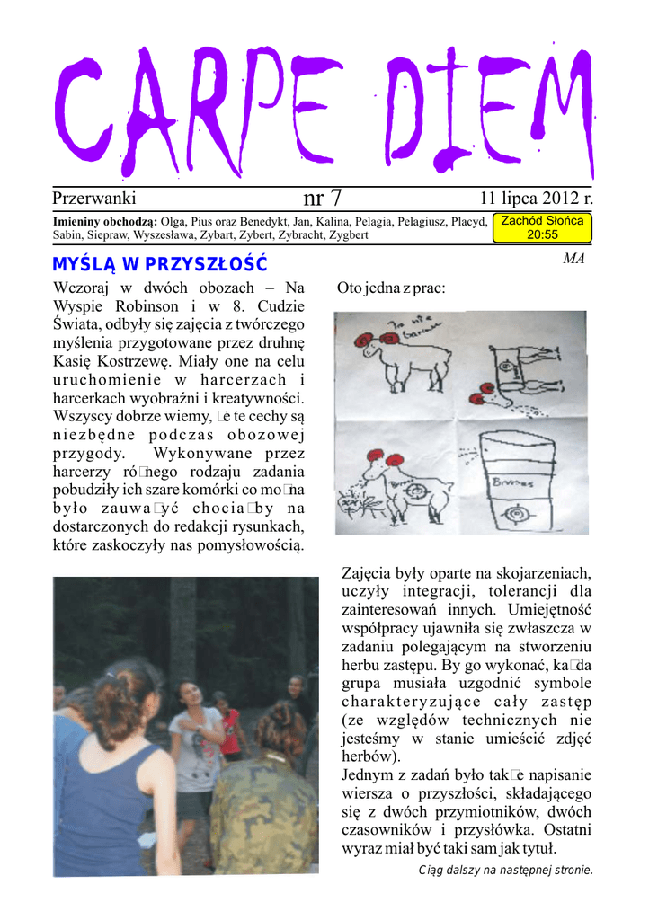 Przerwanki nr 7 11 lipca 2012 r. Imieniny obchodzą: Olga, Pius oraz Benedykt, Jan, Kalina, Pelagia, Pelagiusz, Placyd, Sabin, Siepraw, Wyszesława, Zybart, Zybert, Zybracht, Zygbert MA MYŚLĄ W PRZYSZŁOŚĆ Wczoraj w dwóch obozach – Na Wyspie Robinson i w 8. Cudzie Świata, odbyły się zajęcia z twórczego myślenia przygotowane przez druhnę Kasię Kostrzewę. Miały one na celu uruchomienie w harcerzach i harcerkach wyobraźni i kreatywności. Wszyscy dobrze wiemy, że te cechy są niezbędne podczas obozowej przygody. Wykonywane przez harcerzy różnego rodzaju zadania pobudziły ich szare komórki co można było zauważyć chociażby na dostarczonych do redakcji rysunkach, które zaskoczyły nas pomysłowością. Zachód Słońca 20:55 Oto jedna z prac: Zajęcia były oparte na skojarzeniach, uczyły integracji, tolerancji dla zainteresowań innych. Umiejętność współpracy ujawniła się zwłaszcza w zadaniu polegającym na stworzeniu herbu zastępu. By go wykonać, każda grupa musiała uzgodnić symbole charakteryzujące cały zastęp (ze względów technicznych nie jesteśmy w stanie umieścić zdjęć herbów). Jednym z zadań było także napisanie wiersza o przyszłości, składającego się z dwóch przymiotników, dwóch czasowników i przysłówka. Ostatni wyraz miał być taki sam jak tytuł. Ciąg dalszy na następnej stronie. CARPE DIEM - Gazetka obozowa Oto jeden z wierszy: Nr 7 - 11 lipca 2012 r. „Przyszłość” Mroczna Tajemnicza Niespodziewana Nadchodzi Czeka na Nas Złowieszczo Przyszłość... Z NOTATNIKA DRUHA ADAMA cz. II Nasz korespondent Adam znów dla nas napisał. Tym razem będziecie mogli przeczytać wywiad z naszą obozową pielęgniarką – Renatą Kaźmierczak oraz krótki artykuł pt. „Noc w lesie”. Zapraszamy do czytania, ale także do pisania. A.B.: Od ilu lat Pani pracuje? R.K: Od około 20 lat. Z jakimi dolegliwościami najczęściej przychodzą do Pani dzieci? Z zadrapaniami, bólami brzucha i głowy. Czemu Pani przyjeżdża na obozy? Z sentymentu. Przyjeżdżałam tu przed laty jako harcerka, a potem instruktorka. Dla ciekawych dodam, że druh Komendant też był ze mną na obozie. Czy Pani koleżanka też jest pielęgniarką tak długo jak Pani? Nie, od około 13 lat. Dziękuję za rozmowę i za wywiad. Noc w lesie 8. Cud Świata spał wczoraj w lesie, w szałasach. Zrobiliśmy je sami, bez niczyjej pomocy. Nie używaliśmy młotków, gwoździ, siekier ani pił. Używaliśmy tylko swoich rąk. Spaliśmy w lesie podzieleni na cztery zastępy: Harcerscy traperzy, Dzikie wieprze, Dziewczyny z survivalu, Szkoła przetrwania. CARPE DIEM - Gazetka obozowa Nr 7 - 11 lipca 2012 r. PRZEŻYCIA Z WYSPY ROBINSON Publikujemy kolejny odcinek odpowiadania Lany Dzień drugi Wstałyśmy, nie mam pojęcia o której, czułyśmy tylko grzejące nasze ciała promienie. Jenny z kursu wiedziała, że najważniejsza jest w tym momencie woda, lecz nie mogłyśmy jej wziąć z oceanu. Wyruszyłyśmy więc wgłąb wyspy, mając nadzieję na znalezienie cywilizacji. Szłyśmy bardzo długo, czułyśmy że z minuty na minutę, słońce odbiera nam coraz więcej siły. Chwilę po tym, znalazłyśmy malutki strumyczek wypływający ze skały.Nasz instynkt pradawnych przodków obudził się w nas i w końcu zaczęłyśmy walczyć o przetrwanie. Pod ręką miałyśmy tylko liście, drzewa, a w uszach tylko odgłosy wydobywane przez tamtejsze zwierzęta. Nasza przygoda zdawała się dopiero zaczynać. Zabrałyśmy się więc do nabrania wody, bo to ona była przecież teraz najważniejsza. Z zapasami, które miały nam starczyć do południa nastęnego dnia, wróciłyśmy do prowizorycznego ukrycia, które zrobiłyśmy na plaży między skałami. Lana - Oliwia Fabińska. OGŁOSZENIE Szukam metalowego kubka. Ma zawieszkę na pasek. Było napisane na nim coś, ale nie pamiętam. Oddam swój podwieczorek. PILNE! Zuch Kamil z Józefowa OSTATNIE JUŻ ŚNIADANIE Dość oryginalnie, bo w piżamach zjedli śniadanie przywódcy Szczepu „NIE” . Zrobili tak z okazji zakończenia ich turnusu! Do zobaczenia za rok…. MG o 26oC ŚRODA - 11 LIPCA o o 22 C CZWARTEK - 12 LIPCA o o 18 C PIĄTEK - 13 LIPCA CARPE DIEM - Gazetka obozowa BYĆ BOHATEREM… Zajęcia na zamówienie dla koloni zuchowej z Otwocka przeprowadziła dzisiaj przed obiadem dh. Magda Grodzka. Spotkanie miało na celu zapoznanie młodych ludzi poprzez zabawę i skojarzenia z postaciami różnych bohaterów. Zuchy odnajdywały cechy bohaterów w różnych ludziach np.: pisarzach, piłkarzach, lekarzach itp. Nr 7 - 11 lipca 2012 r. Magda G. Poprzez trening musztry ćwiczyły karność i reagowanie na rozkazy, poszukiwały snajpera oraz śpiewały piosenki. Poznały wojenną strukturę Szarych Szeregów i dowiedziały się co to był Rój „Sosny”, obecny bohater Hufca Otwock. Redakcja: Marlena Gacka, Anna Rowińska, Marta Fornalska. Siedziba redakcji znajduje się w kurniku.