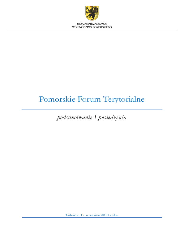 Pomorskie Forum Terytorialne podsumowanie I posiedzenia Gdańsk, 17 września 2014 roku Pomorskie Forum Terytorialne Inauguracyjne posiedzenie Pomorskiego Forum Terytorialnego odbyło się 17 września 2014 r. w Ośrodku Kultury Morskiej Narodowego Muzeum Morskiego w Gdańsku. Zaproszenie Marszałka Województwa Pomorskiego do prac w Forum przyjęli byli Marszałkowie Województwa, reprezentanci władz największych miast regionu, przedstawiciele gospodarki, sektora pozarządowego, instytucji akademickich i badawczych. 25 lat polskiej transformacji i 10 lat obecności w Unii Europejskiej są dobrym momentem, by zastanowić się, jak będzie wyglądać województwo pomorskie za ponad dekadę. Stąd, wątkiem wiodącym spotkania było Quo Vadis Pomerania? - pytanie o przyszłość regionu w perspektywie 2030 roku, jego ścieżkę rozwoju, przewagi konkurencyjne, zagrożenia i korzyści wynikające ze zmieniających się realiów ekonomicznych, społecznych i geopolitycznych. Katalizatorami dyskusji były wystąpienia członków PFT: Pana Posła Jana Kozłowskiego pt. Co o nas wiemy z perspektywy Brukseli? Pana Profesora Jacka Zauchy pt. Jak skorzystać na spowolnieniu gospodarczym? Pana Prezesa Macieja Grabskiego pt. Jak skutecznie zagospodarować nasz potencjał kreatywności? Pani Profesor Iwony Sagan pt. Jak zmiany przestrzeni mogą wzmocnić naszą odporność? Pana Profesora Cezarego Obracht-Prondzyńskiego pt. Jaki kapitał społeczny pozwoli nam na unikalność i rozwój? Poszukiwanie odpowiedzi na pytania zetknęło ze sobą różne punkty widzenia, wizje i poglądy. 1 Pomorskie Forum Terytorialne Pomorskie dające pracę i rozwijające przemysł W 2030 roku Pomorskie powinno być regionem mogącym zapewnić pracę swoim mieszkańcom. Wciąż aktualnym problemem pozostaje wysokie bezrobocie, a jednocześnie niska efektywność unijnych programów na rzecz ograniczania tego zjawiska. Restrykcyjne warunki prowadzenia działalności gospodarczej (np. kwestie środowiskowe) zwiększają koszty zatrudnienia, a tym samym ograniczają liczbę miejsc pracy. W związku z tym konieczne jest znalezienie Istotnym czynnikiem warunkującym powstawanie nowych miejsc pracy jest reindustrializacja gospodarki europejskiej, co warto dotyczące czystości środowiska z możliwością przenieść na grunt regionalny. Istnieje potrzeba znalezienia niszowych, inteligentnych pomysłów na industrializację. tworzenia w przedsiębiorstwach nowych miejsc rozwiązania pośredniego, godzącego wymogi pracy. Istotnym czynnikiem warunkującym powstawanie miejsc pracy jest reindustrializacja gospodarki europejskiej, co warto przenieść na grunt regionalny. Istnieje potrzeba znalezienia niszowych, inteligentnych pomysłów na industrializację. Pomorską gospodarkę charakteryzuje niska marżowość wynikająca m.in. z braku konkurencyjnych marek (silne marki dopiero powstają). Droga do bardziej produktywnych miejsc pracy wiedzie również przez ekspansję zagraniczną. W tym zakresie istotna może być rola administracji publicznej. Pomorskie odporne na kryzys Kryzys zmienił sposób myślenia powodując odejście od gospodarki opartej na wiedzy do Istotna stała się zdolność do reagowania oraz stworzenie mechanizmu, który zapewni odporność. gospodarki opartej na mądrości i przewidywaniu. Województwo pomorskie jest dość odporne na kryzys (podobny poziom odporności zanotowało województwo mazowieckie i śląskie). Istotna stała się zdolność do reagowania oraz stworzenie mechanizmu, który zapewni odporność. W dobie kryzysu powstaje chęć ucieczki do bezpiecznych przystani. Ważnym jest stworzenie takiej przystani w regionie, budowa zaufania do regionu (m.in. w sferze instytucji). Przyszłość charakteryzuje rosnąca niepewność i nieprzewidywalność. W tej nieprzewidywalności trzeba wyznaczyć kierunek działania, budować odporność regionu na zjawiska kryzysowe, wstrząsy i presję zewnętrzną. 2 Pomorskie Forum Terytorialne Projekt „Pomorskie” Warto dyskutować o województwie i metropolii trójmiejskiej w kontekście wielkiego interdyscyplinarnego projektu (np. pod nazwą Projekt Pomorskie), bazującego na kreatywności mieszkańców. Region i metropolia powinny być potraktowane jako wielkie przedsięwzięcie rozwojowe złożone z wielu komponentów, przyciągające ludzi kreatywnych dzięki sile witalnej, kulturze. Wymaga to zmiany podejścia i inwestowania nie tylko w twardą infrastrukturę, Region i metropolia powinny być potraktowane jako wielkie przedsięwzięcie rozwojowe złożone z wielu komponentów, przyciągające ludzi kreatywnych dzięki sile witalnej, kulturze. Wymaga to zmiany podejścia i inwestowania nie tylko w twardą infrastrukturę, ale też cechy miękkie. ale też cechy miękkie. Pomysł na rozwój metropolii można zaczerpnąć np. z Barcelony (Trójmiasto Barceloną tej części Europy). Potrzebna jest zmiana nastawienia z infrastruktury na kulturę, sztukę, design. Źródłem kreatywności mogą być np. Teatr Szekspirowski, Lechia Gdańsk, Europejskie Centrum Solidarności, Jarmark Dominikański, czy inne wydarzenia, podczas których można promować region jako miejsce przyjazne do życia, pracy, wypoczynku. Inwestorzy powinni być przy tym w większym stopniu mecenasami wydarzeń kulturalnych. Nie można przerzucać całej odpowiedzialności w tym zakresie na sferę publiczną. Kapitał społeczny Pomorskiego Stawiając za cel budowę społeczeństwa kreatywnego i uczestniczącego, należy zastanowić się, jak redukować w regionie biurokratyczne, proceduralne i finansowe blokady społecznej Społeczeństwo aktywne wymaga zgody na ryzyko nieprzewidywalności aktywności. Społeczeństwo aktywne wymaga zgody na ryzyko nieprzewidywalności i niepowodzenia (twórcza nieprzewidywalność, społeczna niejednoznaczność). i niepowodzenia (twórcza nieprzewidywalność, społeczna niejednoznaczność). Istotna jest budowa sieci wymiany wiedzy i dośw