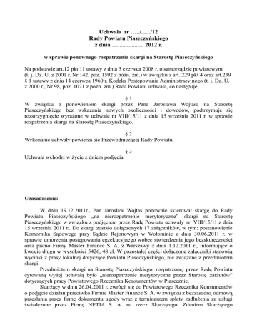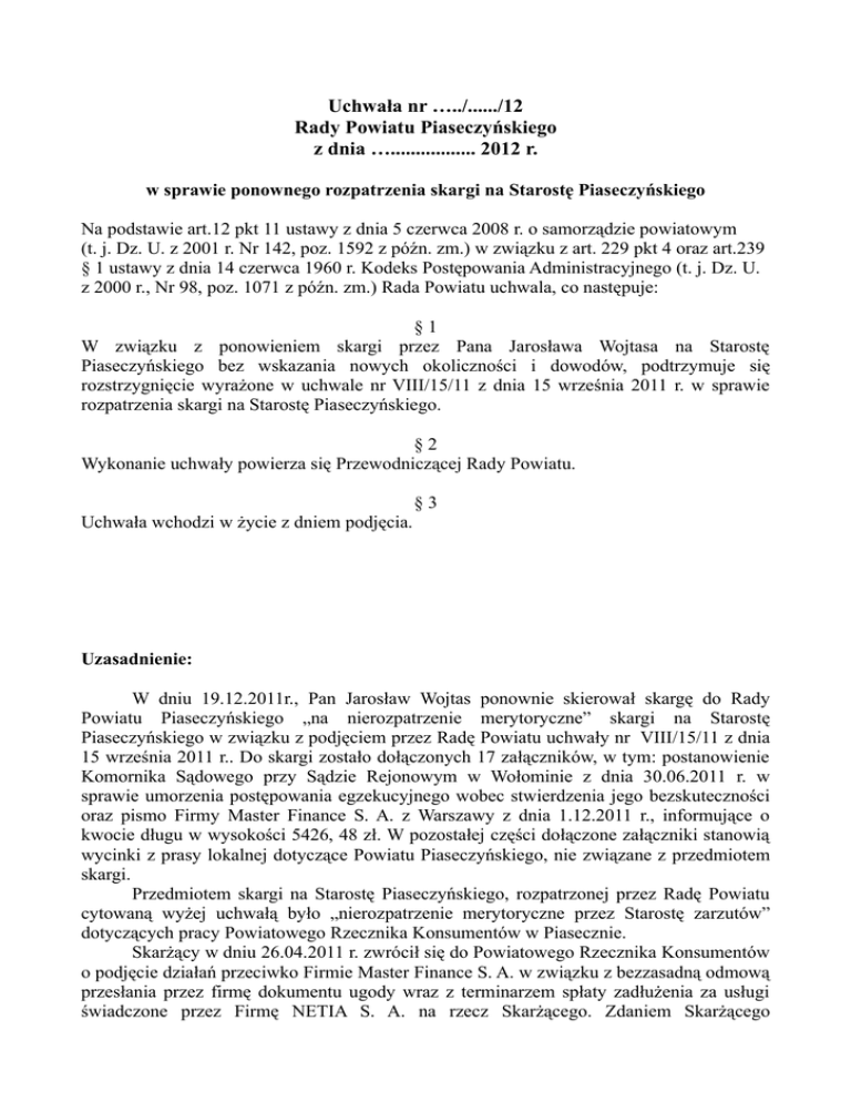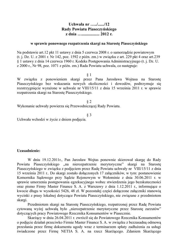Uchwała nr …../....../12 Rady Powiatu Piaseczyńskiego z dnia …................. 2012 r. w sprawie ponownego rozpatrzenia skargi na Starostę Piaseczyńskiego Na podstawie art.12 pkt 11 ustawy z dnia 5 czerwca 2008 r. o samorządzie powiatowym (t. j. Dz. U. z 2001 r. Nr 142, poz. 1592 z późn. zm.) w związku z art. 229 pkt 4 oraz art.239 § 1 ustawy z dnia 14 czerwca 1960 r. Kodeks Postępowania Administracyjnego (t. j. Dz. U. z 2000 r., Nr 98, poz. 1071 z późn. zm.) Rada Powiatu uchwala, co następuje: §1 W związku z ponowieniem skargi przez Pana Jarosława Wojtasa na Starostę Piaseczyńskiego bez wskazania nowych okoliczności i dowodów, podtrzymuje się rozstrzygnięcie wyrażone w uchwale nr VIII/15/11 z dnia 15 września 2011 r. w sprawie rozpatrzenia skargi na Starostę Piaseczyńskiego. §2 Wykonanie uchwały powierza się Przewodniczącej Rady Powiatu. §3 Uchwała wchodzi w życie z dniem podjęcia. Uzasadnienie: W dniu 19.12.2011r., Pan Jarosław Wojtas ponownie skierował skargę do Rady Powiatu Piaseczyńskiego „na nierozpatrzenie merytoryczne” skargi na Starostę Piaseczyńskiego w związku z podjęciem przez Radę Powiatu uchwały nr VIII/15/11 z dnia 15 września 2011 r.. Do skargi zostało dołączonych 17 załączników, w tym: postanowienie Komornika Sądowego przy Sądzie Rejonowym w Wołominie z dnia 30.06.2011 r. w sprawie umorzenia postępowania egzekucyjnego wobec stwierdzenia jego bezskuteczności oraz pismo Firmy Master Finance S. A. z Warszawy z dnia 1.12.2011 r., informujące o kwocie długu w wysokości 5426, 48 zł. W pozostałej części dołączone załączniki stanowią wycinki z prasy lokalnej dotyczące Powiatu Piaseczyńskiego, nie związane z przedmiotem skargi. Przedmiotem skargi na Starostę Piaseczyńskiego, rozpatrzonej przez Radę Powiatu cytowaną wyżej uchwałą było „nierozpatrzenie merytoryczne przez Starostę zarzutów” dotyczących pracy Powiatowego Rzecznika Konsumentów w Piasecznie. Skarżący w dniu 26.04.2011 r. zwrócił się do Powiatowego Rzecznika Konsumentów o podjęcie działań przeciwko Firmie Master Finance S. A. w związku z bezzasadną odmową przesłania przez firmę dokumentu ugody wraz z terminarzem spłaty zadłużenia za usługi świadczone przez Firmę NETIA S. A. na rzecz Skarżącego. Zdaniem Skarżącego postępowanie takie uniemożliwiło mu spłatę zadłużenia. W dniu 16.05.2011 r. Powiatowy Rzecznik Konsumentów w Piasecznie wystąpił do Przedsiębiorcy o udzielenie wyjaśnień w tej sprawie. Pismem z dnia 24.05.2011 r., Firma Master Finance poinformowała Rzecznika, że w stosunku do Pana J. Wojtasa został wydany w dniu 10.05.2003 r., przez Sąd Rejonowy dla Warszawy Mokotowa Wydział II Cywilny, nakaz zapłaty zasądzający spłatę wierzytelności na rzecz Firmy Netia S. A. (sygn. Akt II N c 1702/03) oraz, że na mocy umowy sprzedaży z dnia 17.12.2009 r., Firma Master Finance nabyła tą wierzytelność, o czym powiadomiła Skarżącego w dniu 22.12.2009 r., wzywając go jednocześnie do spłaty zadłużenia. Skarżący pismem z dnia 20.01.2010 r., . zaproponował Firmie „długoterminową spłatę powstałego zadłużenia” uzasadniając to trudna sytuacja finansową. Przedsiębiorca wyraził zgodę na spłatę zadłużenia w ratach miesięcznych w wysokości 150 zł oraz wstrzymanie naliczania odsetek ustawowych na określony dzień. Skarżący pismem z dnia 16.02.2010 r., zawnioskował o zmniejszenie kwoty miesięcznej raty do 100 zł, anulowanie kosztów sadowych i egzekucyjnych, nienaliczanie odsetek od dnia ugody oraz przedstawienie ugody wraz terminarzem spłaty zadłużenia. W odpowiedzi z dnia 1.03.2010 r., Przedsiębiorca wyraził zgodę na obniżenie miesięcznej raty płatności zadłużenia i nienaliczanie odsetek w określonej dacie, natomiast nie zgodził się na umorzenie pozostałych kosztów. Spółka poinformowała Skarżącego również, że spłata długu powinna nastąpić od marca 2010 r. Skarżący nie zapłacił żadnej raty zadłużenia. Powiatowy Rzecznik Konsumentów po zbadaniu całości sprawy uznał żądanie Pana J. Wojtasa za bezzasadne, o czym powiadomił Skarżącego w dniu 7.06.2011 r. W następstwie powyższego Skarżący wniósł skargę na Powiatowego Rzecznika Konsumentów w Piasecznie do Starosty Piaseczyńskiego. Starosta Piaseczyński po zbadaniu treści wniesionej skargi uznał ją za bezzasadną, o czym powiadomił Skarżącego pismem z dnia 28.06.2011 r., znak OOK.1510.9.2011. Rozpatrzenie skargi przez Starostę Piaseczyńskiego nastąpiło w terminie i na zasadach określonych w KPA (art. 237 ust. 1 i 2 oraz art. 238 ust. 1) . W następstwie powyższego Pan J. Wojtas wystąpił do Rady Powiatu ze skargę na Starostę Piaseczyńskiego. Rada Powiatu wskazaną wyżej uchwałą uznała treść skargi za bezpodstawną, o czym powiadomiła Skarżącego pismem z dnia 19.09.2011 r., znak BRP.0007.53.2011. Do pisma dołączono treść uchwały Rady Powiatu w tej sprawie wraz z uzasadnieniem. Korespondencją z dnia 19.12.2011r., Pan Jarosław Wojtas ponownie skierował skargę do Rady Powiatu Piaseczyńskiego „na nierozpatrzenie merytoryczne” przez ten organ skargi na Starostę Piaseczyńskiego. Dołączone do skargi dwa dodatkowe załączniki postanowienie Komornika Sądowego przy Sądzie Rejonowym w Wołominie z dnia 30.06.2011 r. w sprawie umorzenia postępowania egzekucyjnego wobec stwierdzenia jego bezskuteczności oraz pismo Firmy Master Finance S. A. z Warszawy z dnia 1.12.2011 r., informujące o kwocie długu w wysokości 5426, 48 zł - nie wniosły nic nowego do sprawy. W tej sytuacji zastosowanie ma art. 239 § 1 Kpa, który stanowi, że w przypadku, gdy skarga w wyniku rozpatrzenia została uznana za bezzasadną i jej bezzasadność wykazano w odpowiedzi na skargę, a skarżący ponowił skargę bez wskazywania nowych okoliczności – organ właściwy do jej rozpatrzenia może podtrzymać swoje poprzednie stanowisko z odpowiedni